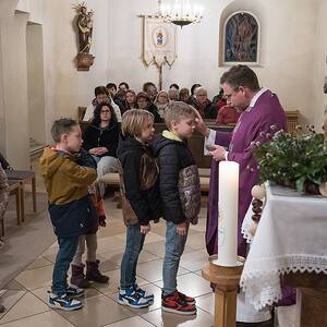 Pfarrmoderator Jahns feierte am 4.3.2025 den Aschermittwoch, den Beginn der 40-tägigen Bußzeit, in einer vollen Kirche. Viele Gläubige waren gekommen, um das Aschenkreuz zu empfangen. Die Asche für die Spendung des Aschenkreuzes wird aus den verbrannten Palmzweigen des Vorjahres bereitet und vom Priester gesegnet. Pfarrmoderator Jahns hat dieses Jahr mit den Volksschulkindern diese Asche gemacht.