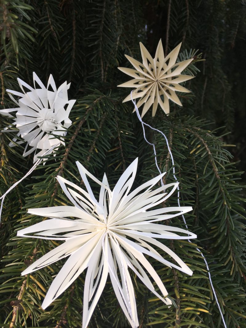 Unter der Leitung von Eveline Scheiber und Christa Frauenschiel versuchten sich die Frauen in der alten Technik der Zick-Zack Faltung und Gestaltung von Solino-Sternen. Mit einer spitzen Schere wurden verschieden Muster ins Papier geschnitten um am Ende stilvolle Sterne entstehen zu lassen. Diese Aufgabe war gar nicht so einfach, es sind dennoch in mühevoller Arbeit und mit viel Engagement wunderschöne Sterne entstanden.