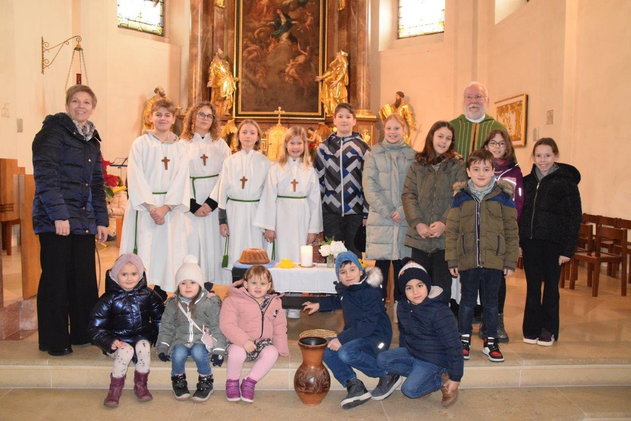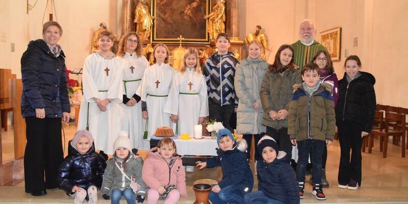 Die „Hochzeit von Kana“ war das Thema des Familiengottesdienstes am 19.1.25. Gemeinsam wurde mit Hilfe einiger Kinder ein festlicher Tisch gedeckt. Bei der Hochzeit von Kana verwandelte Jesus Wasser in Wein. Er half mit, dass dieses Fest nicht so schnell zu Ende ging. Jesus verteilte Freude unter den Menschen und half mit guten Taten. Auch im Gottesdienst verwandelten wir gemeinsam Wasser in Wein. Der Wein steht symbolisch für die Freude und die Liebe, die Jesus uns schenkt.