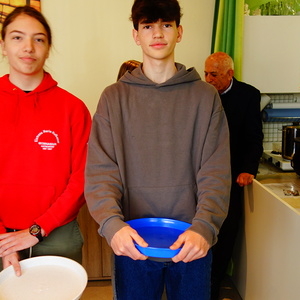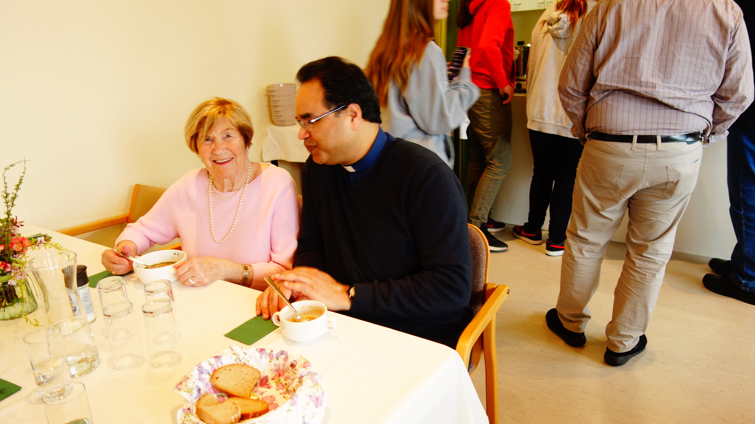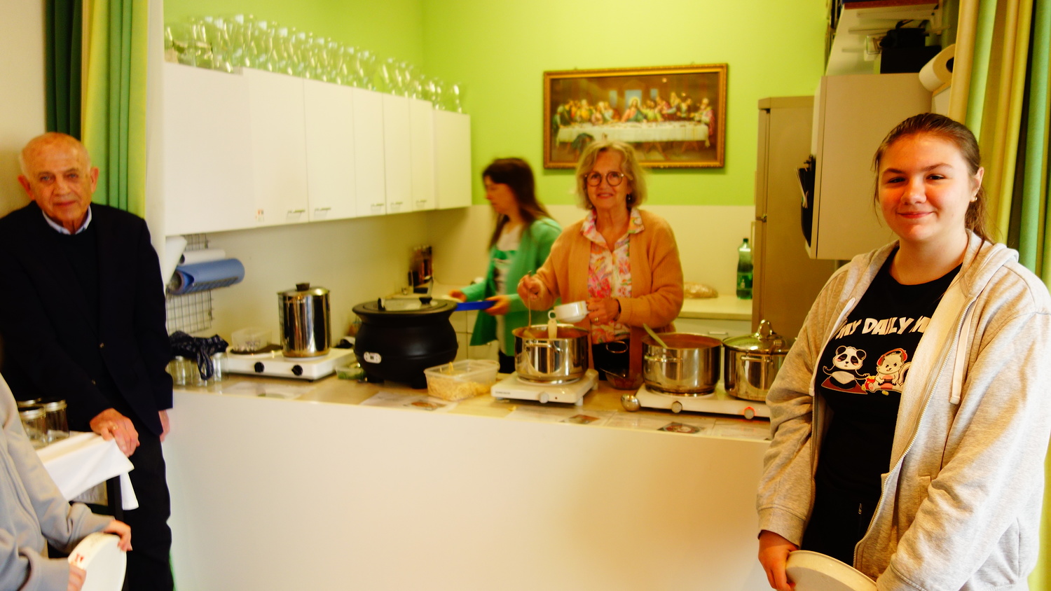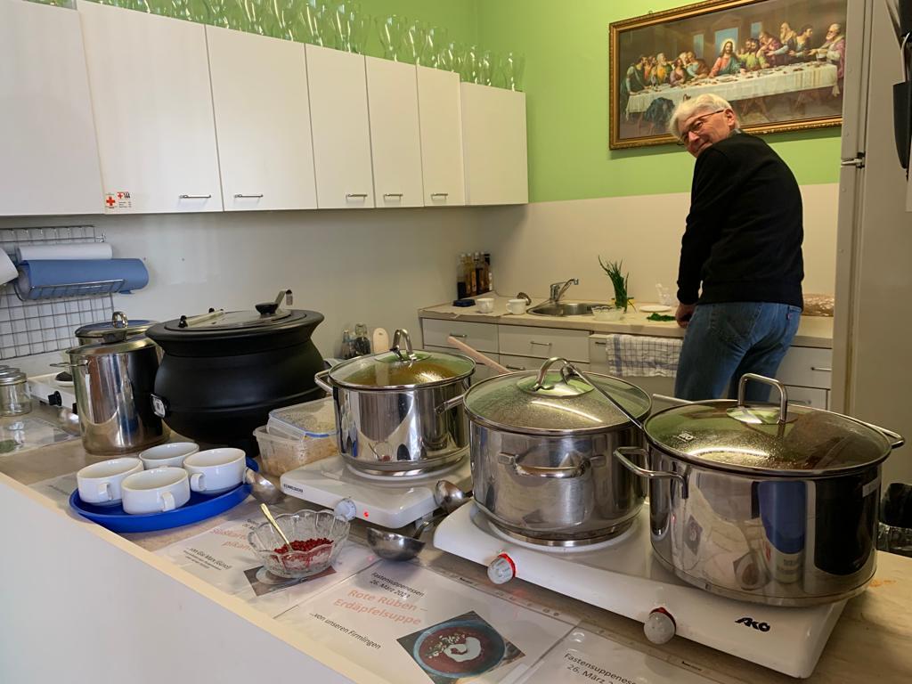 Den Gästen wurden delikate Suppen aus Sauerbrunner Küchen präsentiert. Andi Grieszler kochte eine sehr gute Fischsuppe, Elfriede Gruber eine schmackhafte Bärlauchcremesuppe, Anna Puntigam eine Rindsuppe mit Leberknöderl oder Frittaten als Einlagen,  Gisi Marx (Günzl) eine pikante Süßkartoffelsuppe. Die Firmlinge von Bad Sauerbrunn kochten eine Rote Rüben - Erdäpfelsuppe. Wie überhaupt sich die Firmlinge ganz toll eingebracht haben, denn eine Gruppe stellte sich freiwillig zur Verfügung, das Service zu übernehmen.