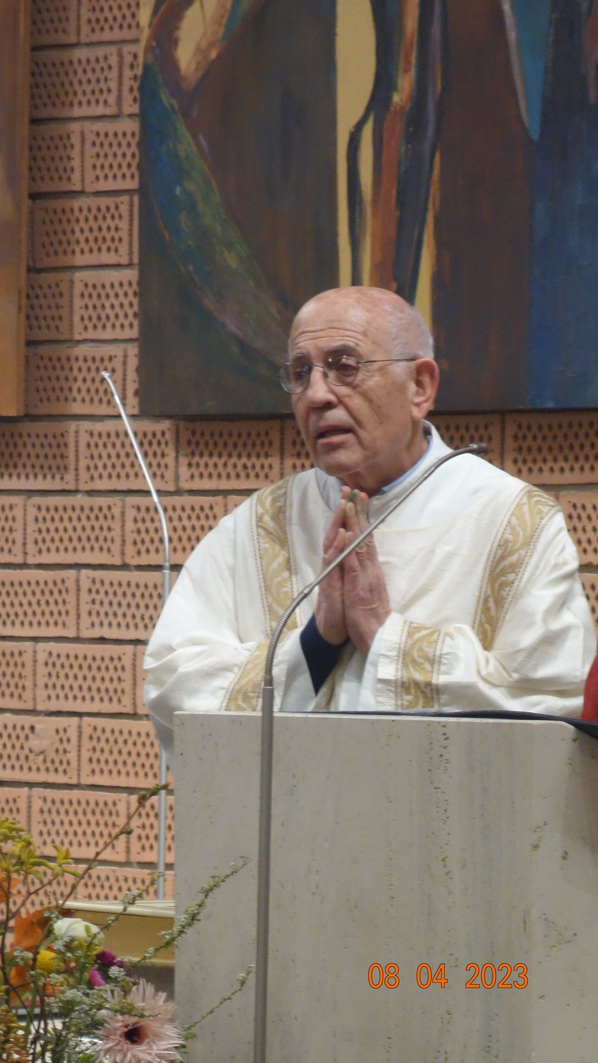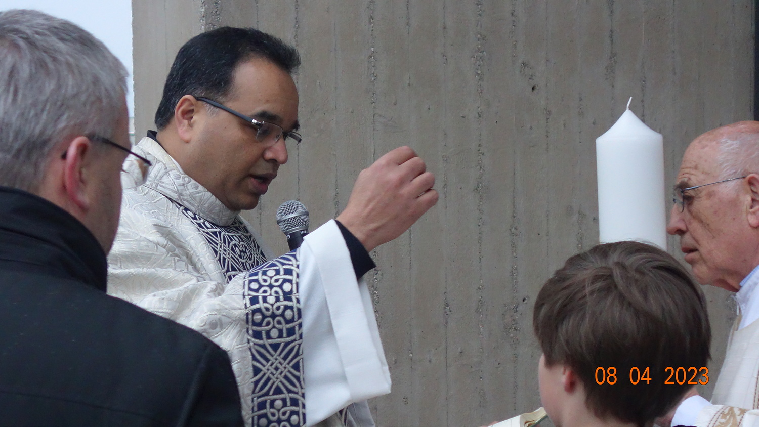 Schlussendlich wurden noch die mitgebrachten Speisen gesegnet. Am Kirchausgang verteilten Pater Kuruvila und Diakon Dr. Peter Zotti die Blumen von der Kreuzverehrung vom Freitag und wünschten jedem Gläubigen bei Verlassen der Kirche:"Frohe Ostern!"