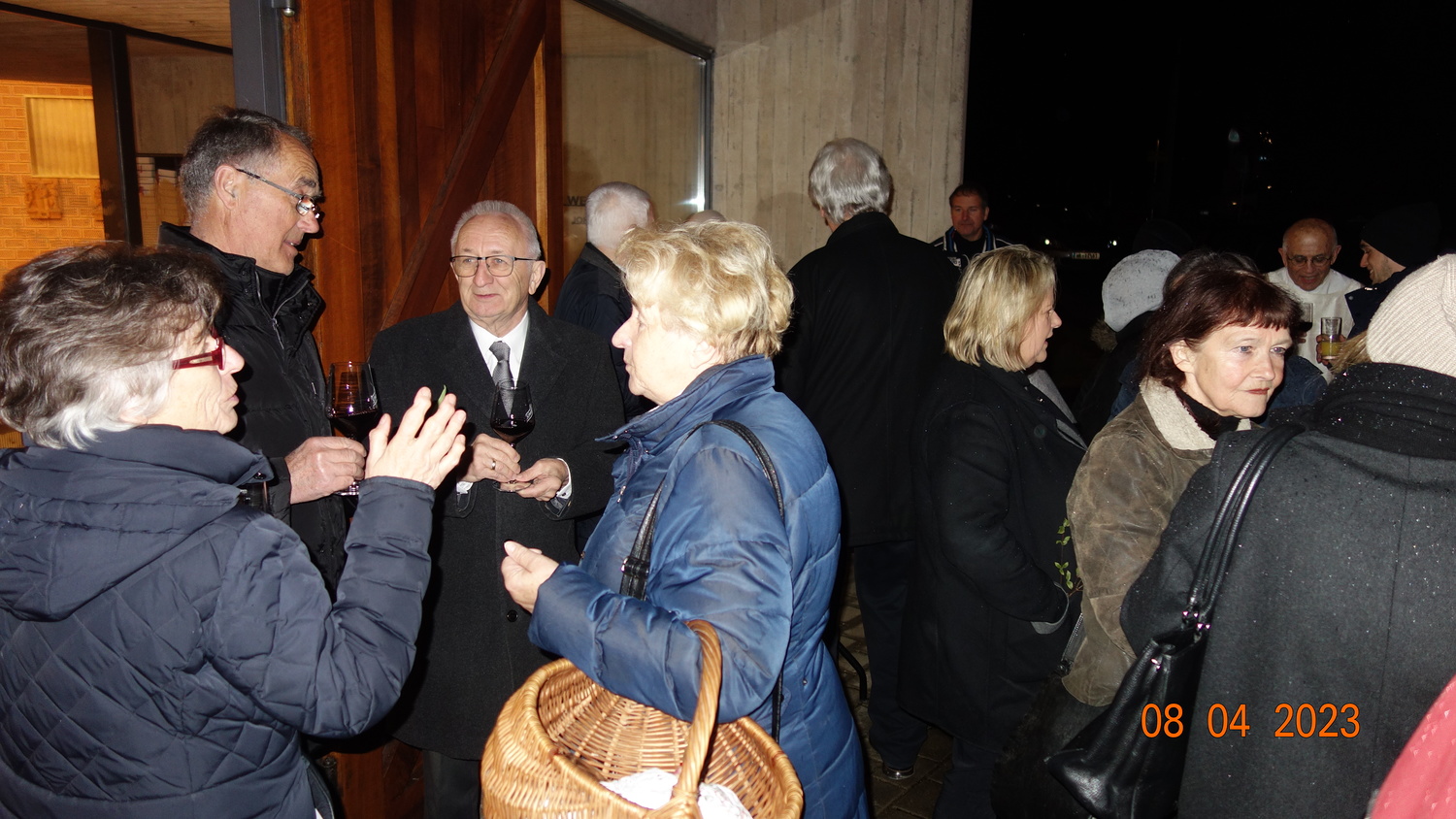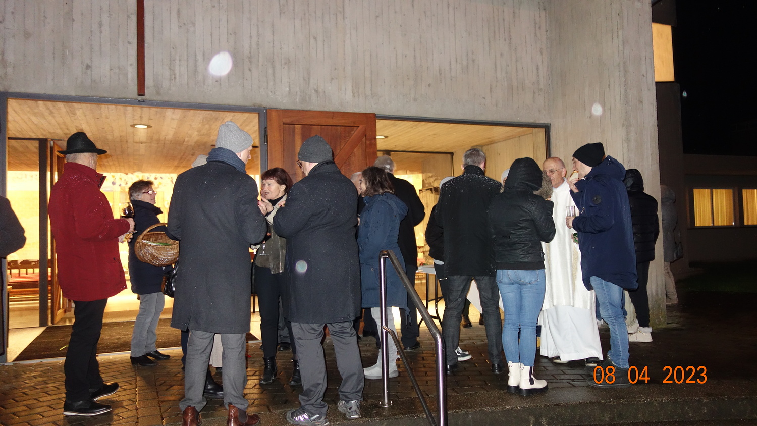 Das wünschten sich dann auch die Gläubigen gegenseitig auf der Agape, zu der der Pfarrgemeinderat geladen hatte. Es gab unter anderem Wein, Brot, Osterstriezel und es wurden Ostereier verteilt. Das verbesserungsfähige Wetter, es regnete nämlich eher stark, tat der guten Stimmung die während der Agape unter den Gläubigen herrschte, keinen Abbruch.