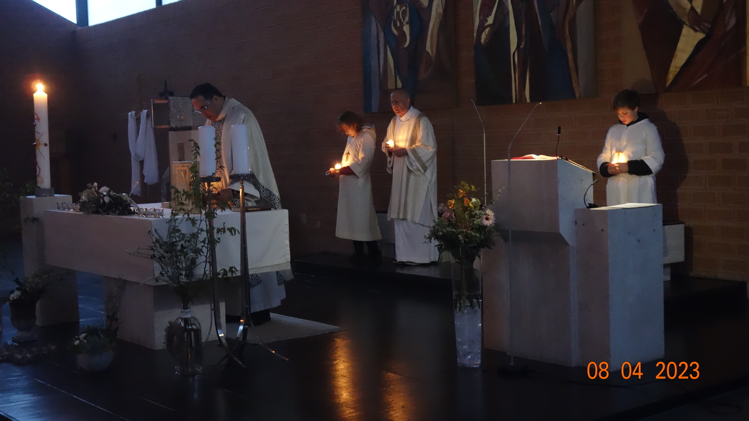 Es war schon sehr stimmungsvoll, als mit dem Gesang "Lumen Christi" (Christus das Licht), der Einzug in die total dunkle Kirche erfolgte. Als nächstes wurde das Licht der Osterkerze an die Gläubigen weitergegeben, die daran ihre mitgebrachten Kerzen entzündeten.