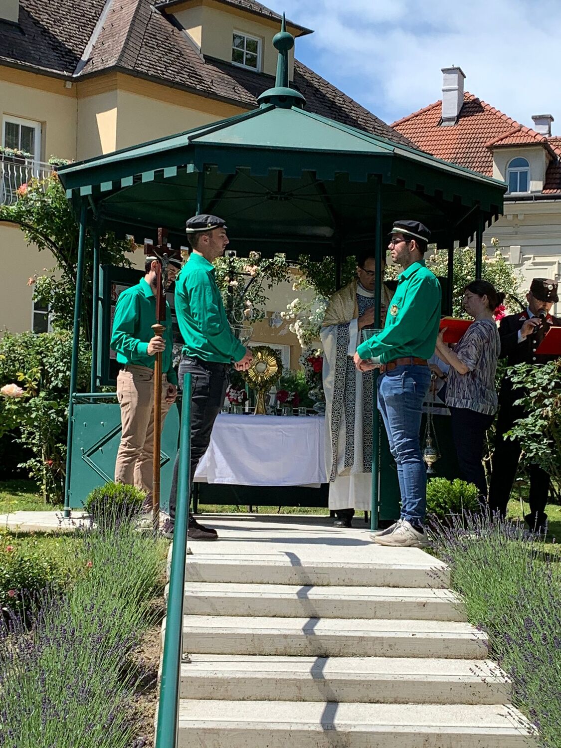 Dankenswerterweise hatten sich die Vereine des Ortes an der Prozession beteiligt. So sorgte die Freiwillige Feuerwehr Bad Sauerbrunn für die Spitze und Verkehrsregelung und der 1.unpolitische Burschenverein trug den Himmel, Kerzen und dergleichen.