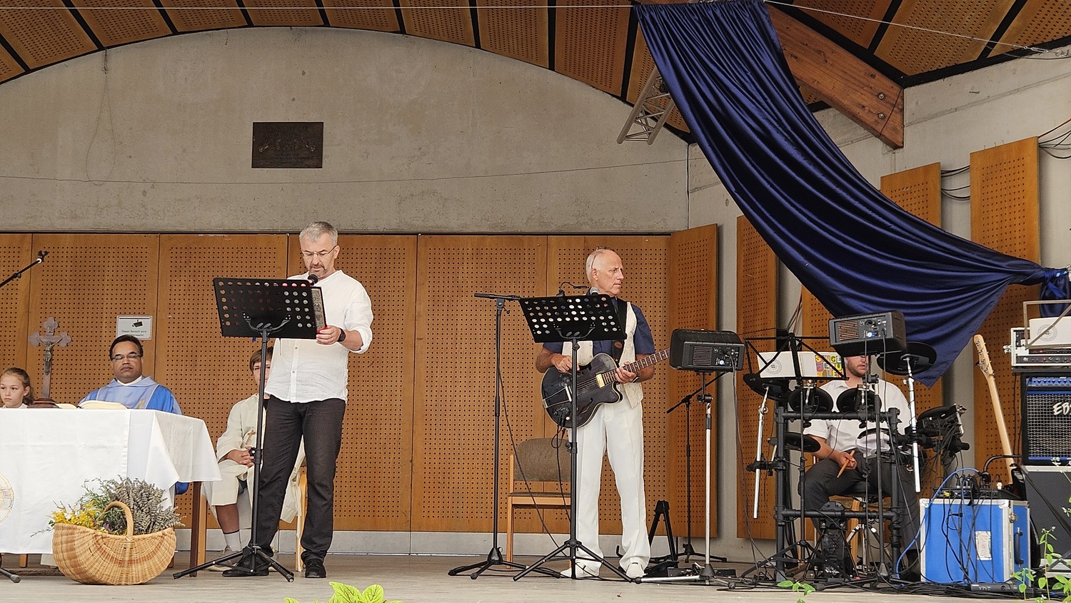Pfarrfest: Pater Kuruvila, Pfarrkuratorin Gerti Ankerl und Hubert's Band