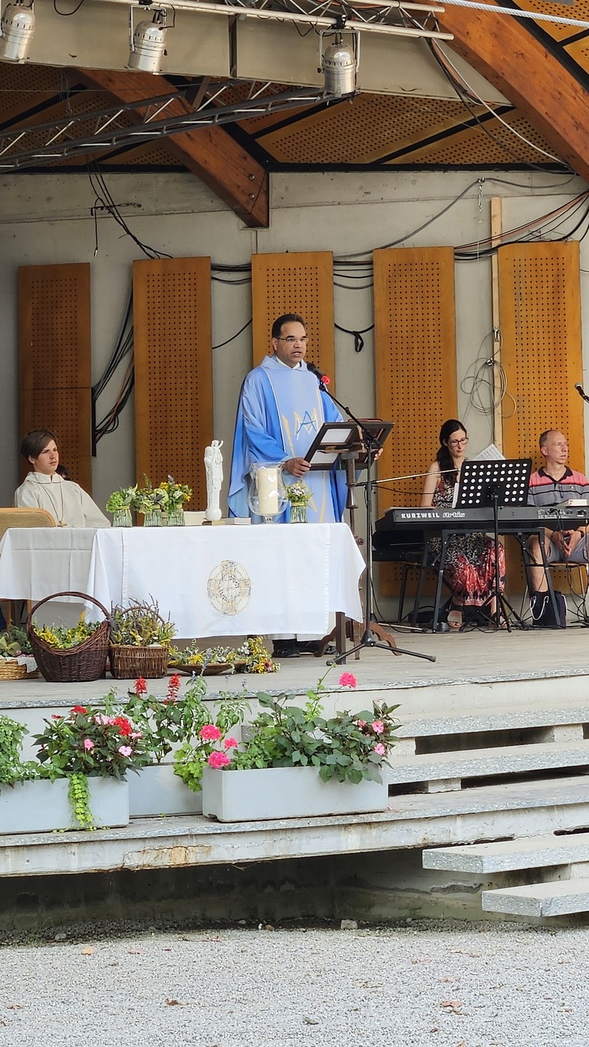 Das Patrozinium - Fest zu Ehren der Schutzpatronin der Pfarre , der Hl. Maria - feierte die Pfarre Bad Sauerbrunn am Festtag Mariä Himmelfahrt, dem 15. August 2025 mit einer Hl. Messe im Kurpark. Erstmals wurde diese Heilige Messe erst am Abend um 17 Uhr gefeiert. Pater Kuruvila zelebrierte die Hl. Messe und wies auf die besondere Bedeutung dieser Feier hin und betreffend das "Fest der Begegnung" auf die Wichtigkeit, in der Pfarre gemeinsam zu feiern. Die Hl. Messe unterstützten als Lektoren Pfarrgemeinderätin Kathi Graner und Pfarrgemeinderat Hermann Dittrich, als Ministranten Alexander Hanner und Johanna Lang. Die musikalische Unterstützung wurde durch Katja Visi-Kalmár und Sándor Kalmár wie immer ganz ausgezeichnet gestaltet. Viele Pfarrmitglieder und Gäste waren gekommen um gemeinsam die Hl. Messe zu feiern.