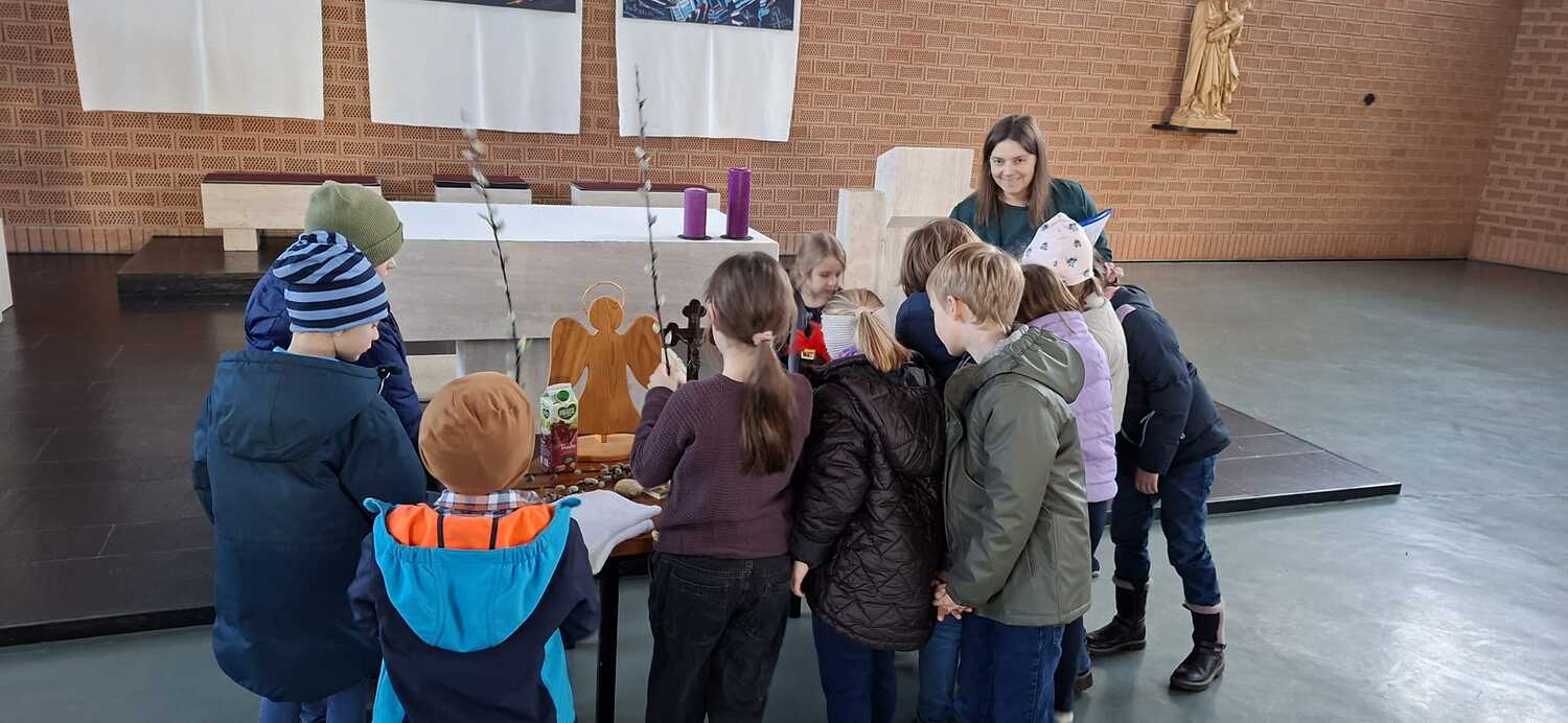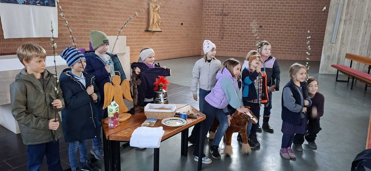 Utensilien, die zum Mitmachen anregten wurden den Kindern präsentiert und damit wurden auch einzelne Szenen aus dem Kreuzweg erarbeitet. Die Kinder engagierten sich sehr und waren auch sehr interessiert dabei. Die Kinder hatten natürlich auch Spass dabei und erlebten einen wichtigen Inhalt der Fastenzeit und der Vorbereitung auf das Osterfest.