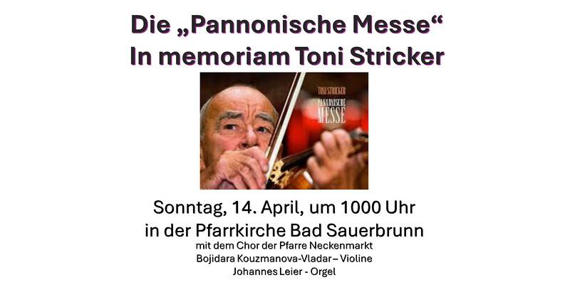 Sie sprach mit dem Chor und legte mit den Verantwortlichen den Termin fest. Auch mit der Gemeinde Bad Sauerbrunn mit Freunden und Weggefährten von Toni Stricker, knüpfte sie so schnell als möglich Kontakt. Alle zeigten sich von der Idee begeistert und es entwickelte sich eine tolle Veranstaltung auf die sich die Pfarrgemeinde, die politische Gemeinde Bad Sauerbrunn, Freunde, Weggefährten und Gäste, die die pannonische Musik von Toni Stricker lieben, sehr freuen.