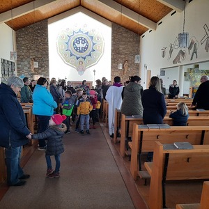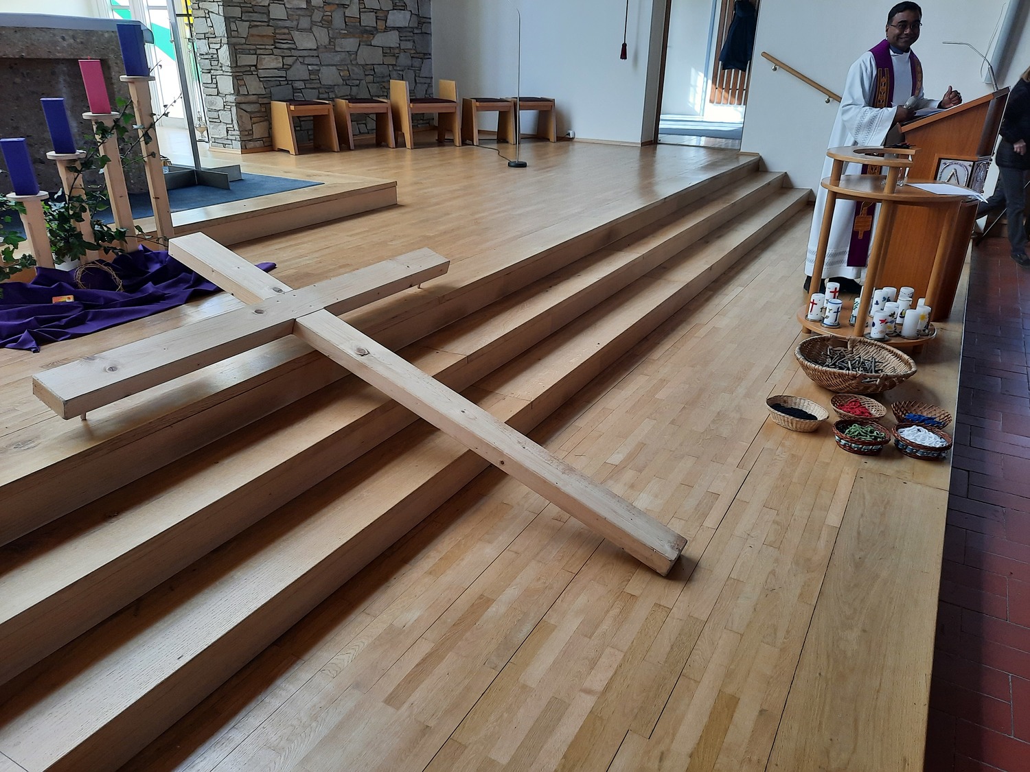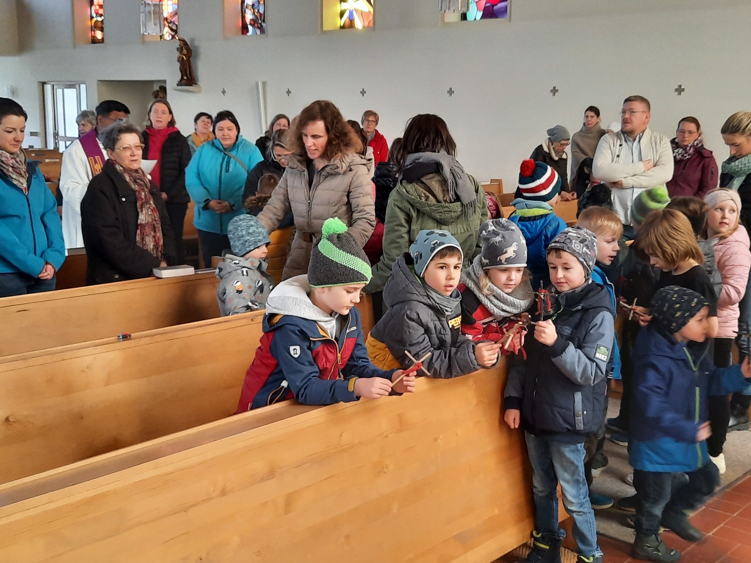 Bevor ausgewählte Stationen des Kreuzweges betrachtet und von Pfarrer Jomon erklärt wurden, durften einige Kinder versuchen ein großes Holzkreuz zu heben, um festzustellen wie schwer Jesus zu tragen hatte. Anschließend bekamen die Kinder einfache gebastelte Kreuze ausgeteilt, die dann bei den Stationen mit Bändern in den Farben Rot für Blut, Blau für die Tränen, Grün für die Hoffnung und Schwarz für den Tod von ihnen geschmückt wurden. Ein weißes Band durften die Kinder mit nach Hause nehmen um es zu Ostern, als Symbol der Auferstehung hinzuzufügen.