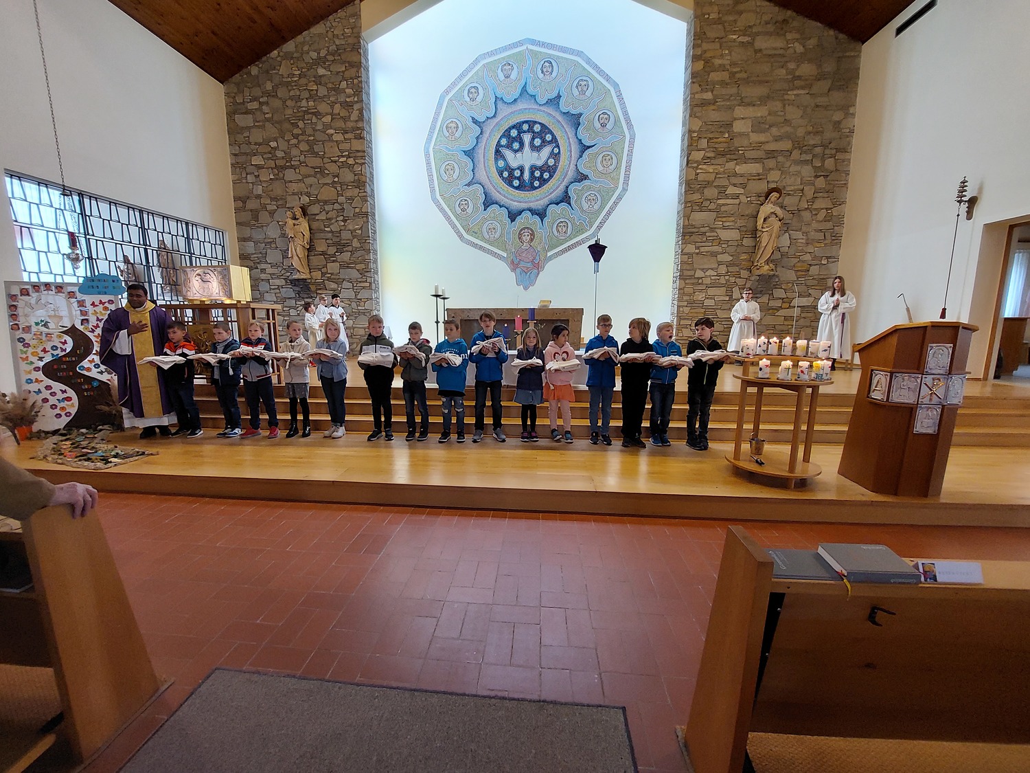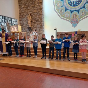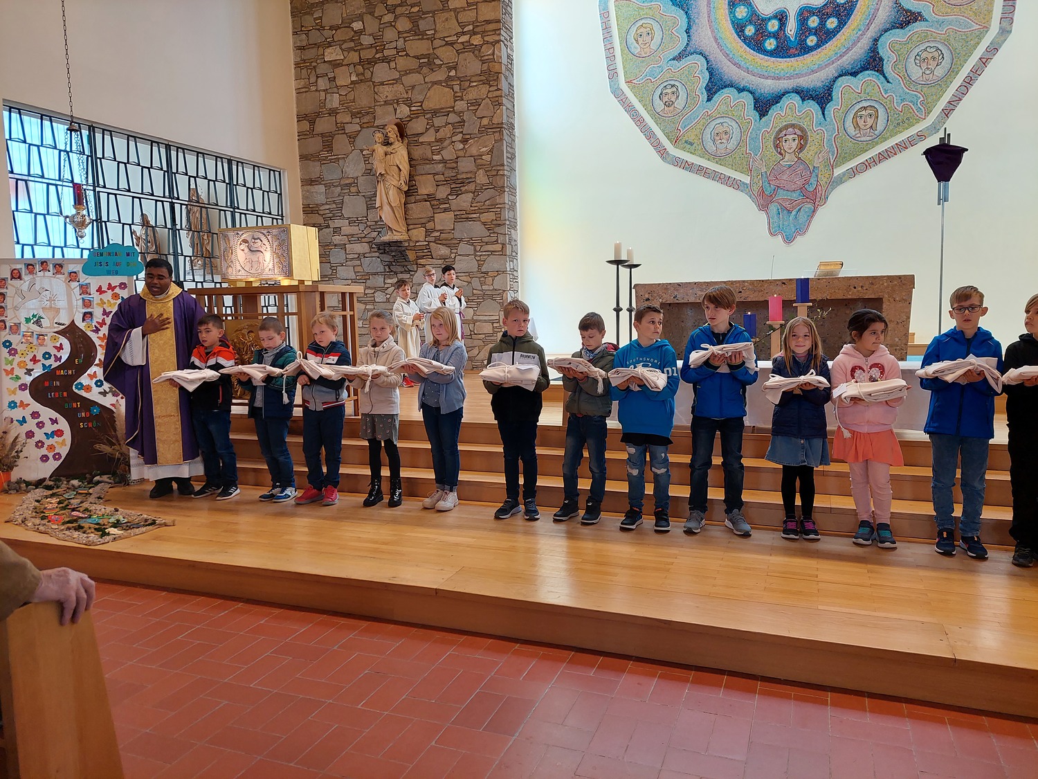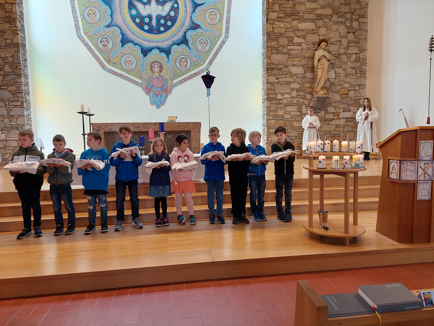 Am 5. Fastensonntag wurden im Rahmen einer feierlichen Messe, nach der Segnung durch P. Jomon, die weißen Kutten an die Erstkommunionkinder übergeben.