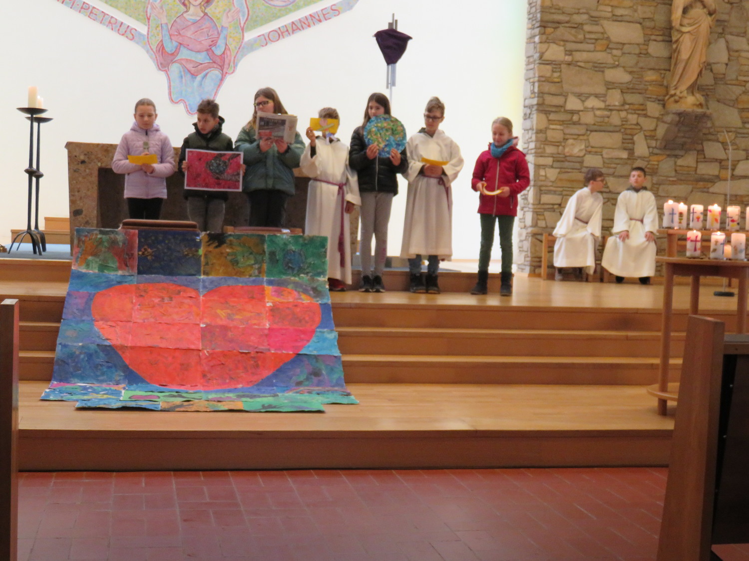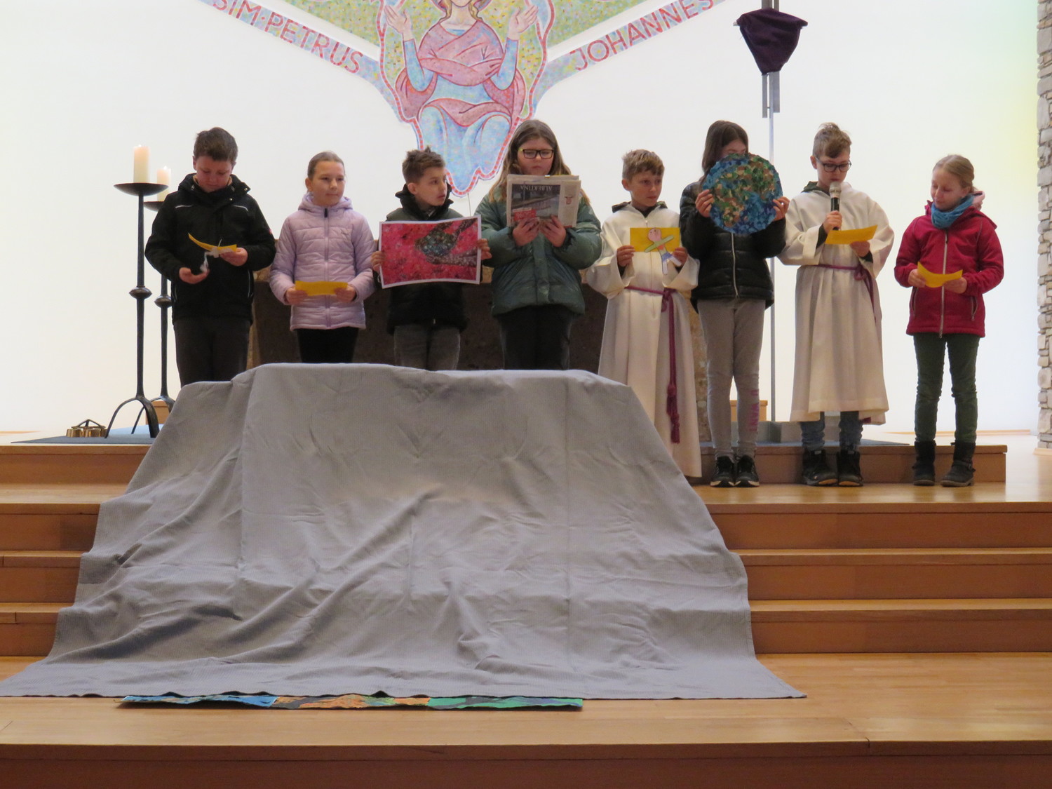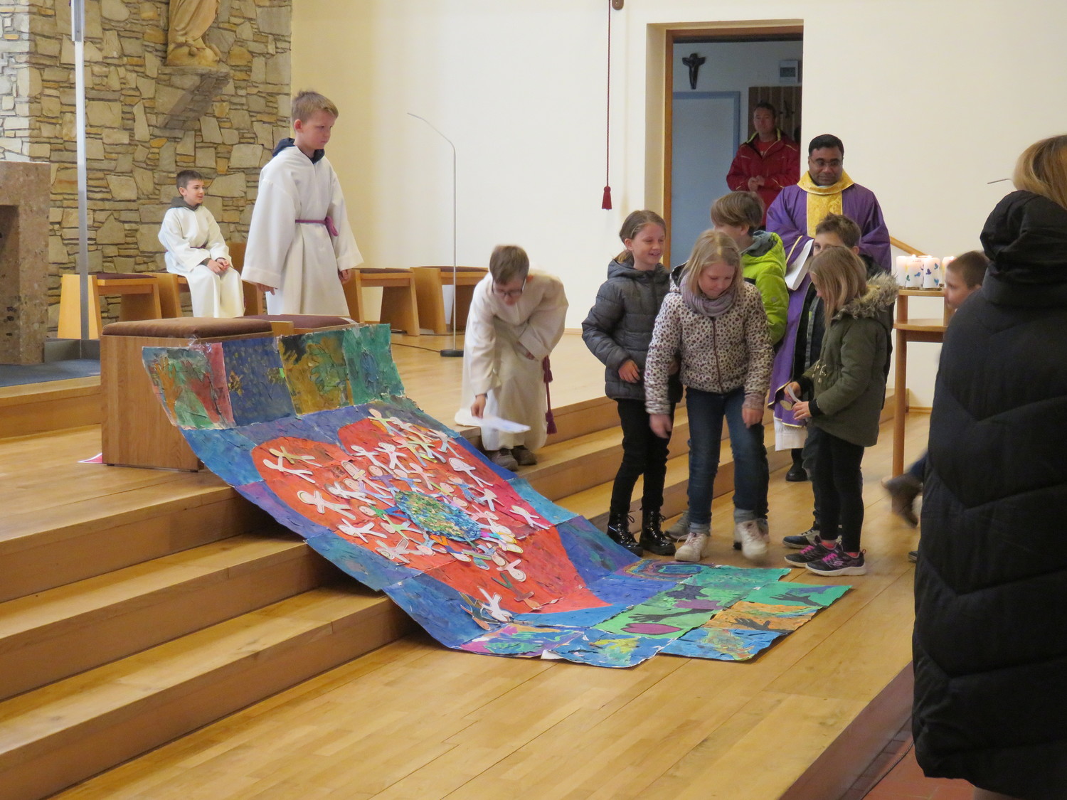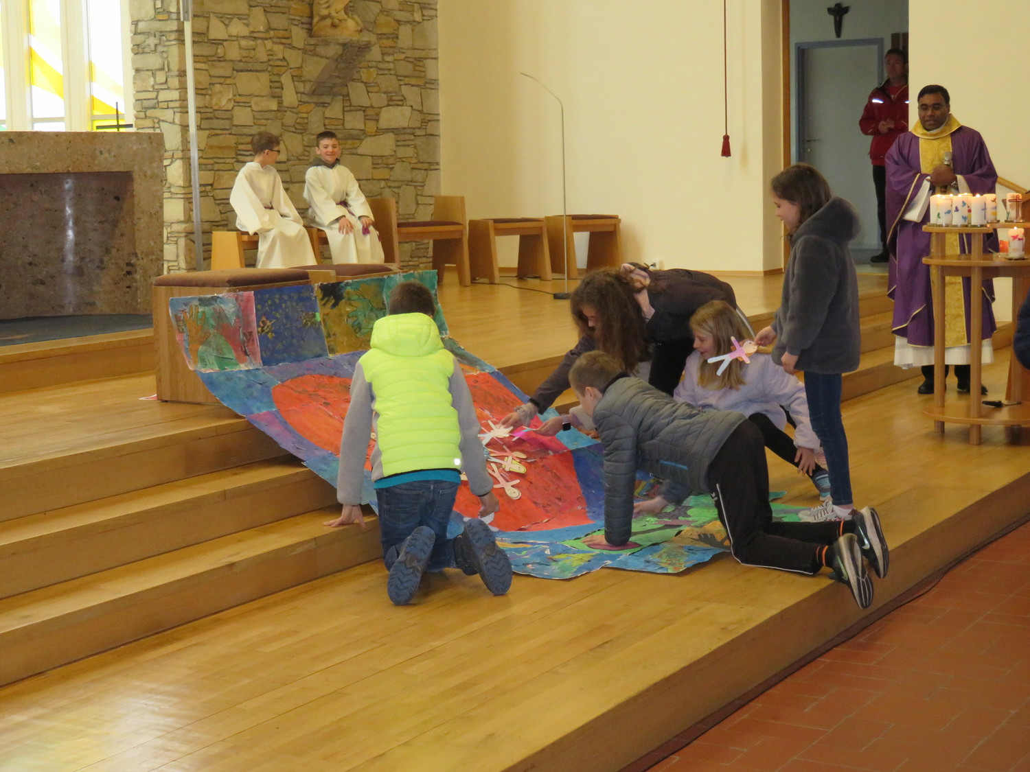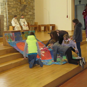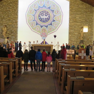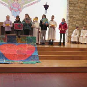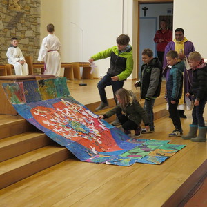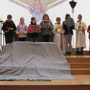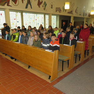 Vor Beginn der Osterferien feierten die katholischen Schüler aller Klassen gemeinsam mit P. Jomon, den Lehrkräften und einigen Eltern und Großeltern, einen von Religionslehrerin Rebecca Amring Genave gemeinsam mit den Kindern gestalteten Gottesdienst.