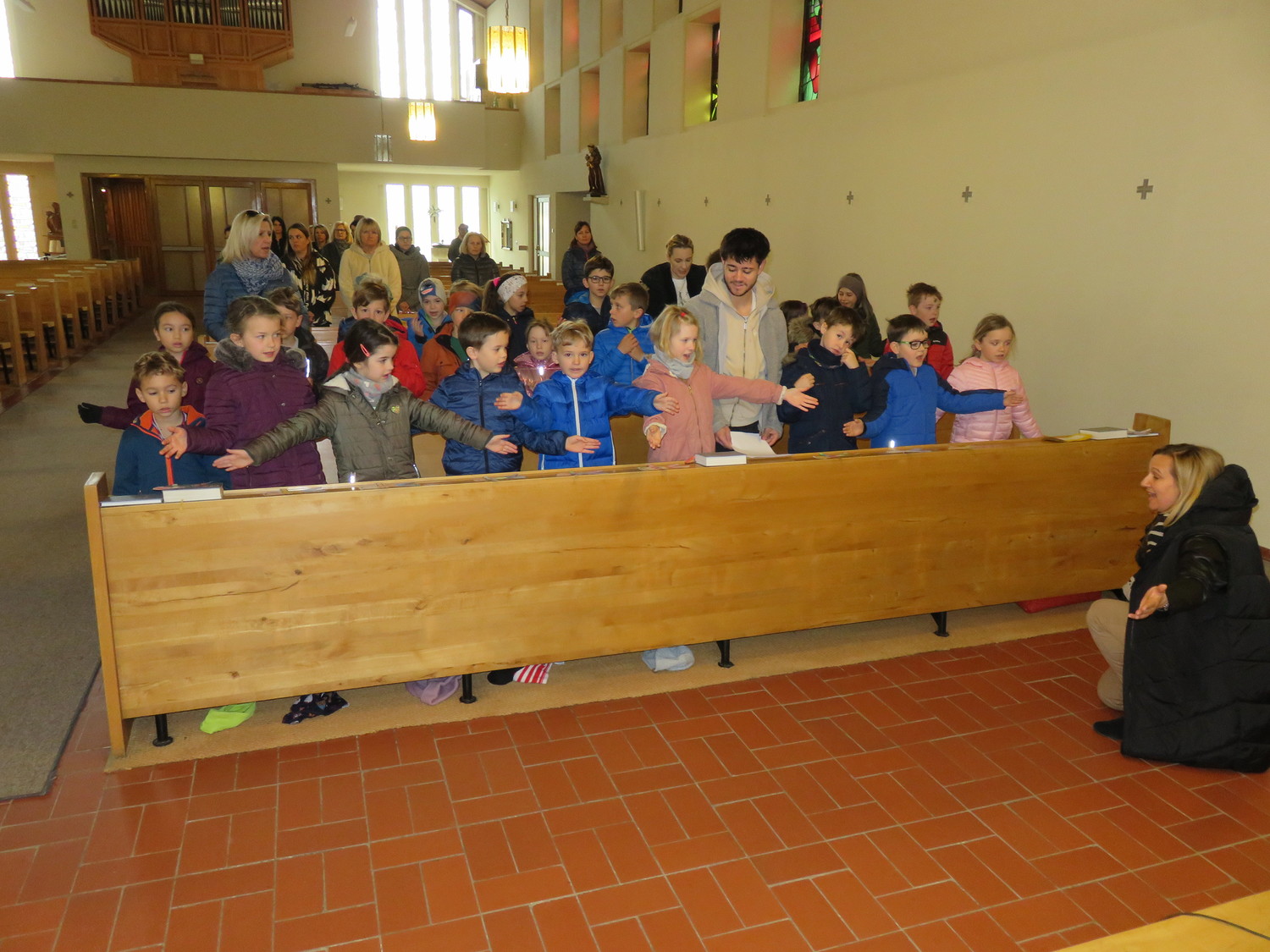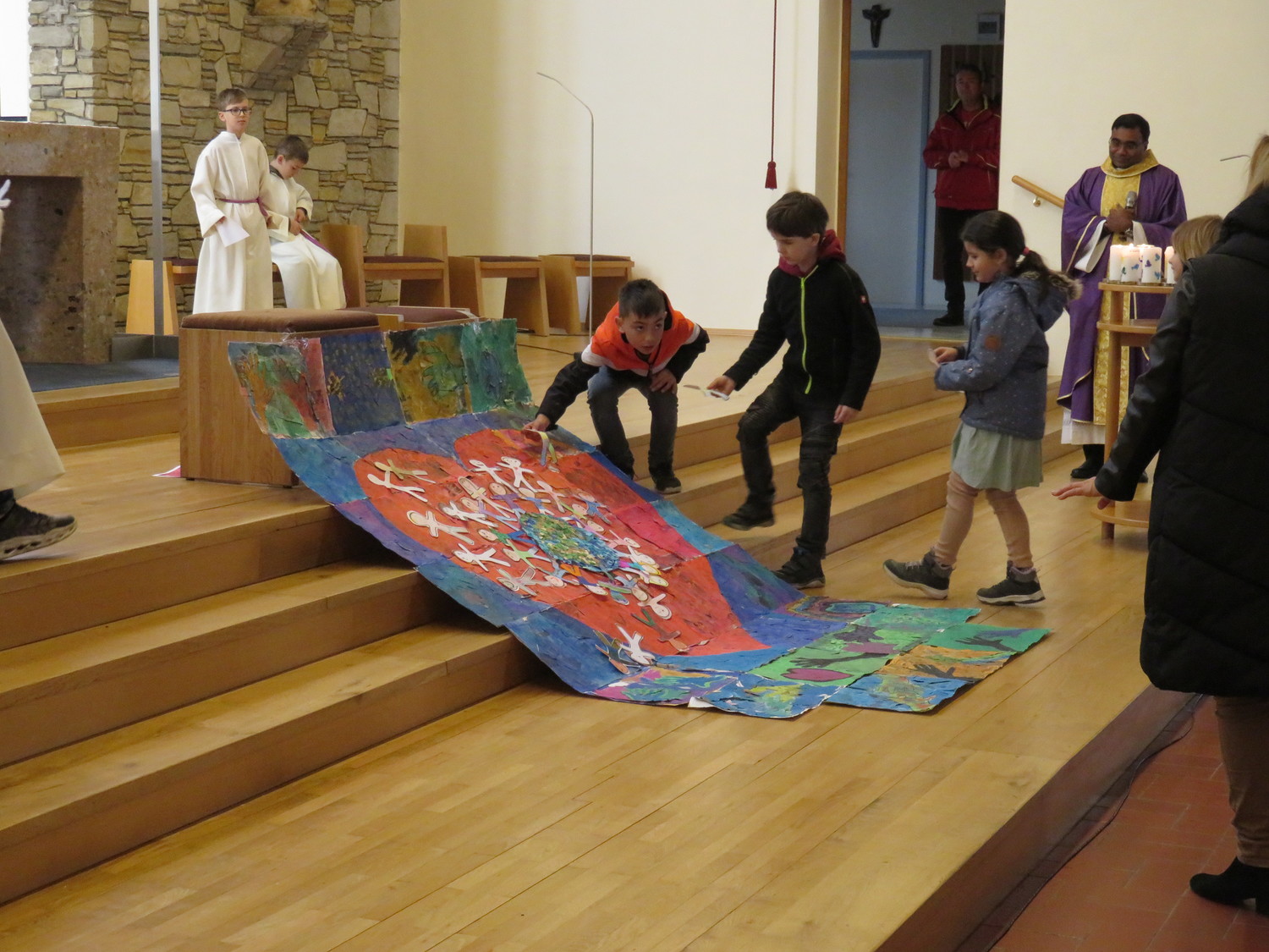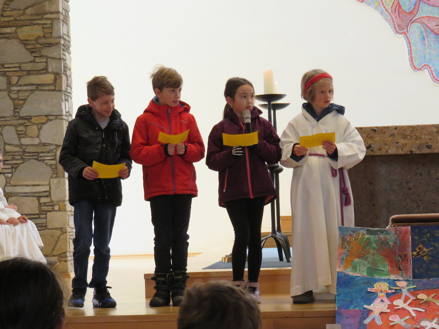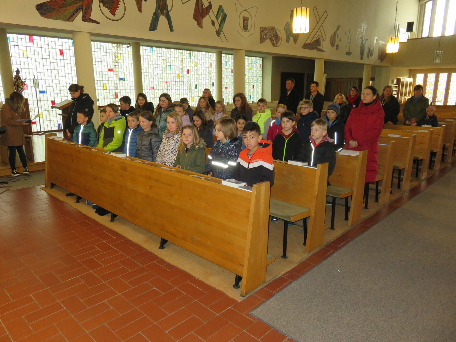 Vor Beginn der Osterferien feierten die katholischen Schüler aller Klassen gemeinsam mit P. Jomon, den Lehrkräften und einigen Eltern und Großeltern, einen von Religionslehrerin Rebecca Amring Genave gemeinsam mit den Kindern gestalteten Gottesdienst.