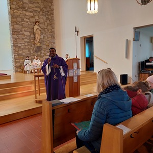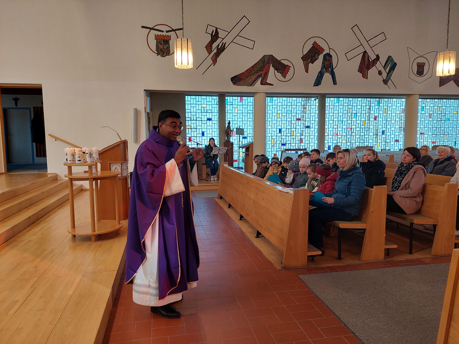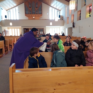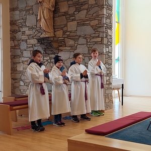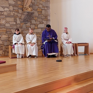 Die Schülerinnen und Schüler der Volksschule feierten gemeinsam mit P. Jomon, dem Lehrkörper und einigen Eltern sowie Großeltern einen feierlichen Ostergottesdienst.