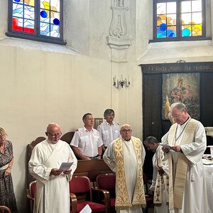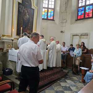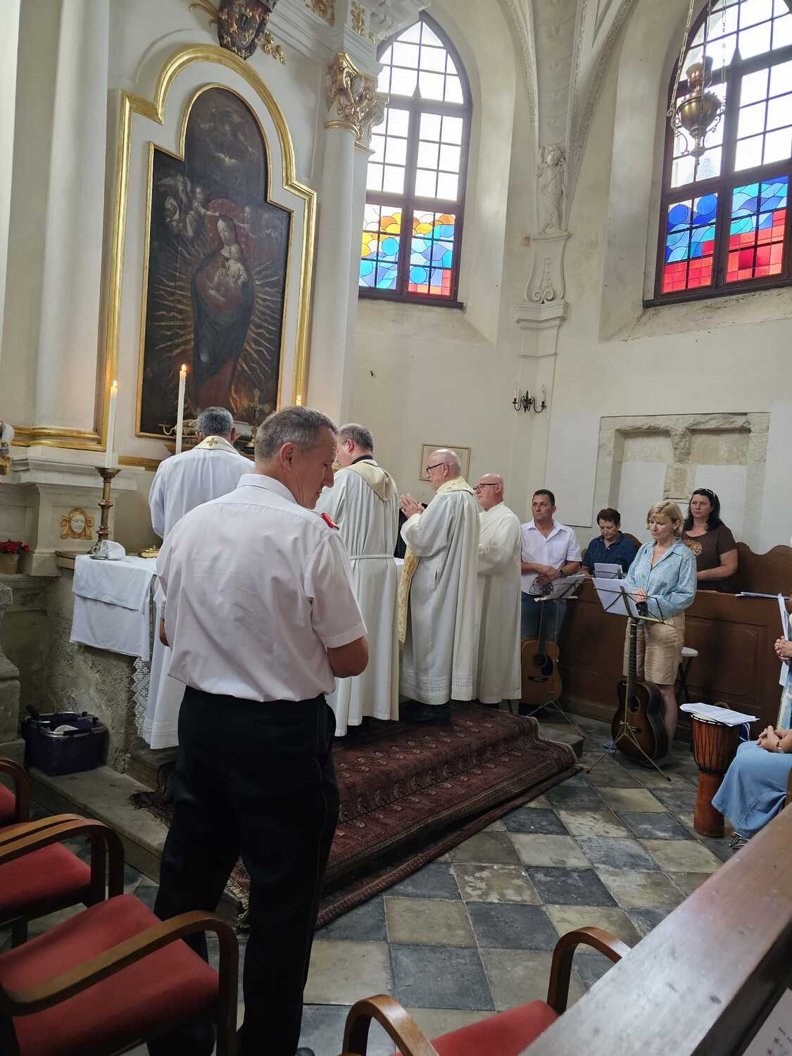 Am Donnerstag, dem 11. Juli 2024, um 16.00 Uhr, feierte der Pfarrverband Kobersdorf-Weppersdorf-Lackenbach in der Schlosskapelle Kobersdorf einen festlichen Gottesdienst mit dem Propst von Stift Klosterneuburg, Mag. Anton Höslinger, Dechant Mag. Shinto Varghese Michael, Altpfarrer Mag. Karl-Heinz Mück und Diakon Hubert Zach. Für die musikalische Umrahmung der Hl. Messe sorgte die sehr professionelle rhythmische Gruppe der Pfarre Kobersdorf unter der Leitung von Christa Reiner. Als Ministranten fungierten in ihren Feuerwehruniformen Feuerwehrkommandant Gerhard Klafsky und Richard Kampits. Den Mesnerdienst leistete der Kobersdorfer Mesner Fritz Ecker.