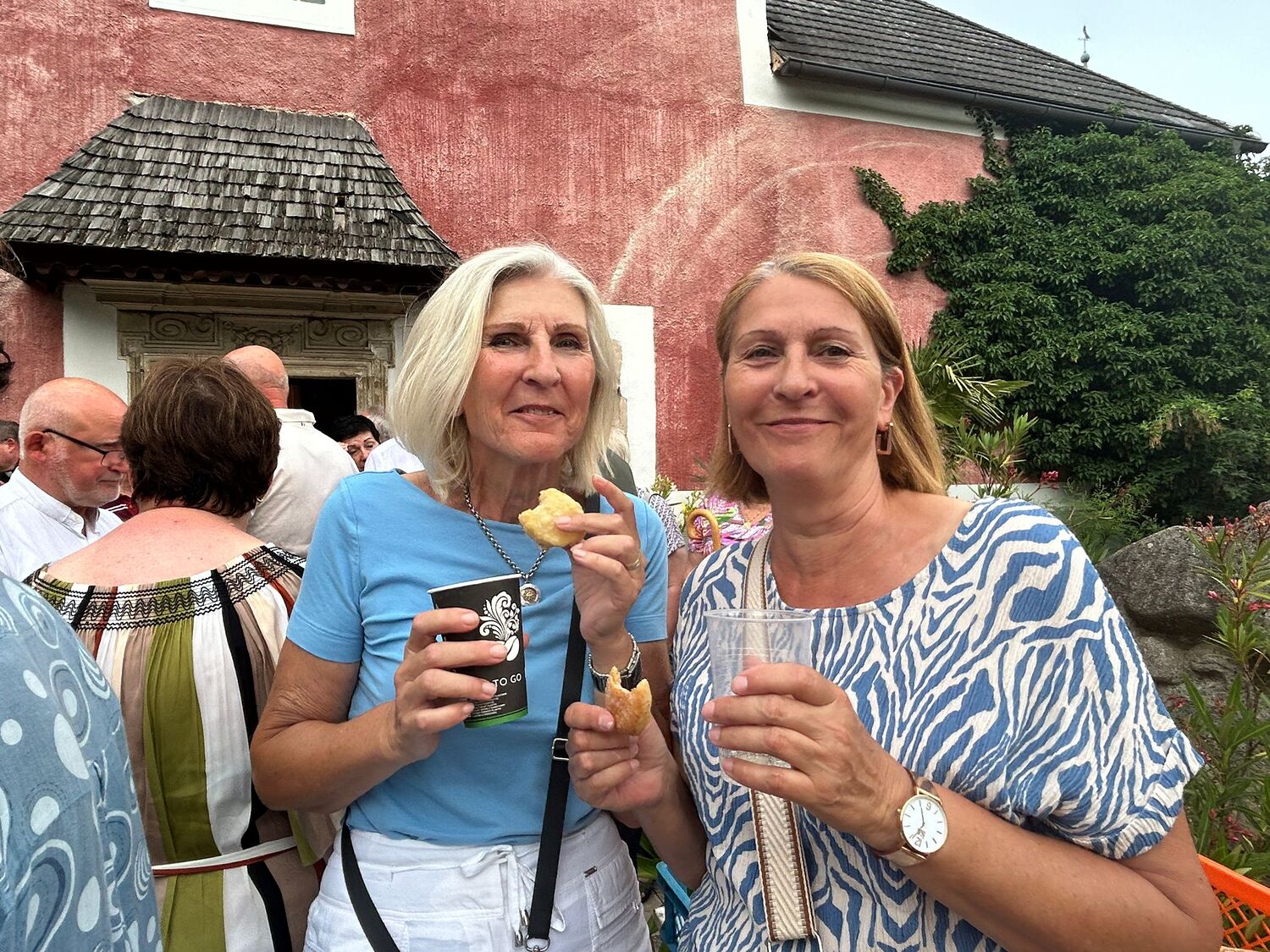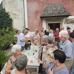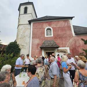 Nach dem Gottesdienst lud Dechant Shinto die Messeteilnehmer im Garten vor der Schlosskapelle zu einer Agape mit div. Gebäck, Grammel-Pogatscherl, Kuchen, Mineralwasser und Wein ein. Der Herr Dechant bedankte sich auch bei der Raiffeisenbank Draßmarkt-Kobersdorf-St. Martin und bei der Firma Waldquelle Kobersdorf für die Unterstützung und bei Schloss-Besitzerin Dr. Anna Schlanitz für die Möglichkeit, in der altehrwürdigen Schlosskapelle diese Hl. Messe zu feiern.