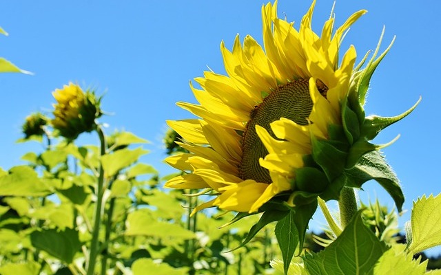 Sonnenblumen brauchen die Sonne zum Leben, sie brauchen Wärme und sie brauchen Licht, sie strecken sich der Sonne entgegen. Wenn die Sonne am Himmel wandert, dann wandern auch ihre Blüten mit. Wenn es dunkel wird, schließen sie sich und lassen ihre Köpfe hängen. Und sie haben eines gemeinsam: sie schauen immer in die gleiche Richtung und sind tief verzwurzelt.