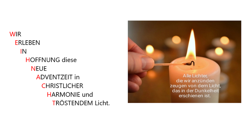 Sehen wir den Advent wieder als das, was es eigentlich heißt: Die Ankunft Gottes erwarten. Er kommt ganz leise, und so muss es auch sein, leise, damit wir überhaupt bemerken, dass er kommt, damit wir ihm wieder mehr Raum, Licht und Liebe in unserem Leben geben.