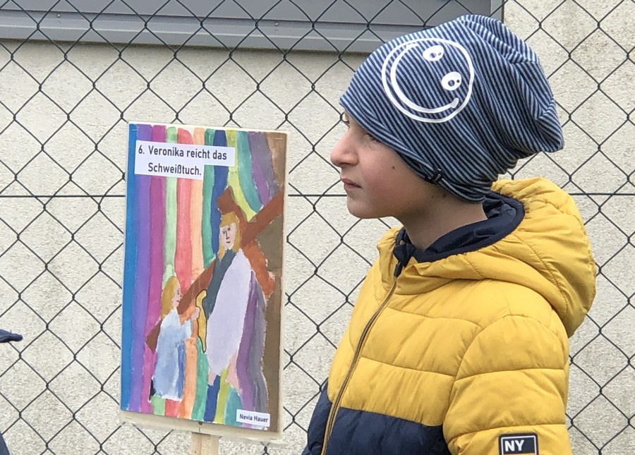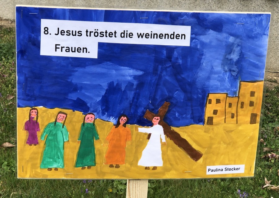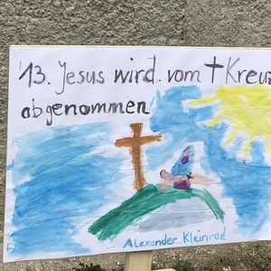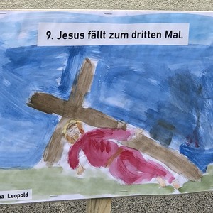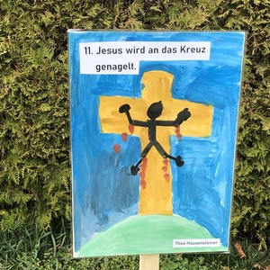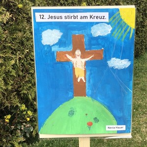 In diesem Jahr haben die Erstkommunionskinder den Kinderkreuzweg selbst gestaltet. Jedes Kind durfte zwei Stationen gestalten. Mit den Eltern haben sie sich in das Thema vertieft. Daraus entstanden wunderschöne Kunstwerke. Diese visualisierten den Leidensweg Jesu nochmal gut.