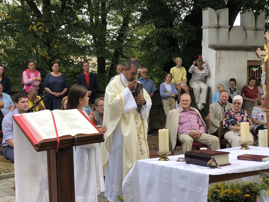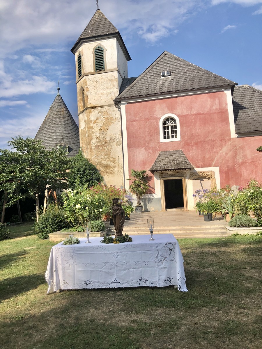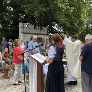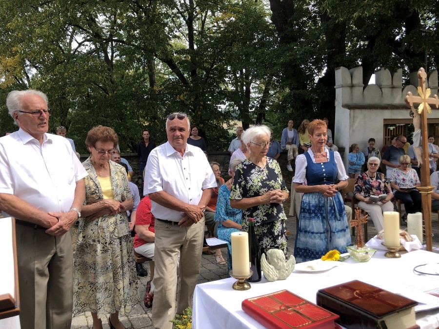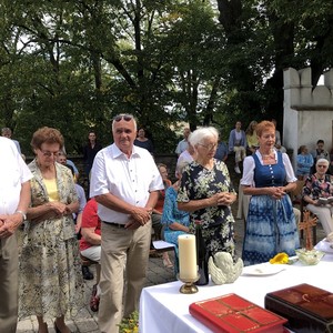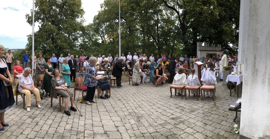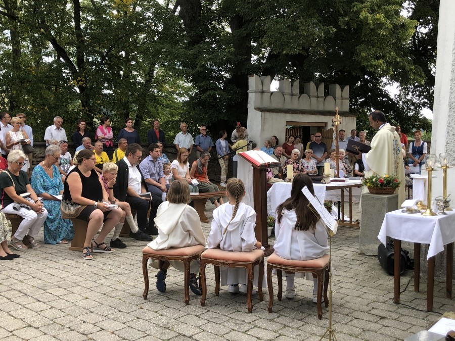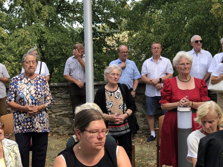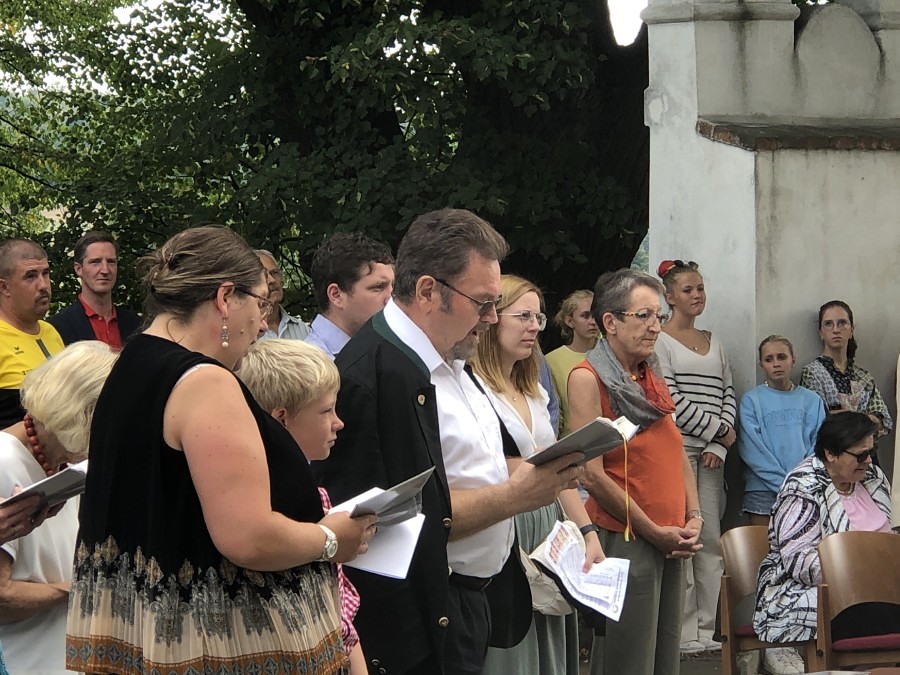 Als Abschluss des Marienfeiertages fand dann am Abend noch eine Andacht im Schloßgarten statt, zu der alle Gläubigen des Pfarrverbandes geladen waren und auch zahlreich teilnahmen.