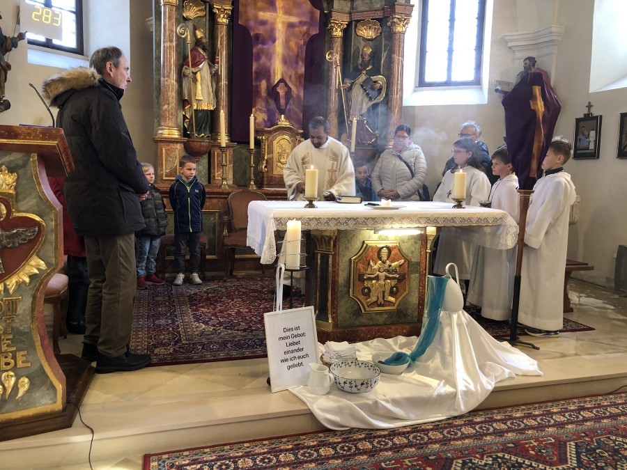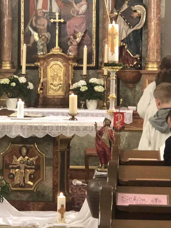 Die Kerze mit den Buchstaben Alpha und Omega und der Jahreszahle drückt aus, dass Anfang und Ende der Zeit, in die Ewigkeit Gottes eingeschrieben sind.