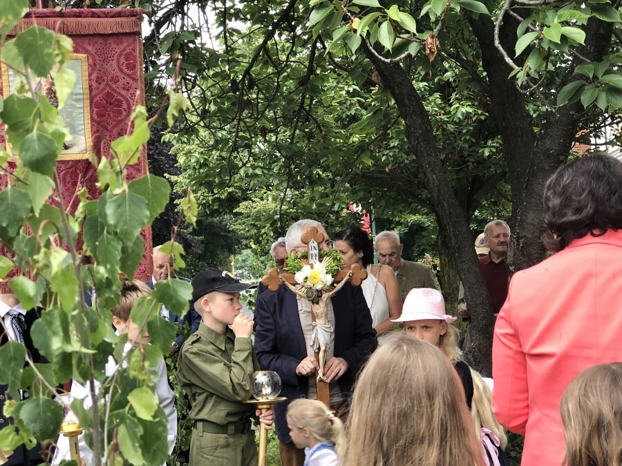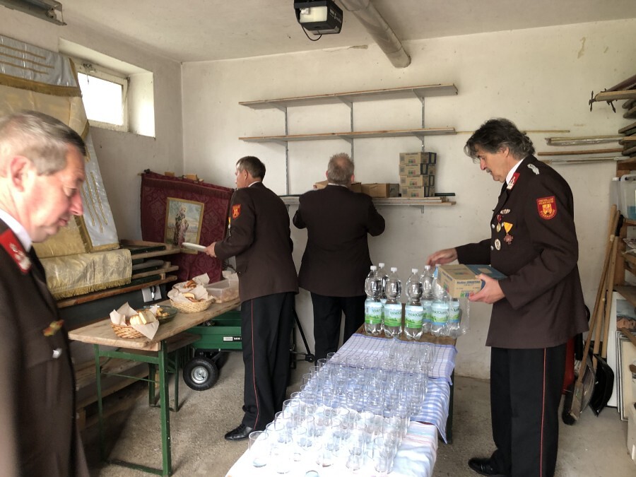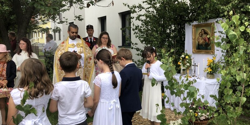 Wetterbedingt musste der Ablauf in Kobersdorf kurzfristig geändert werden. Begonnen wurde mit der Prozession zu 3 Altären, die sehr liebevoll gestaltet waren. Ein schönes Zeichen setzten unsere Erstkommunionkinder mit ihren Tischmüttern, die die erste Station mit Musik und Texten mitgestaltet haben. Die Hl. Messe fand im Anschluss im Pfarrsaal statt.