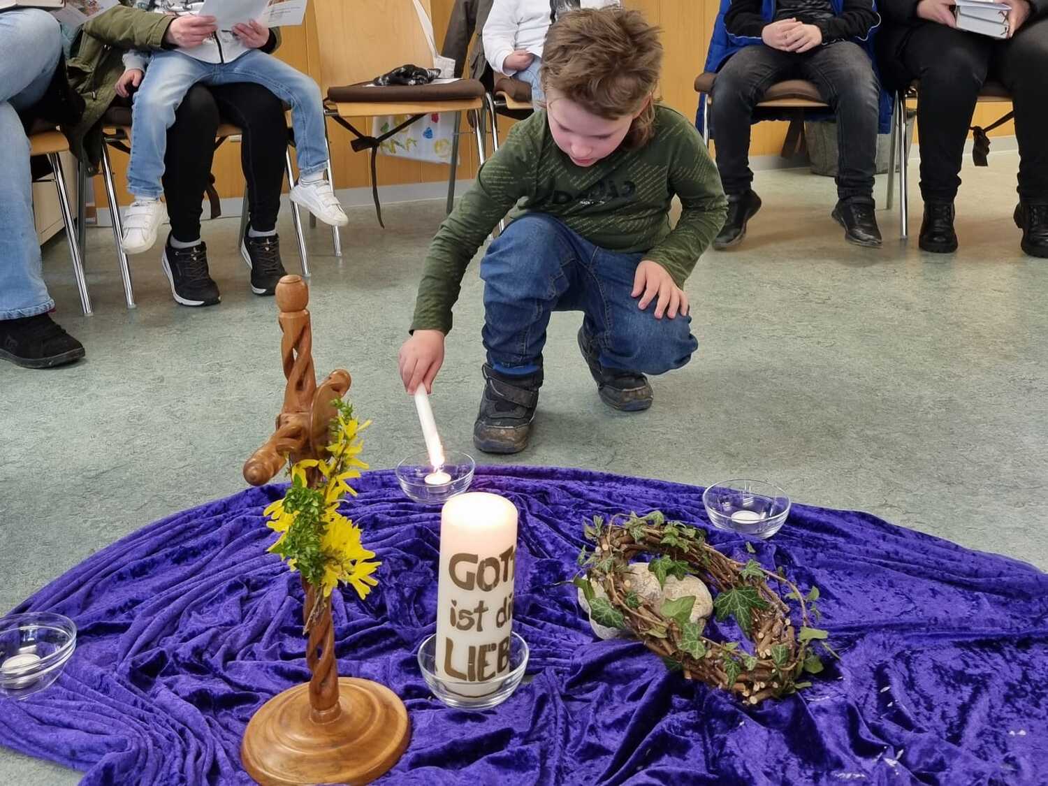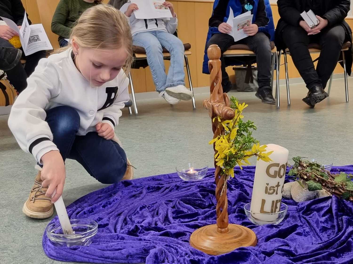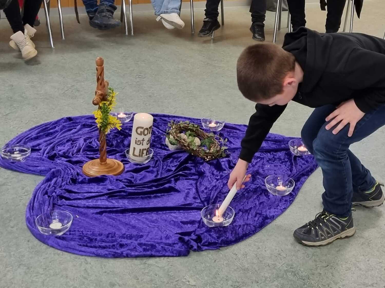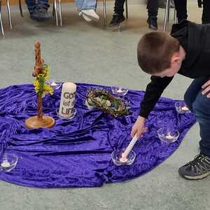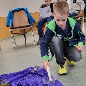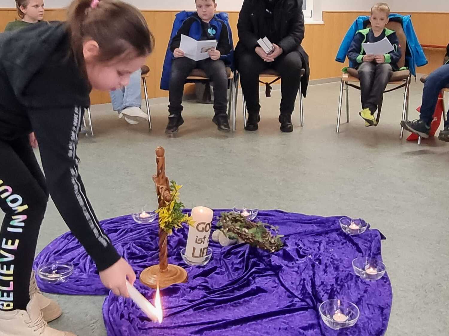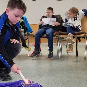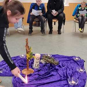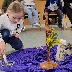 In 6 Stationen wurden den Kindern die letzten Stunden Jesu nahe gebracht. Dabei ist ihnen deutlich geworden, dass Leid und Grausamkeit nicht das letzte ist, sondern der Kreuzweg mit der Auferstehung endet. Jede der Stationen beinhaltete eine Fürbitte, dazu wurde von den Kindern eine Kerze entzündet.