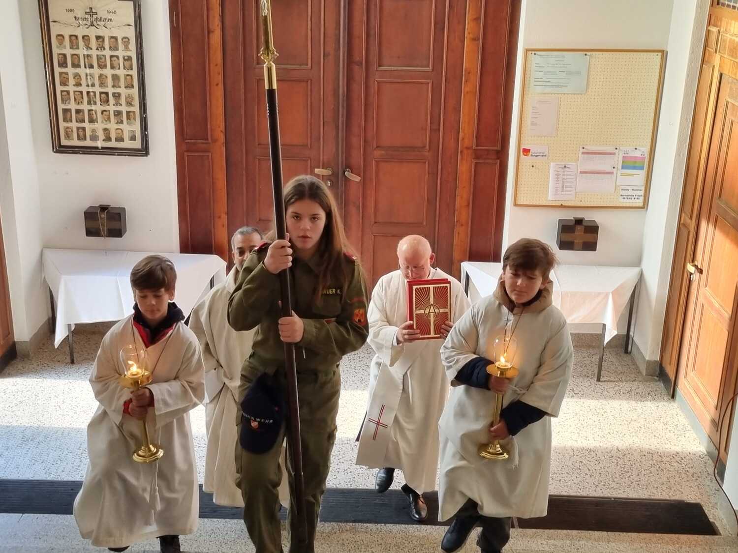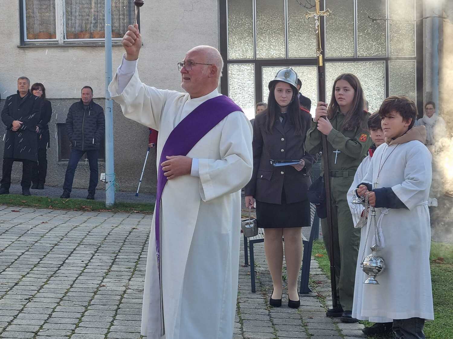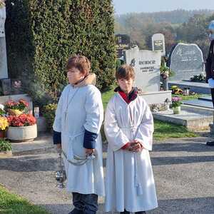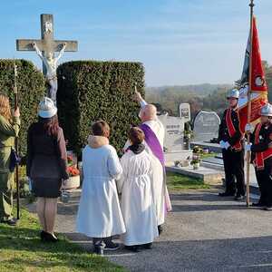 Nach dem Gottesdienst am Vormittag wurden von Diakon Zach im Beisein der Gottesdienstbesucher, der Freiwilligen Feuerwehr, der Musikkapelle und der Ministranten die Gräber gesegnet und anschließend beim Kriegerdenkmal zum Gedenken an die vielen vermissten und verstorbenen Kameraden der beiden Weltkriege ein Kranz niedergelegt.
