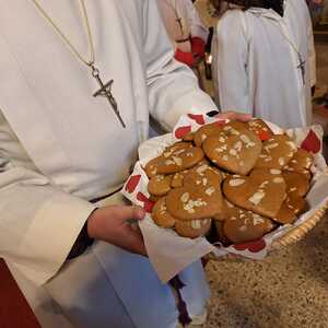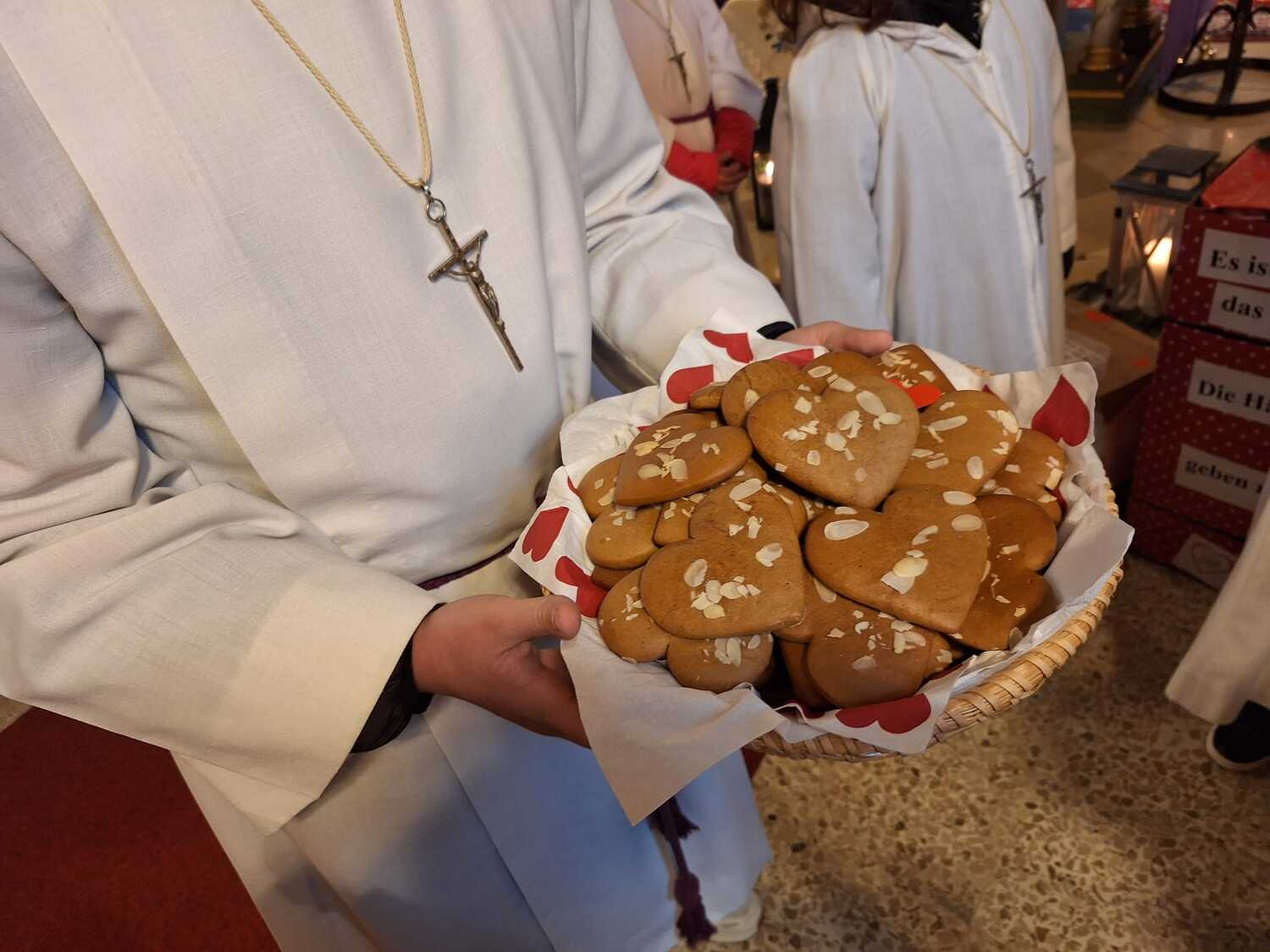 Zum Abschluss der Messe erhielt jede/r Gottesdienstbesucher:in ein Lebkuchenherz als kleines Dankeschön. Anschließend lud eine kleine Agape am Kirchenplatz dazu ein, noch miteinander ins Gespräch zu kommen und die Freude dieses besonderen Adventsonntags weiterzutragen.