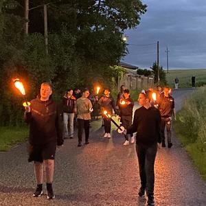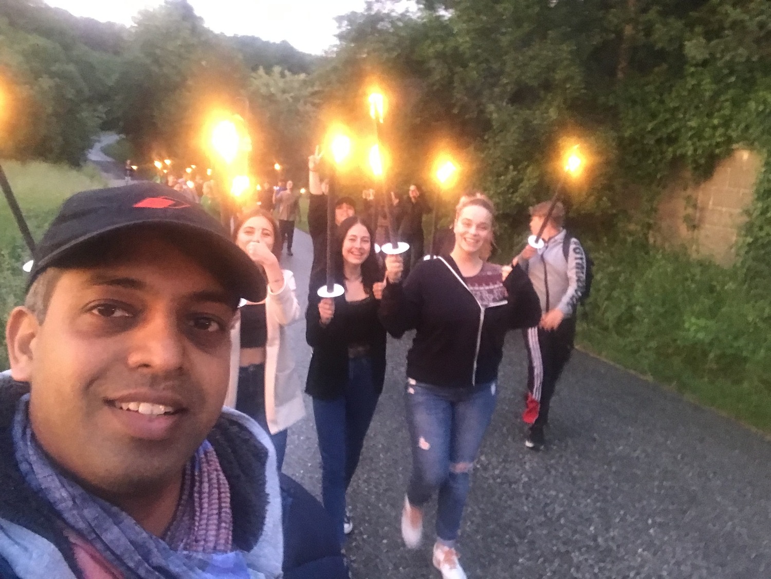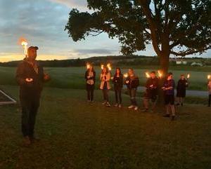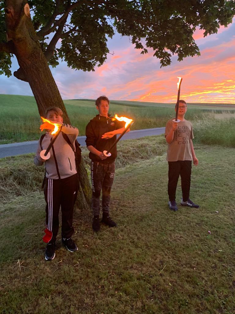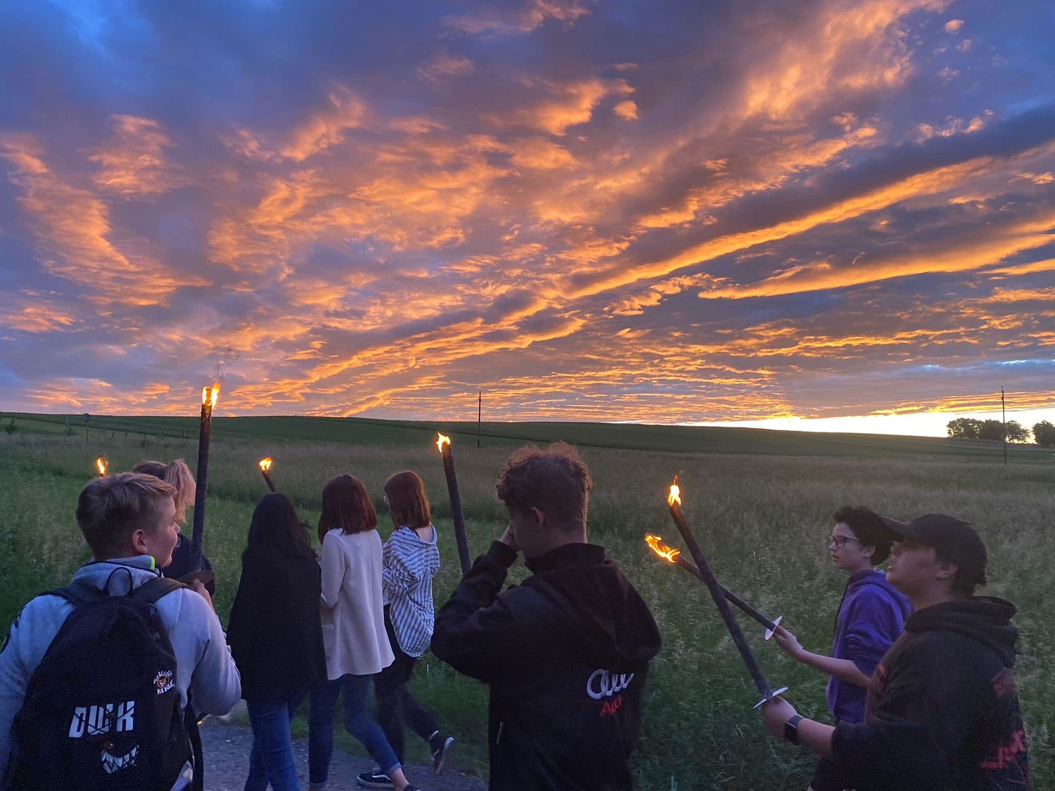 Passender hätte die Abendstimmung für die Fackelwanderung zum Thema „Feuer und Flamme“ nicht sein können. Man hatte das Gefühl, der Himmel brennt mit den Fackeln mit.