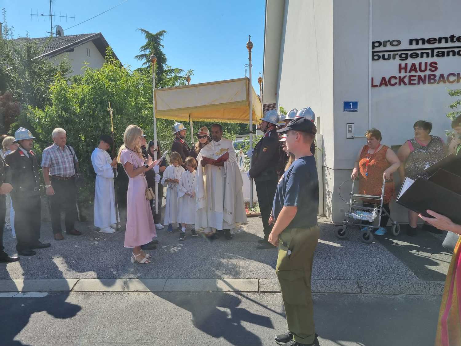Begonnen hat das „Hochfest des Leibes und Blutes Christi“ in der Kirche. Die anschließende Prozession führte uns zu 4 Altären und dann wieder zum Schlußsegen zurück in die Kirche. Musikalisch umrahmt wurde der Umzug von der Musikkapelle Lackenbach.