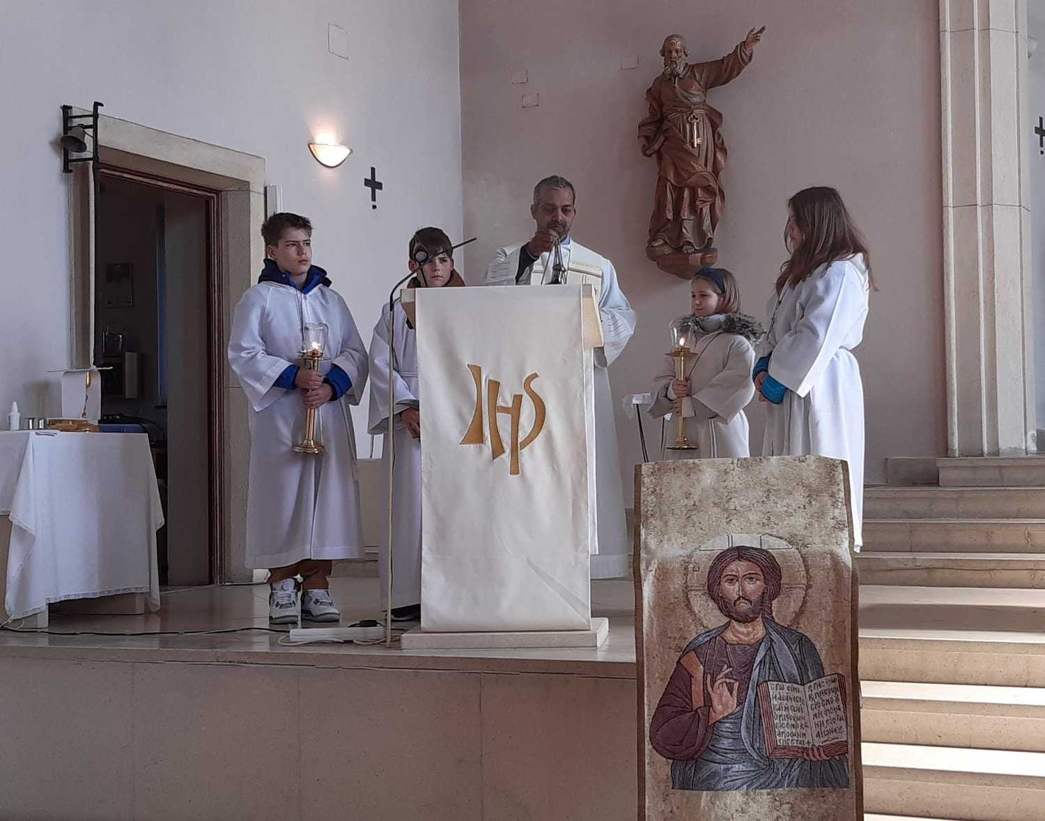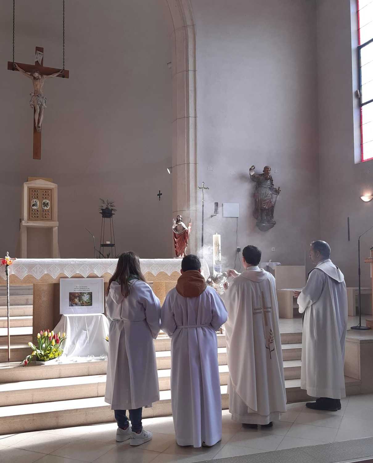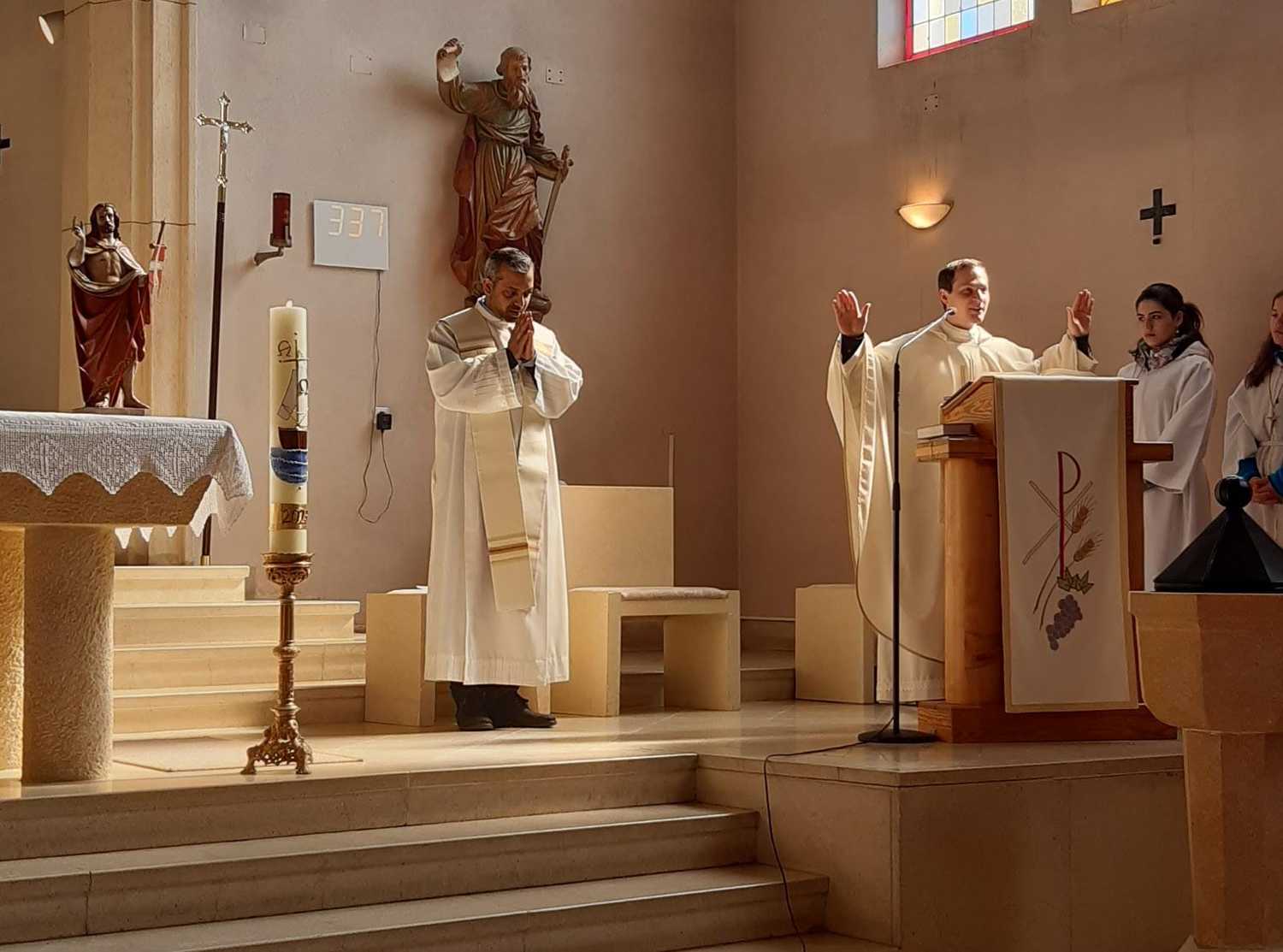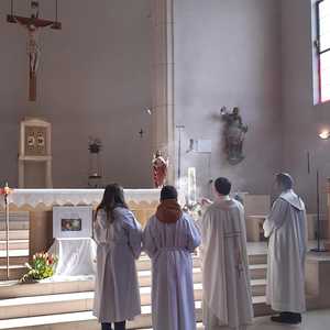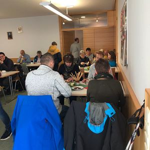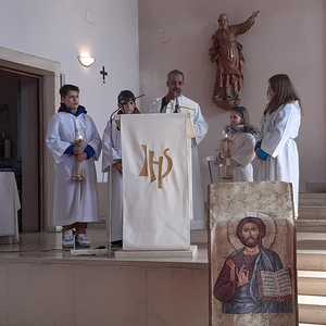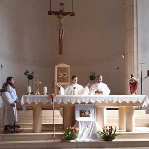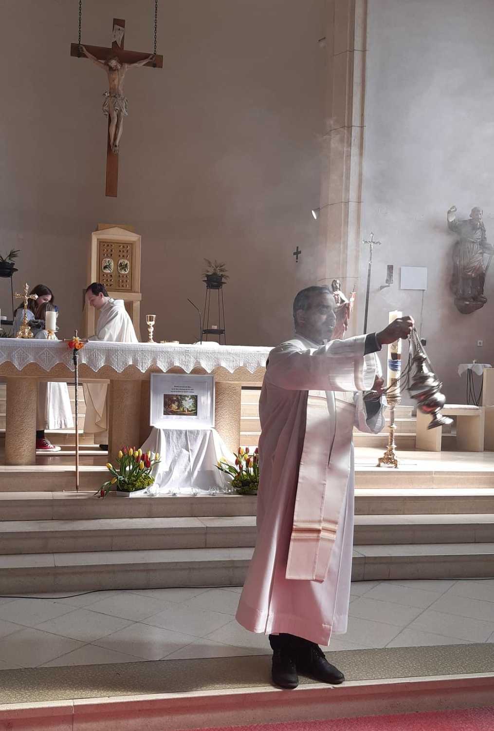 Nach 2 Stunden war dann Lackenbach erreicht, wo die vielen Wanderer aus allen Pfarren und Filialgemeinden mit einem guten Frühstück versorgt wurden. Anschließend feierte Gastpriester David Gold und Pfarrer Shinto die Eucharistie mit uns. Zu den 40 Emmauspilgern hatten sich noch weitere Gläubige gesellt, die den Weg nicht zu Fuß machen konnten, die Heilige Messe zum Osterfest aber nicht versäumen wollten.