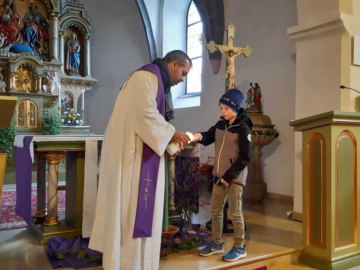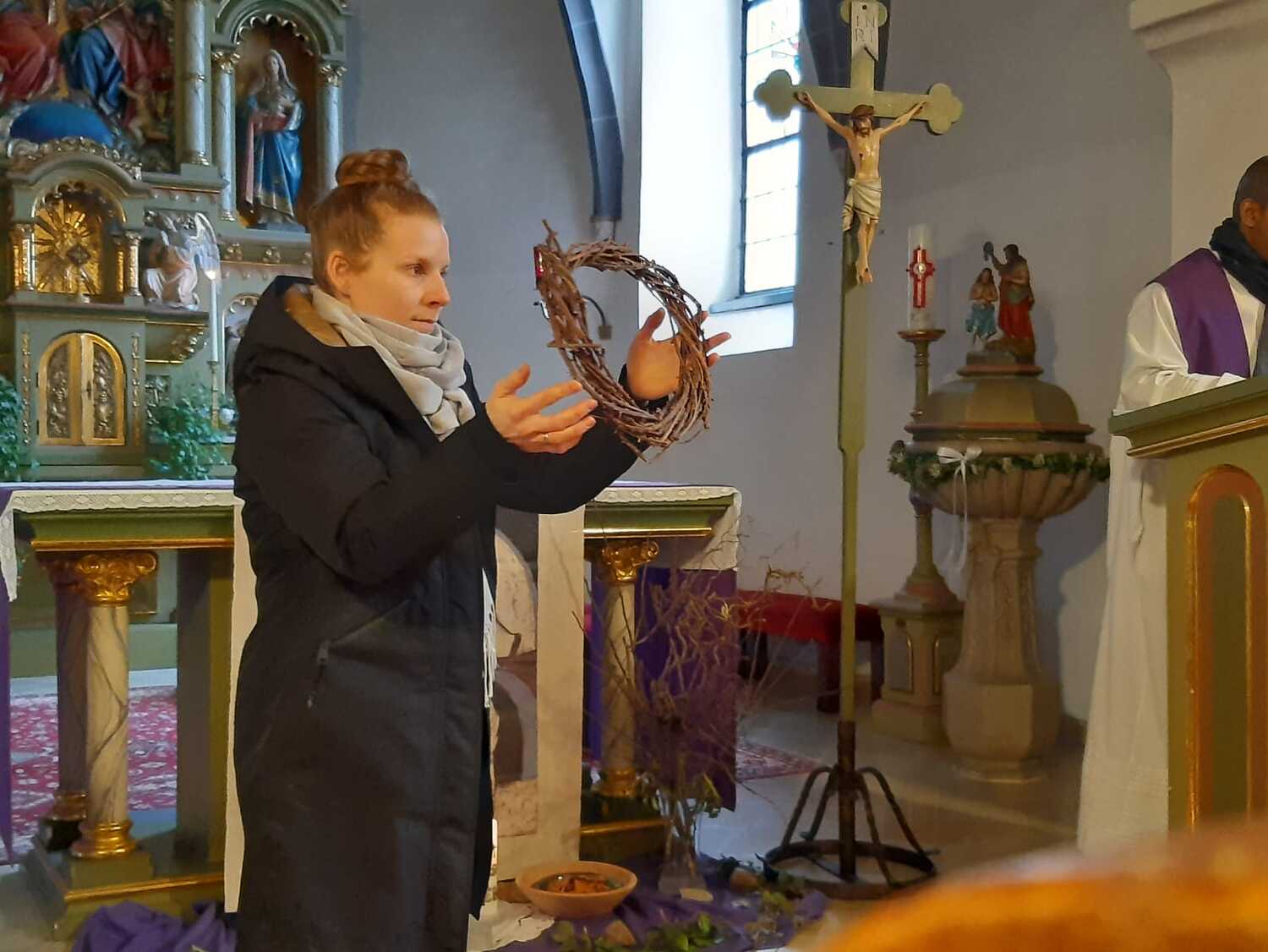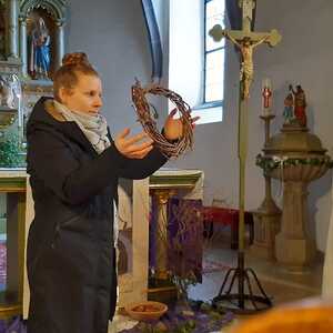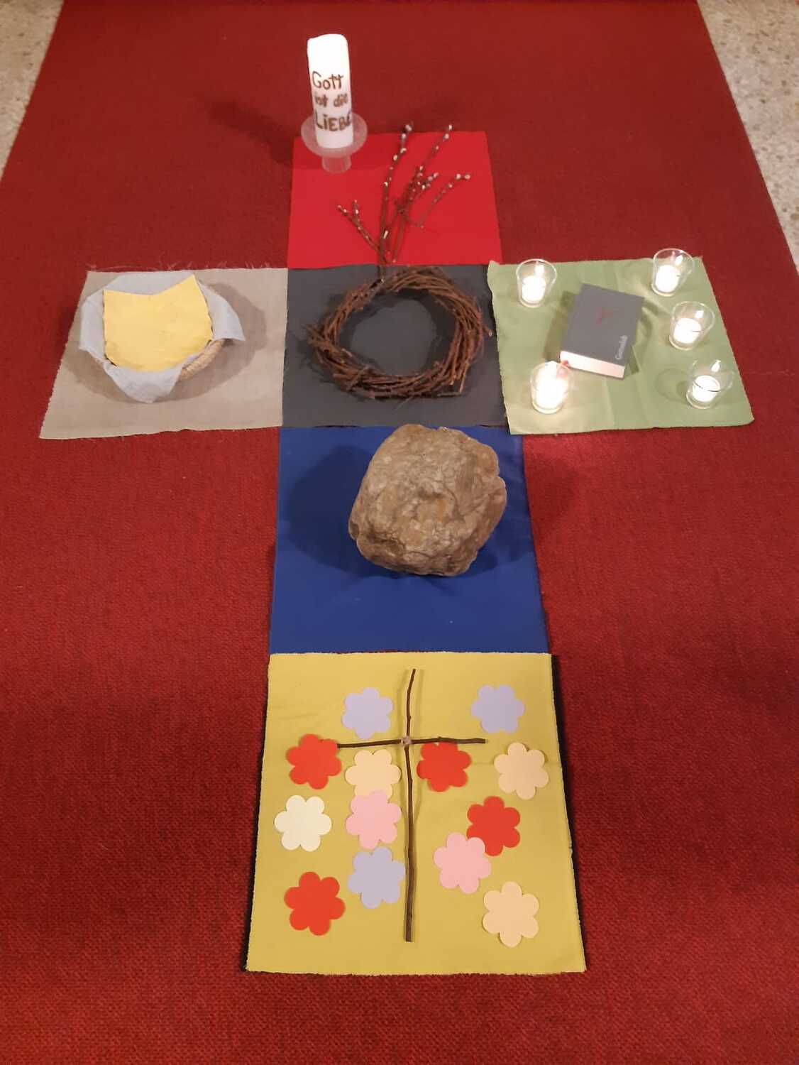 In 6 Stationen konnten die Kinder mit verschiedenen Symbolhandlungen den Weg Jesu nachgehen. Begonnen wurde zum Einzug in Jerusalem mit einem Palmzweig in den Händen mit einem gemeinsamen Lied. Zum Zeichen des letzten Abendmahles wurde Brot geteilt und gegessen und anschließend an Jesu am Ölberg gedacht und jeder durfte zum gemeinsamen VaterUnser ein Teelicht entzünden. Die Schmerzen und das schwere Leid wurde mit einer Dornenkrone und einem schweren Stein dargestellt. Zur Kreuzverehrung wurde dann das dunkle Kreuz mit bunten Blumen verschönert.