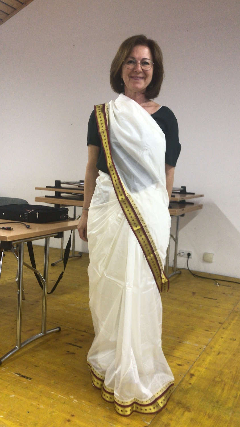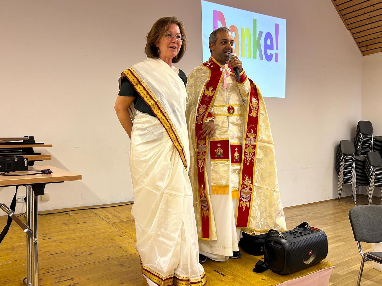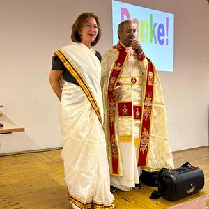 In traditioneller indischer Festtagskleidung präsentierte er uns ein farbenfrohes, harmonisches und friedvolles Miteinander der 20% Christen in Kerala mit ihren Mitbewohnern anderer Religionen.