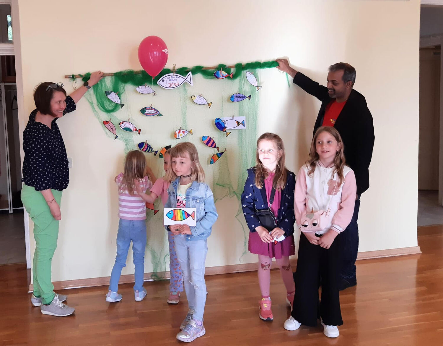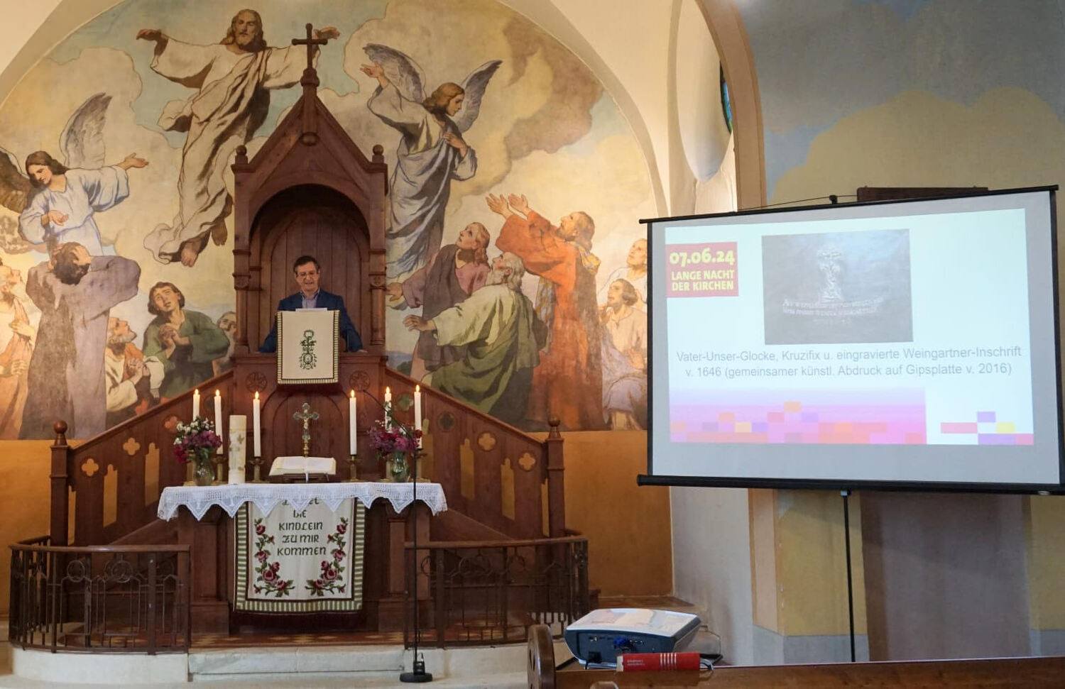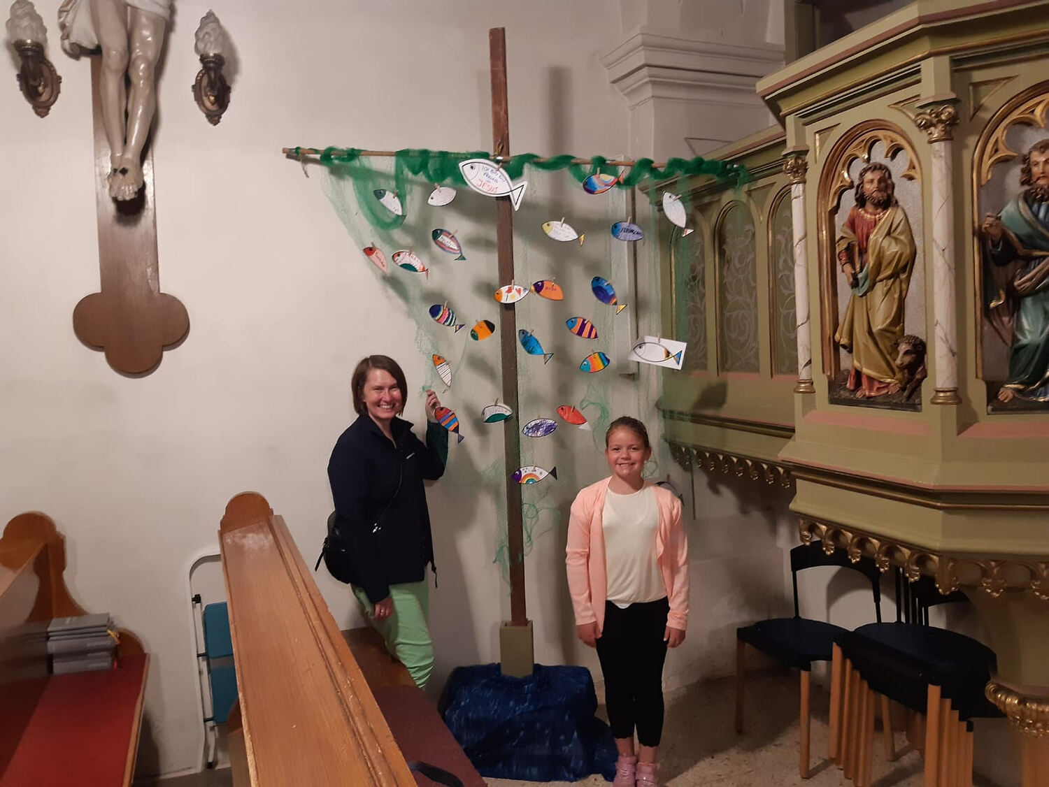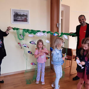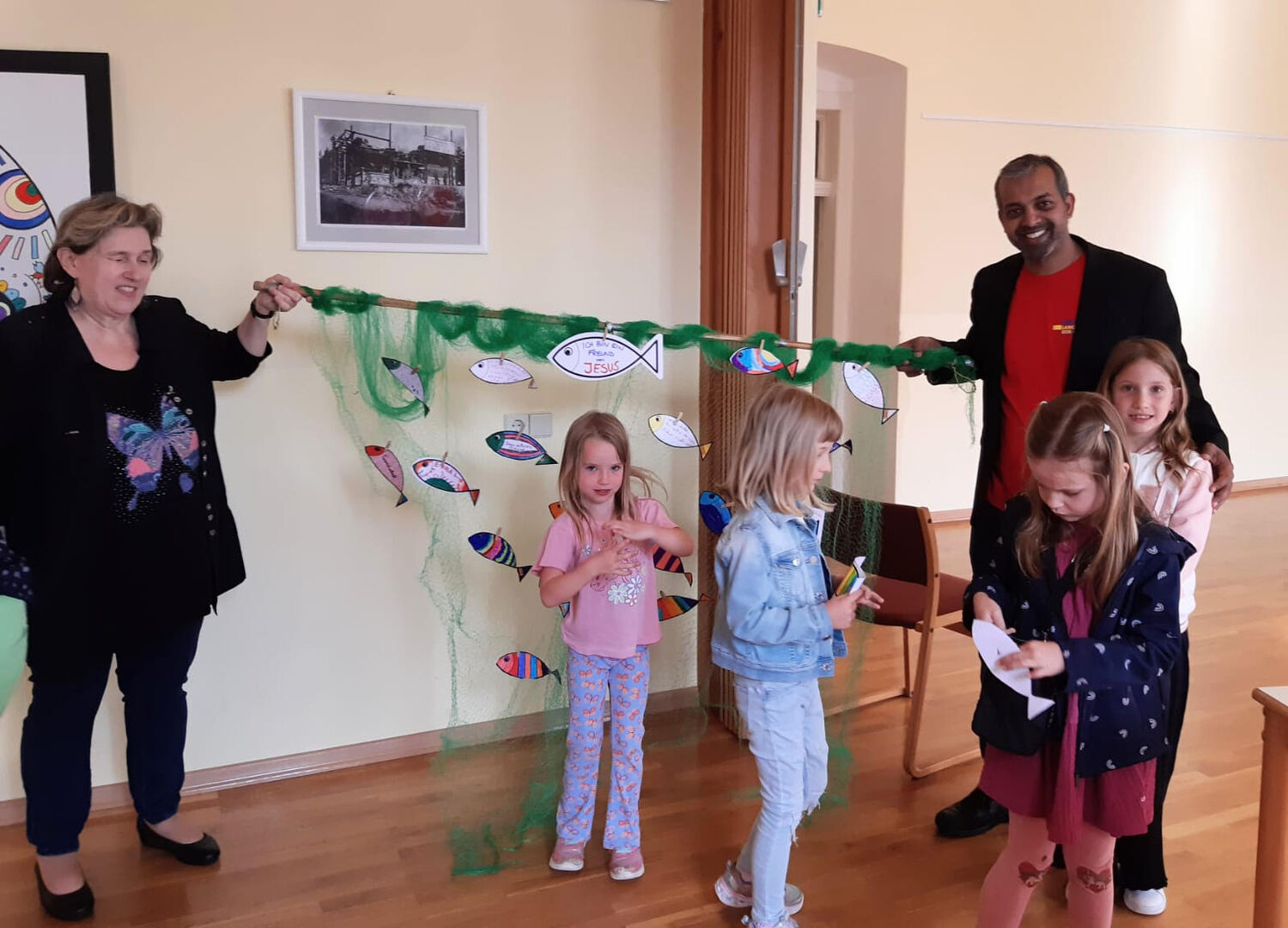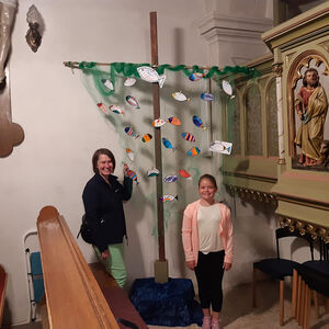 Danach zogen die Kinder in die alte Schule, wo ein abwechslungsreiches Kinderprogramm von Katja Schützenhofer und ihrem Team vorbereitet war. Während die Kinder dem Erzähltheater zum Thema „Ich mache euch zu Menschenfischern“ lauschten und danach bei einer Kreativstation Fische basteln konnten, führte David Piniel die Erwachsenen durch die Kirchen- und Glockengeschichte der Bekenntniskirche Weppersdorf. Zwischen den einzelnen Vortragsblöcken wurde gemeinsam gesungen und wer wollte, konnte die VaterUnser-Glocke besichtigen. Außerdem bestand die Möglichkeit einen Film zur Geschichte der Bekenntniskirche von Weppersdorf zu schauen.