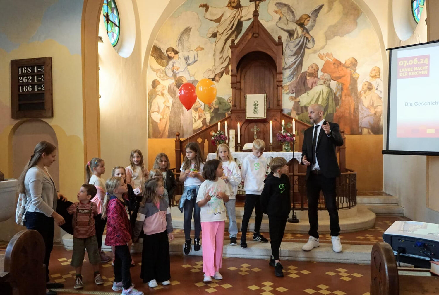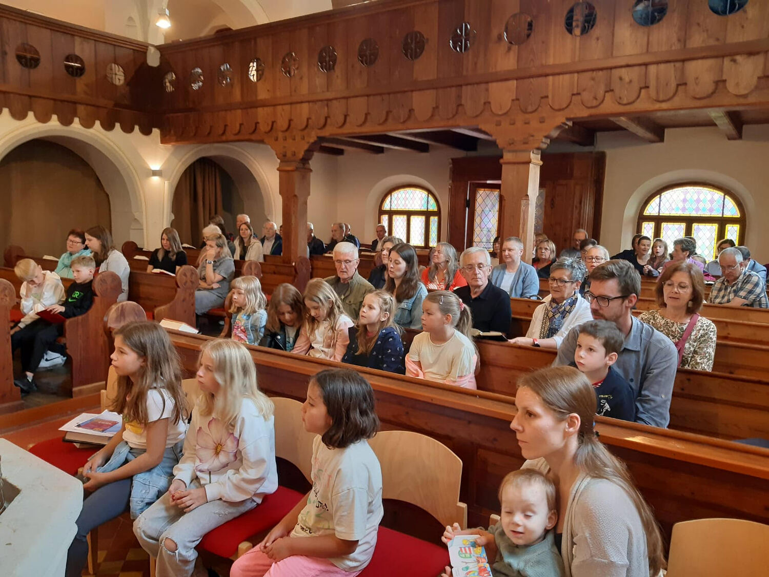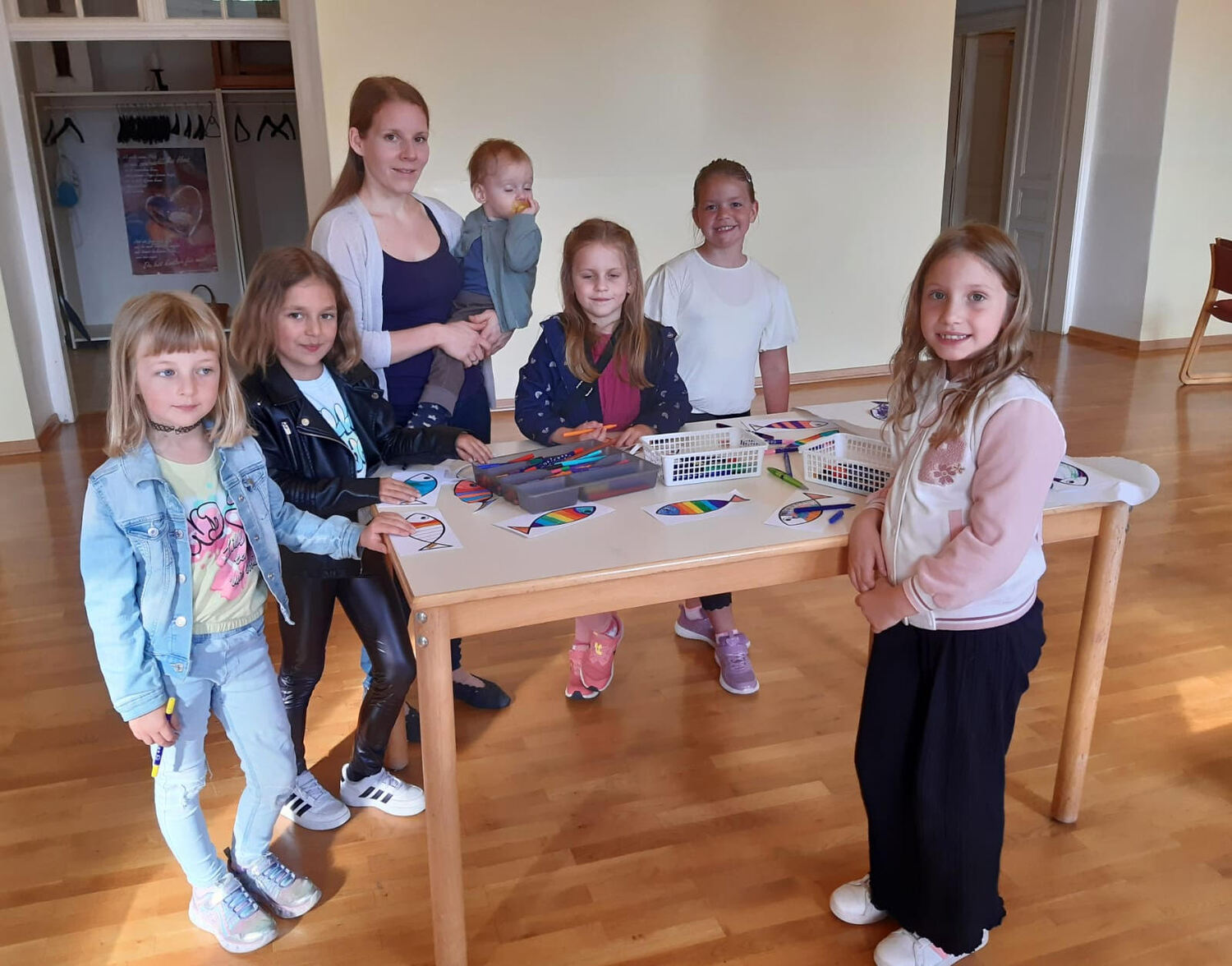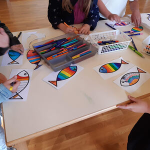 Danach zogen die Kinder in die alte Schule, wo ein abwechslungsreiches Kinderprogramm von Katja Schützenhofer und ihrem Team vorbereitet war. Während die Kinder dem Erzähltheater zum Thema „Ich mache euch zu Menschenfischern“ lauschten und danach bei einer Kreativstation Fische basteln konnten, führte David Piniel die Erwachsenen durch die Kirchen- und Glockengeschichte der Bekenntniskirche Weppersdorf. Zwischen den einzelnen Vortragsblöcken wurde gemeinsam gesungen und wer wollte, konnte die VaterUnser-Glocke besichtigen. Außerdem bestand die Möglichkeit einen Film zur Geschichte der Bekenntniskirche von Weppersdorf zu schauen.