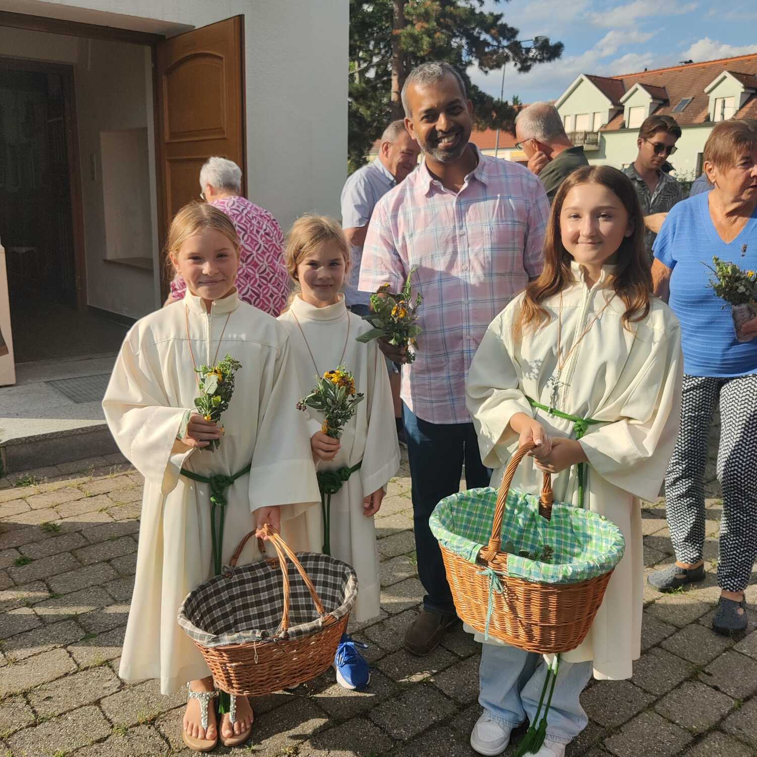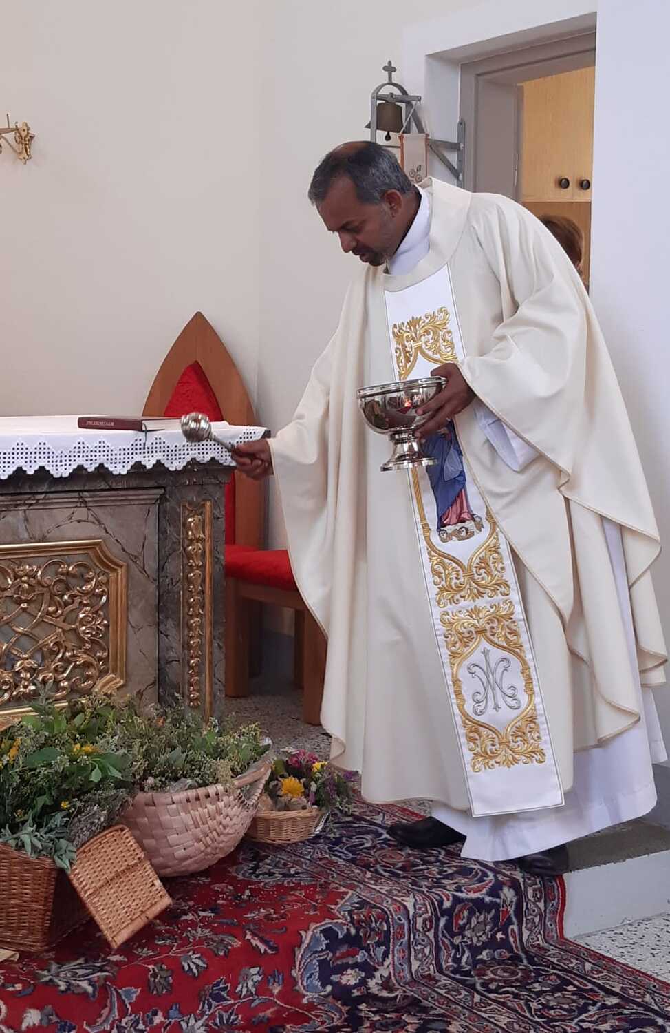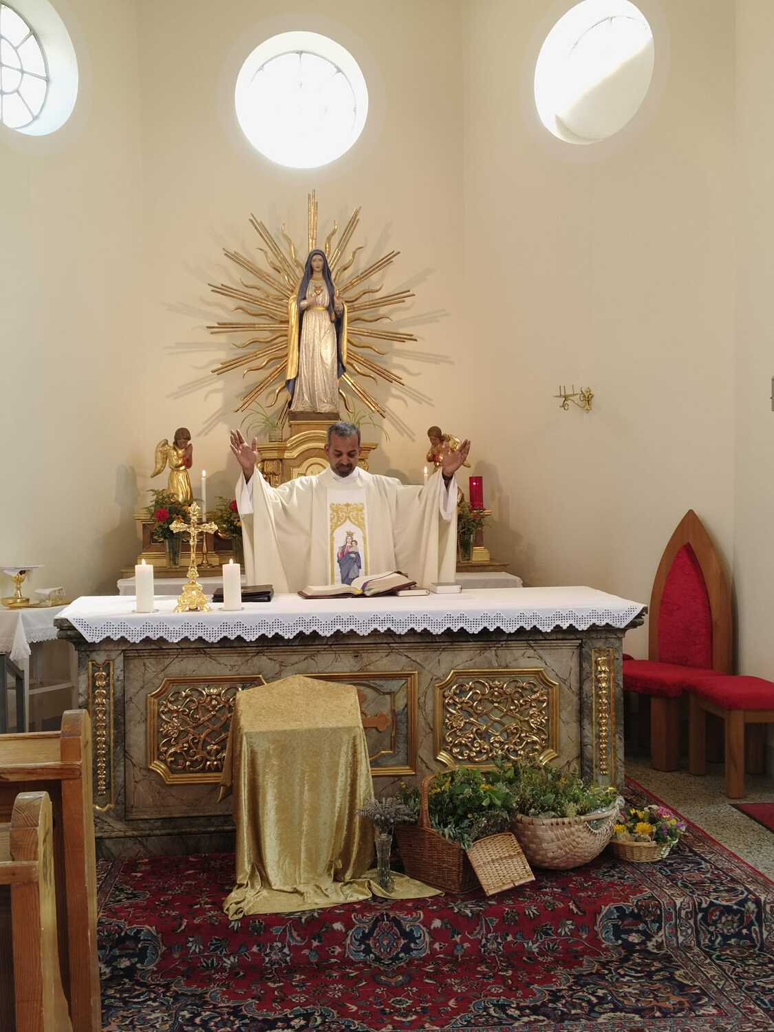 Auch in den Filialen Lindgraben und Tschurndorf wurden mit viel Eifer Kräuter gesammelt und von den Frauen zu wunderschönen Sträußen gebunden. Pfarrer Shinto segnete diese im Rahmen des Patroziniumsfestes in Tschurndorf und nach der Vorabendmesse in Lindgraben. Am Ende der Heiligen Messen wurden diese an die Gottesdienstbesucher verteilt und durften mit nach Hause genommen werden.