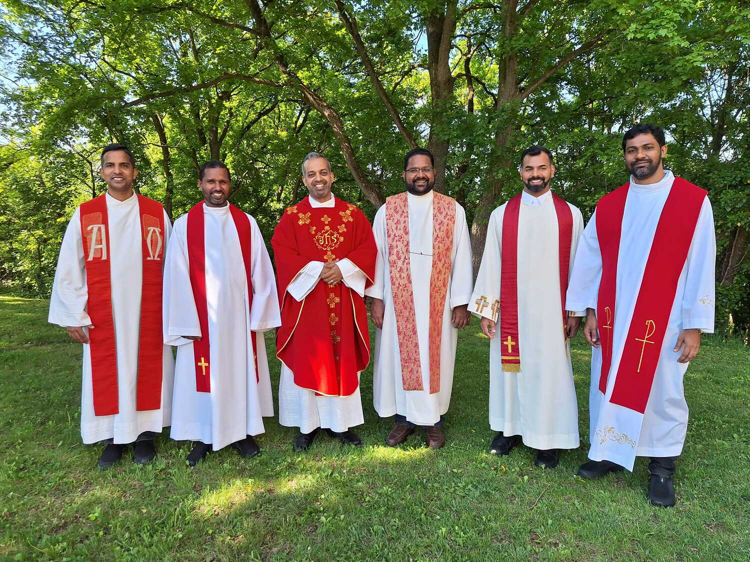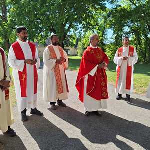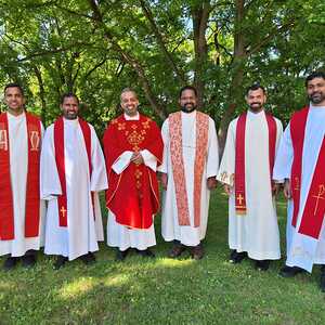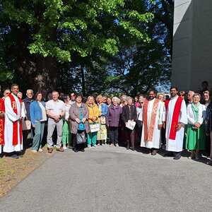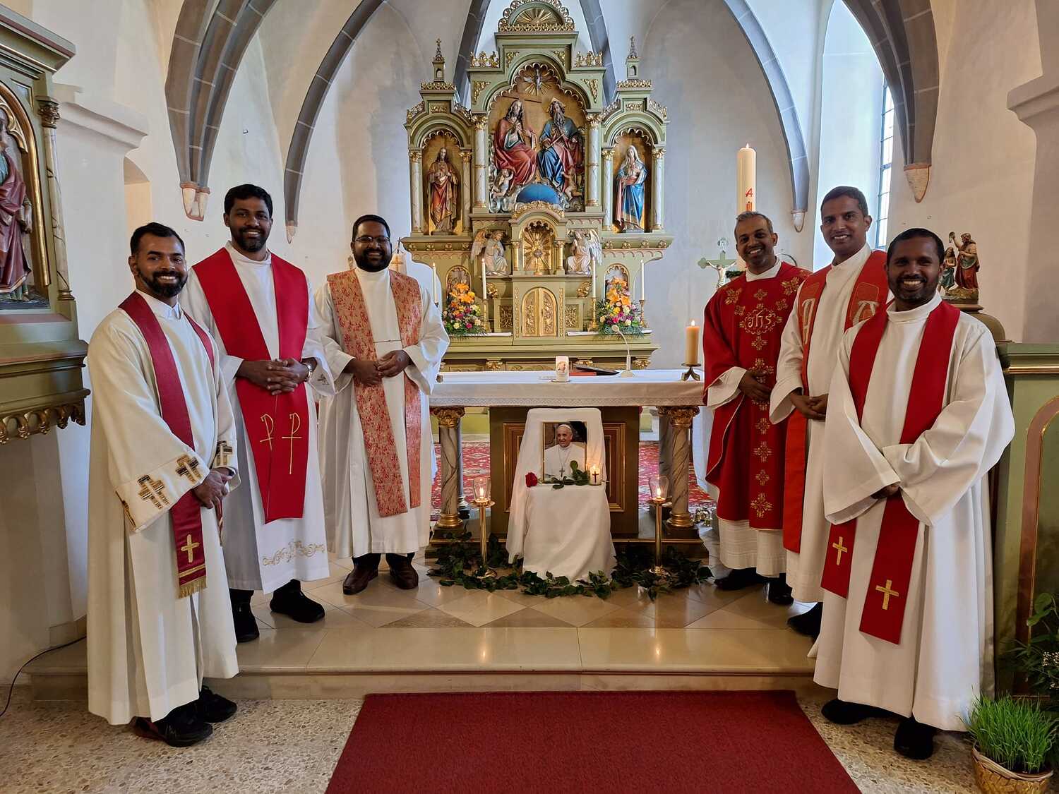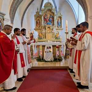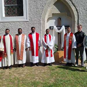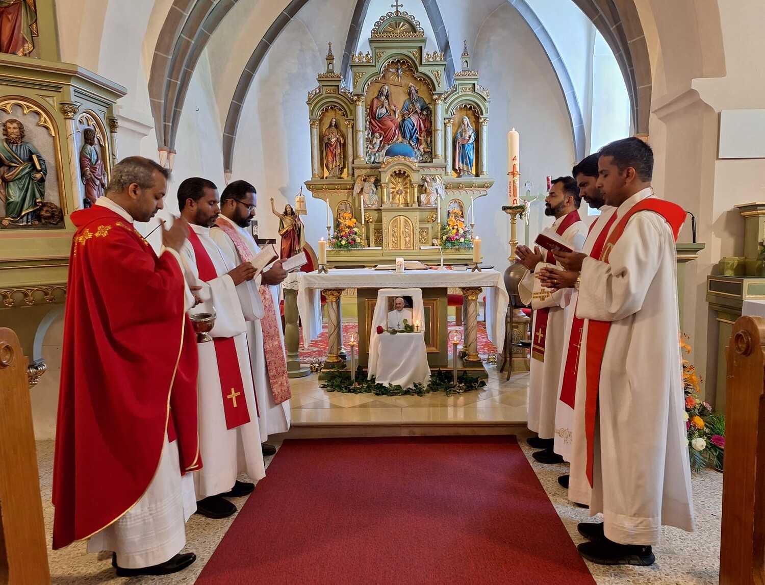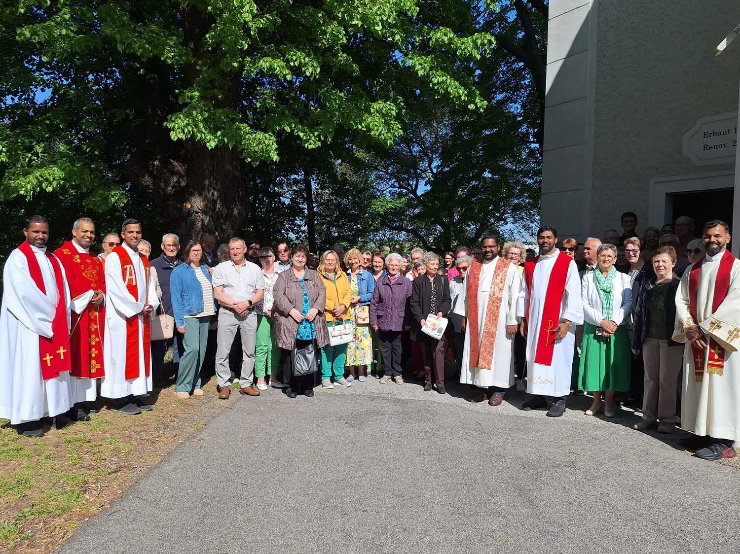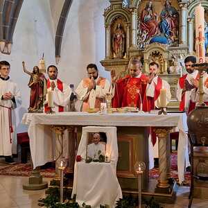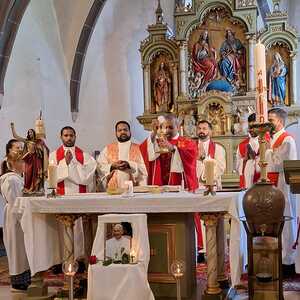 Unter der Trauergemeinde waren auch Gäste aus unserer Partnerdiözese Kanjirappally. Fünf Priesterfreunde von Pfarrer Shinto aus Kerala, die sich gerade auf Europabesuch befinden, waren Konzelebranten. Ihre Freundschaft und gemeinsamer Weg reicht in die Zeit im Knabenseminar zurück. Bevor der priesterliche Segen erbeten wurde, erhielt die Gemeinde einen Einblick in die Liturgie der Syro-malabarischen Kirche. Alle sechs Priester stimmten abwechseln ein Trauergebet an. Es beinhaltet Wechselgebete und verschiedene Psalmen, die für den Verstorbenen gesungen werden. Wir waren vom Klang und der Schönheit der Sprache Malayalam ergriffen und sehr beeindruckt.