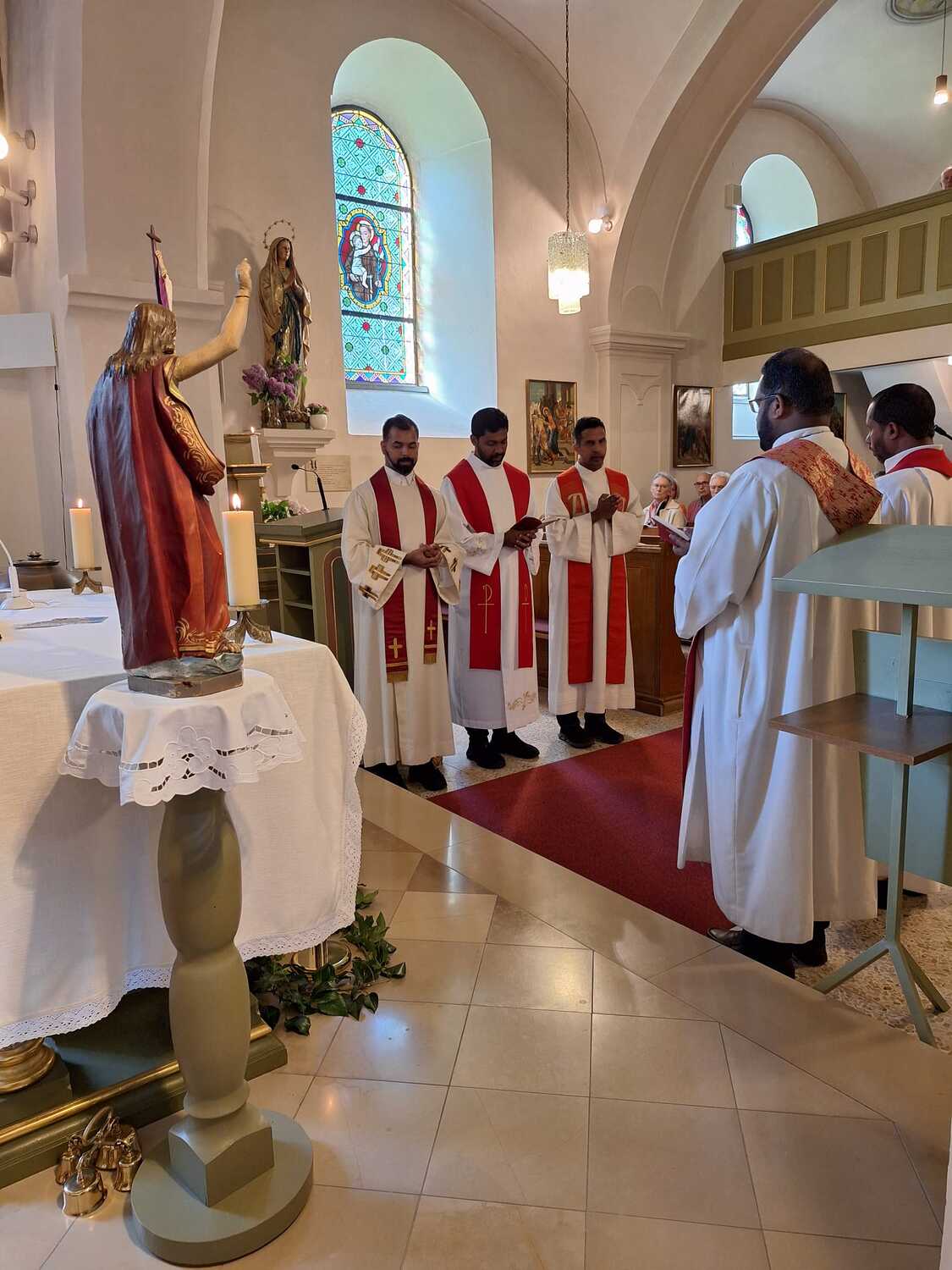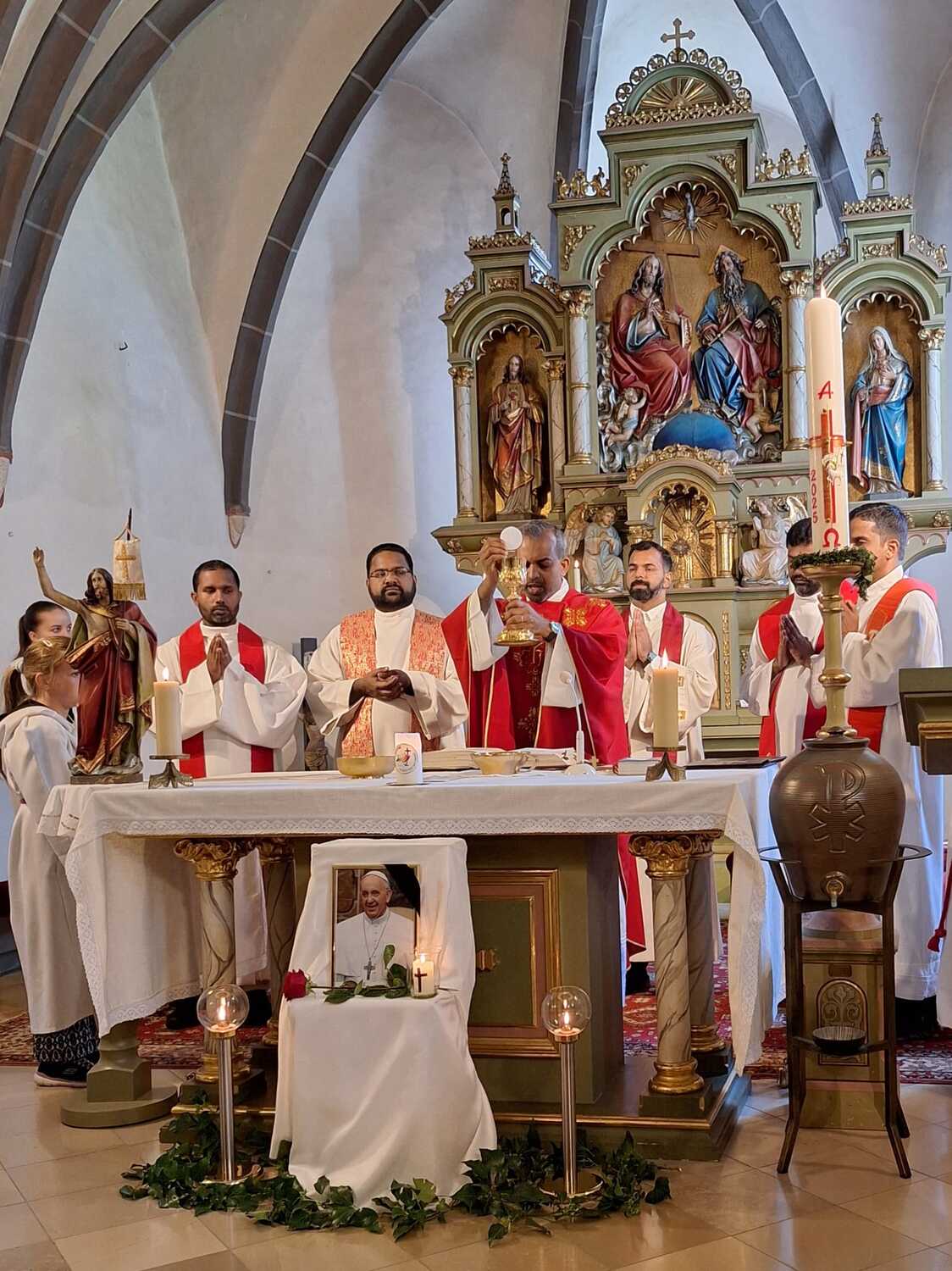 Der Tod des Bischofs von Rom hat uns alle am Ostermontag überrascht. Pfarrer Shinto erinnerte in seiner Predigt an die ersten Grußworte des Verstorbenen, an das liebevolle „Buona sera!“, mit der er die Menge grüßte. Sein unermüdlicher Einsatz für die Armen, die am Rande der Gesellschaft stehendenden und an die vielen Menschen, die er mit gütigen Augen wahrgenommen hat, wurde uns ins Gedächtnis gerufen. Wir erinnern uns an das Leben eines Hirten, der für seine Herde ein Vorbild an Bescheidenheit und Menschlichkeit war. „Bitte vergesst nicht, für mich zu beten!“ waren immer seine Schlussworte.