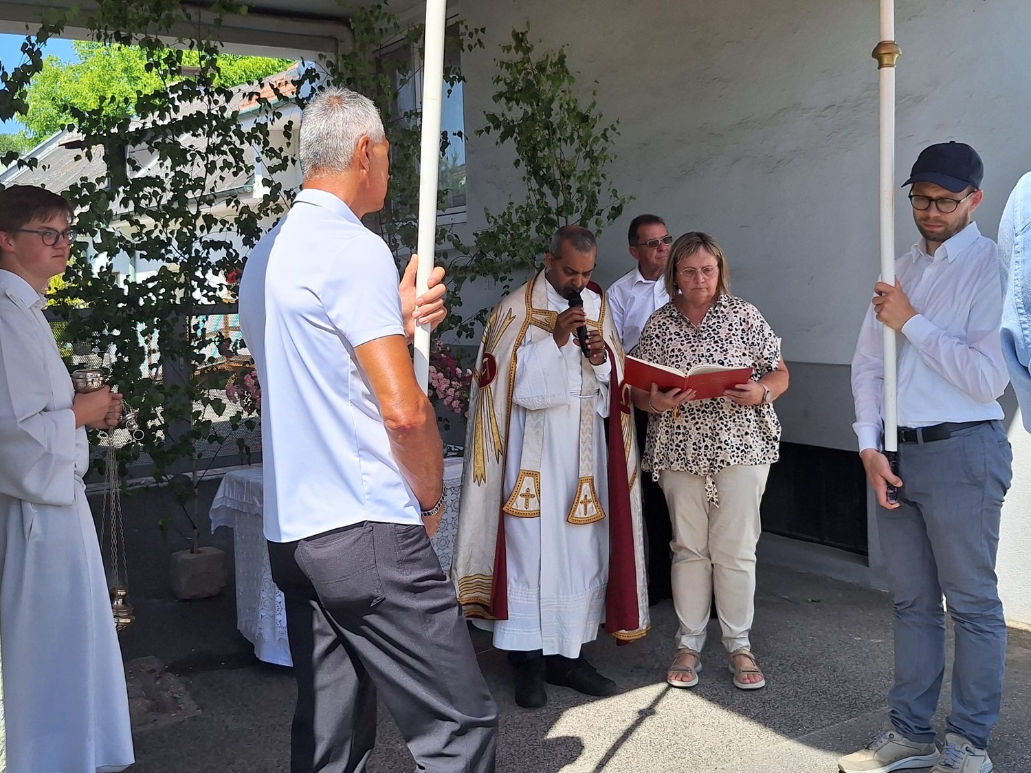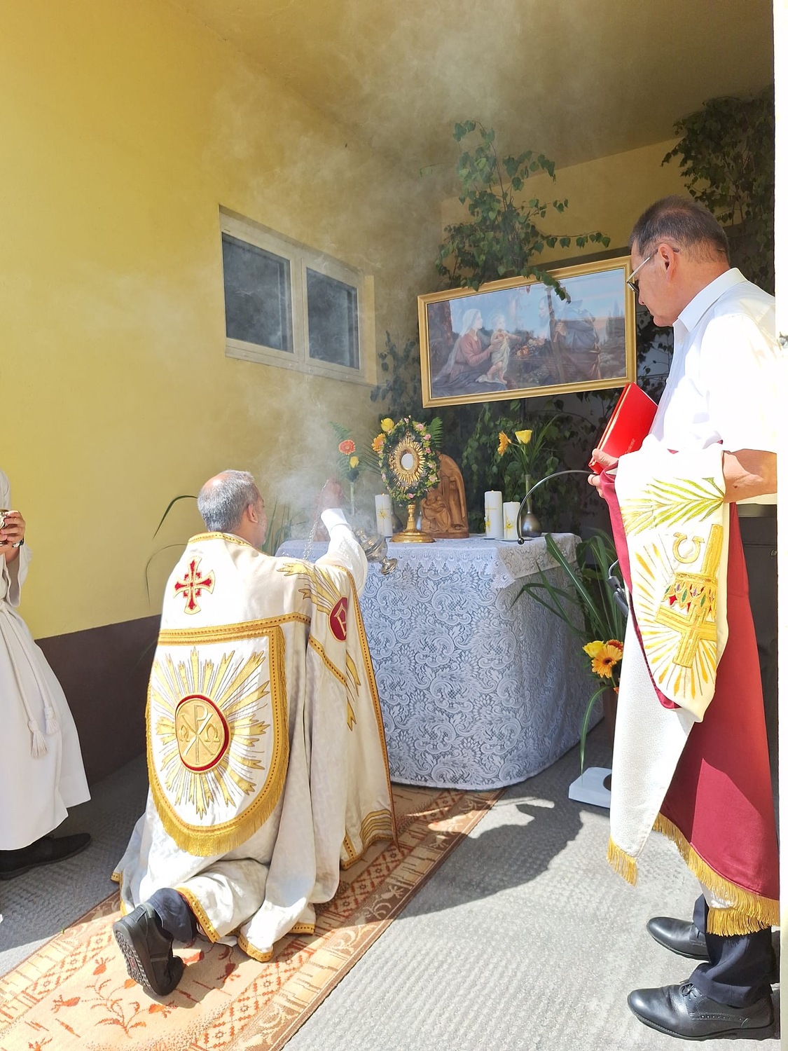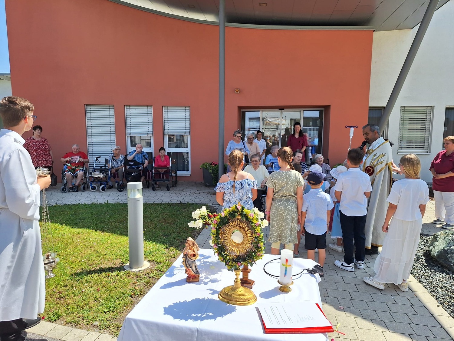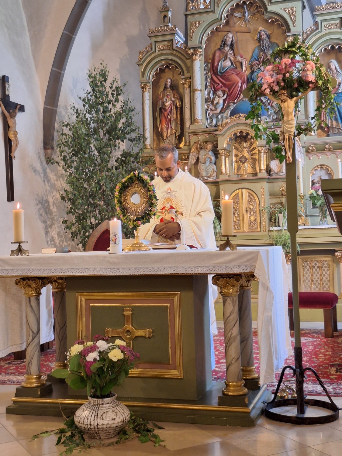 Im Anschluss an die Messe zog die Gemeinde in einer feierlichen Prozession mit dem Allerheiligsten durch die Straßen unseres Ortes. Der Weg führte zu vier festlich geschmückten Altären, die von engagierten Gemeindemitgliedern liebevoll vorbereitet worden waren. An jedem Altar wurde das Evangelium verkündet, Fürbitten gehalten und der sakramentale Segen gespendet.