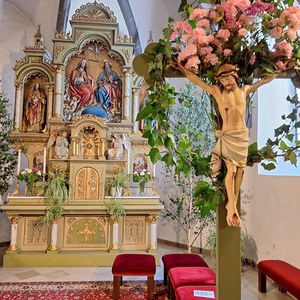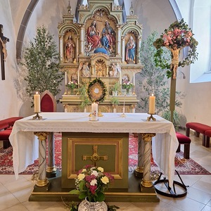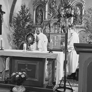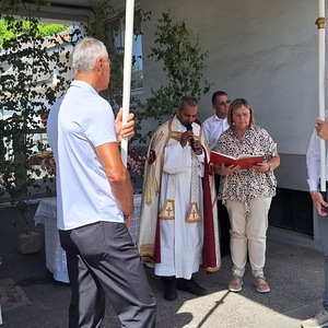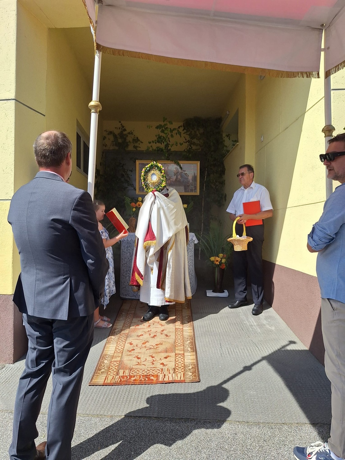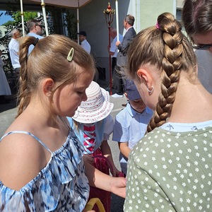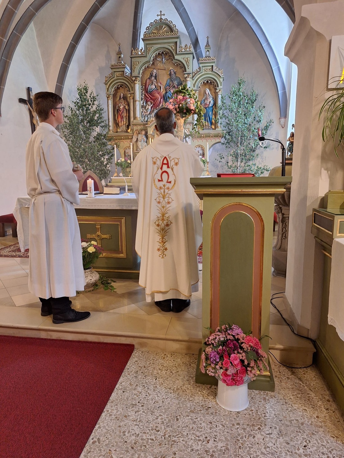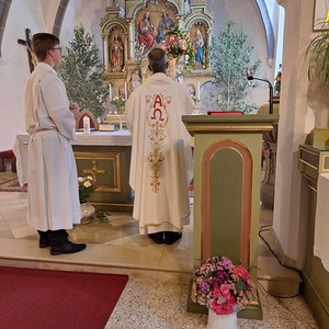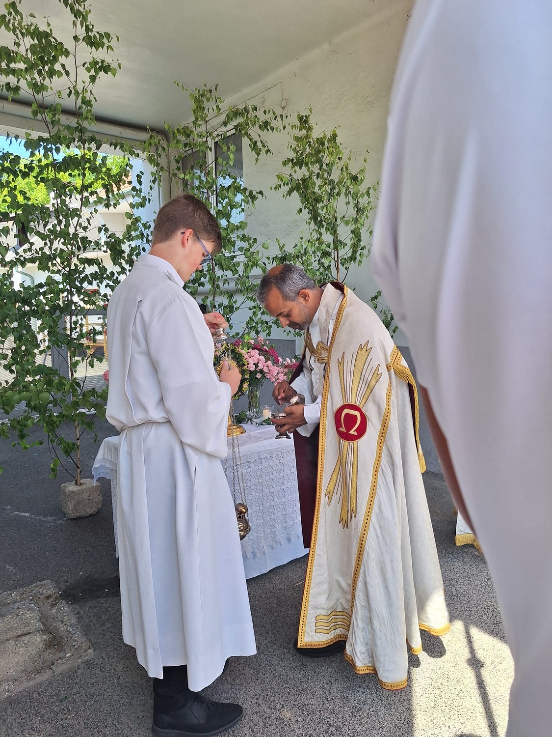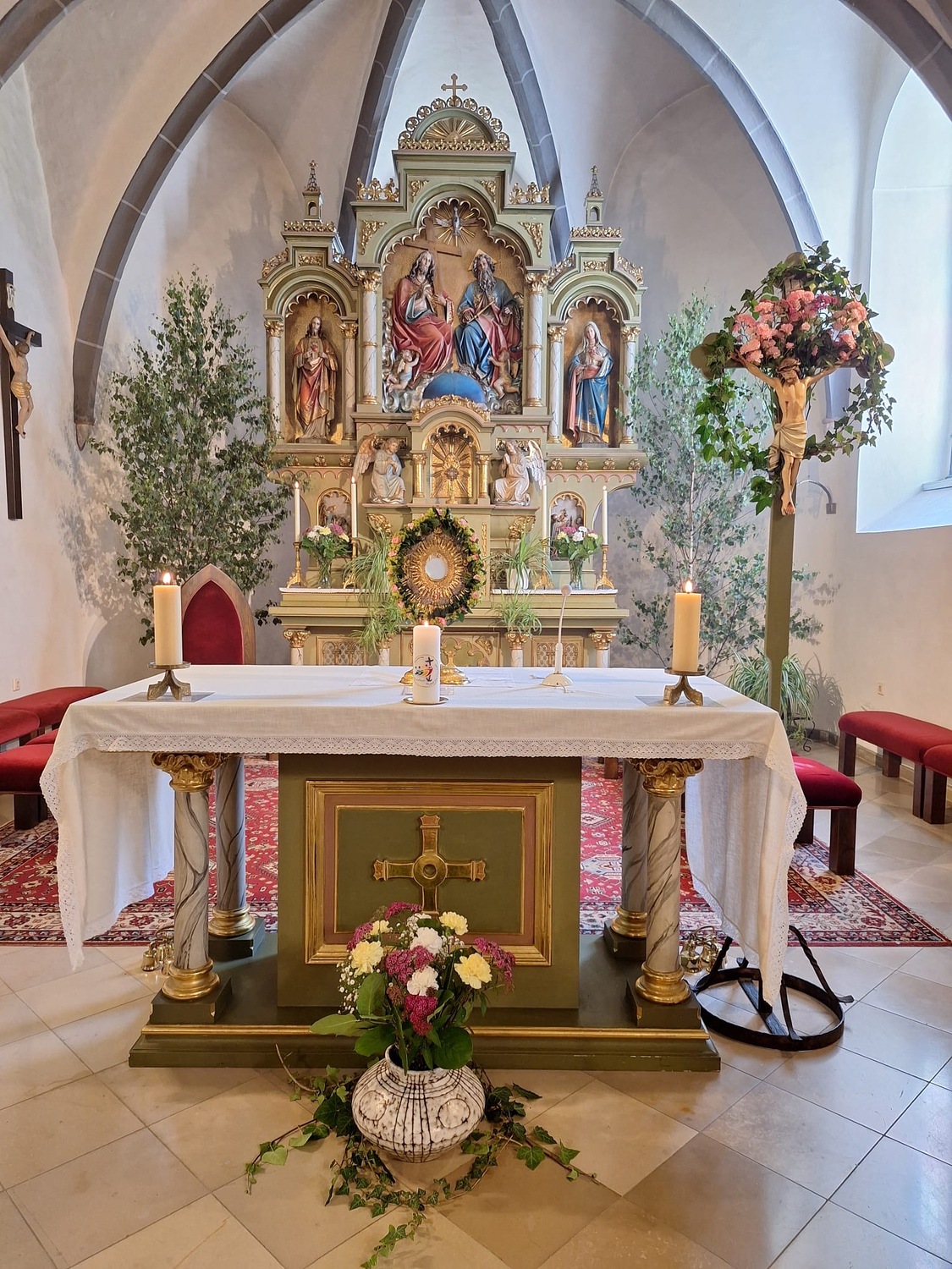 Im Anschluss an die Messe zog die Gemeinde in einer feierlichen Prozession mit dem Allerheiligsten durch die Straßen unseres Ortes. Der Weg führte zu vier festlich geschmückten Altären, die von engagierten Gemeindemitgliedern liebevoll vorbereitet worden waren. An jedem Altar wurde das Evangelium verkündet, Fürbitten gehalten und der sakramentale Segen gespendet.