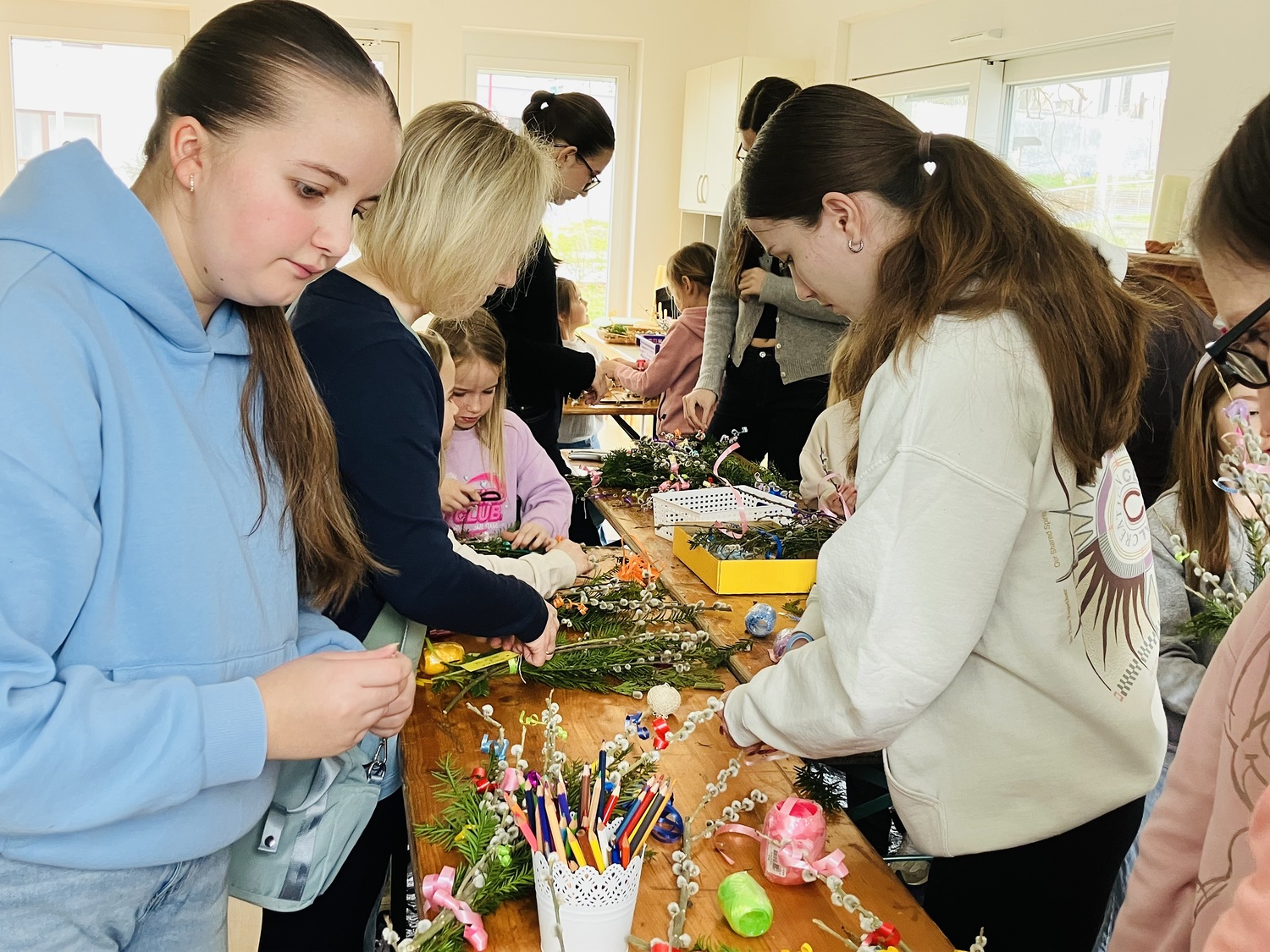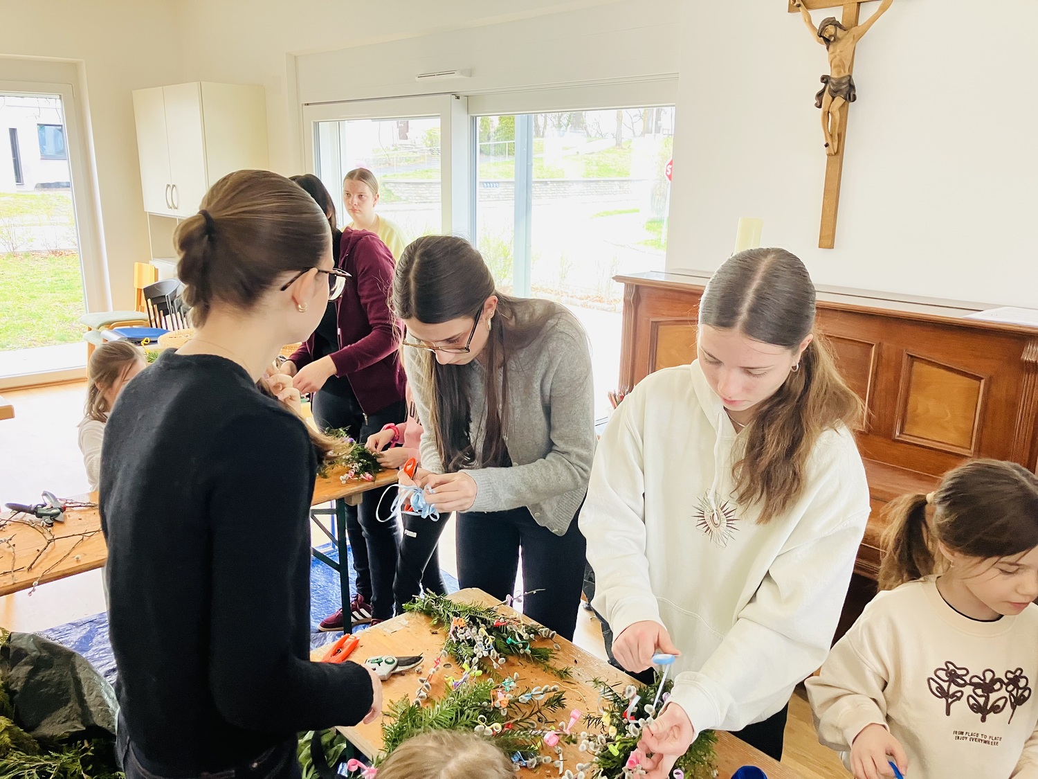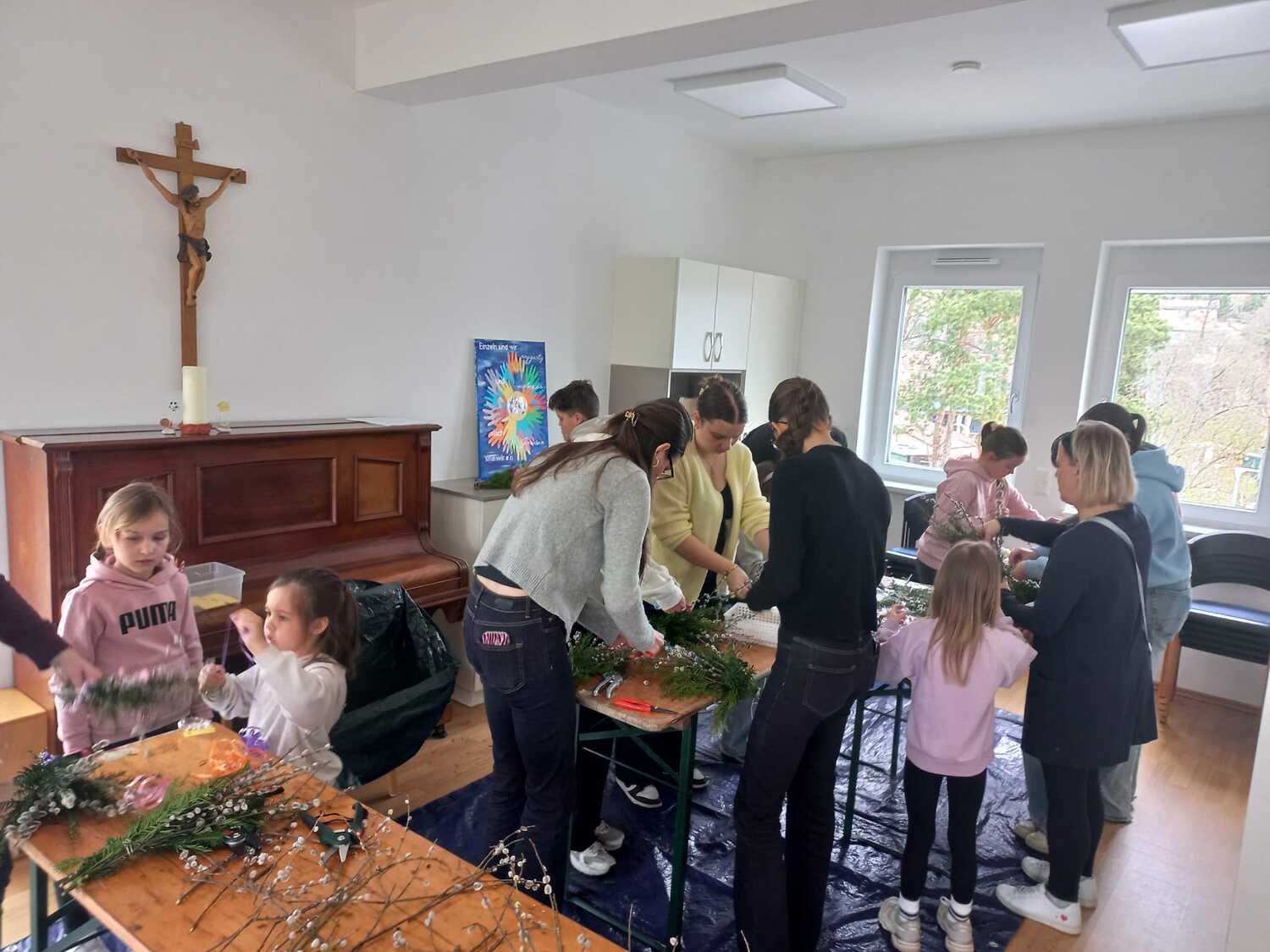 In fröhlicher Atmosphäre kamen Kinder und Jugendliche im Pfarrheim Weppersdorf zusammen, unterstützt von ihrer Jungscharleiterin und einigen Eltern, um Palmbuschen für den Palmsonntag zu gestalten.