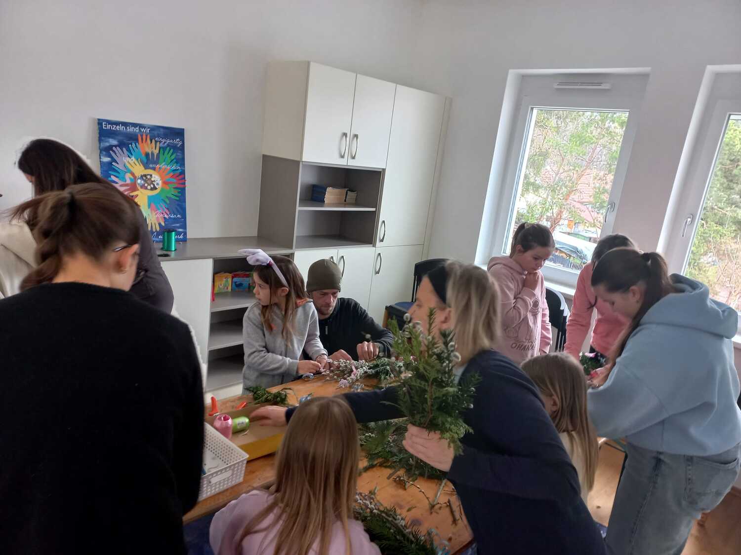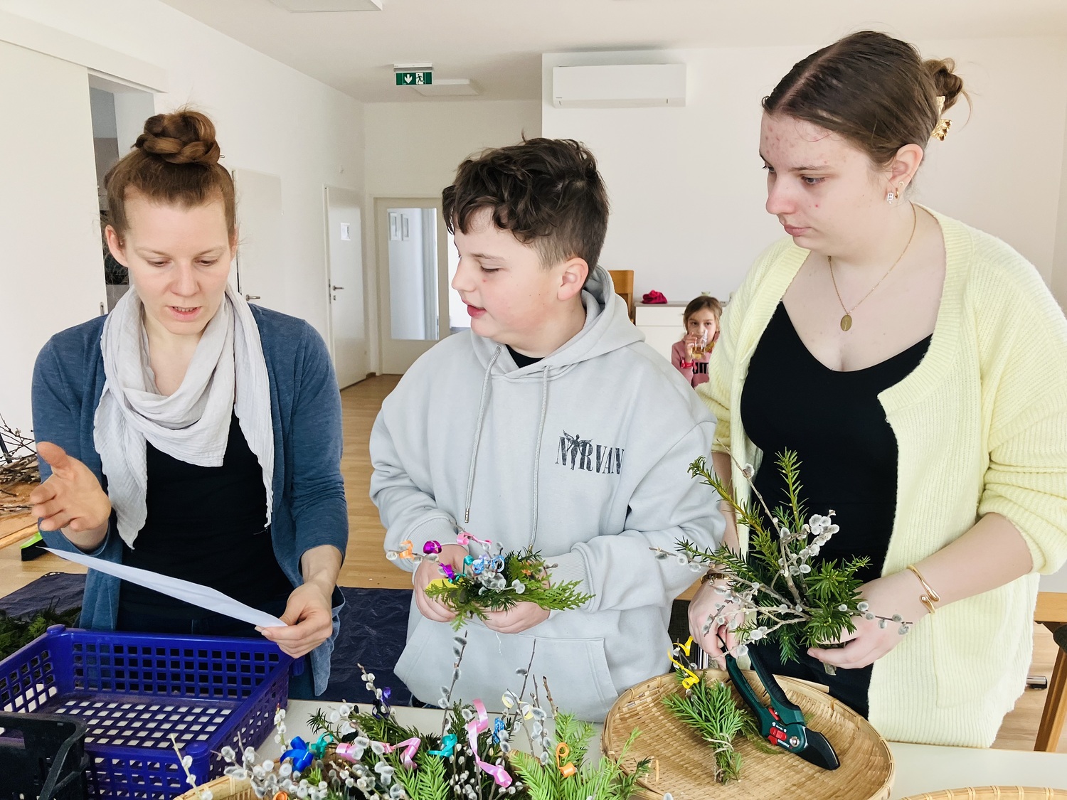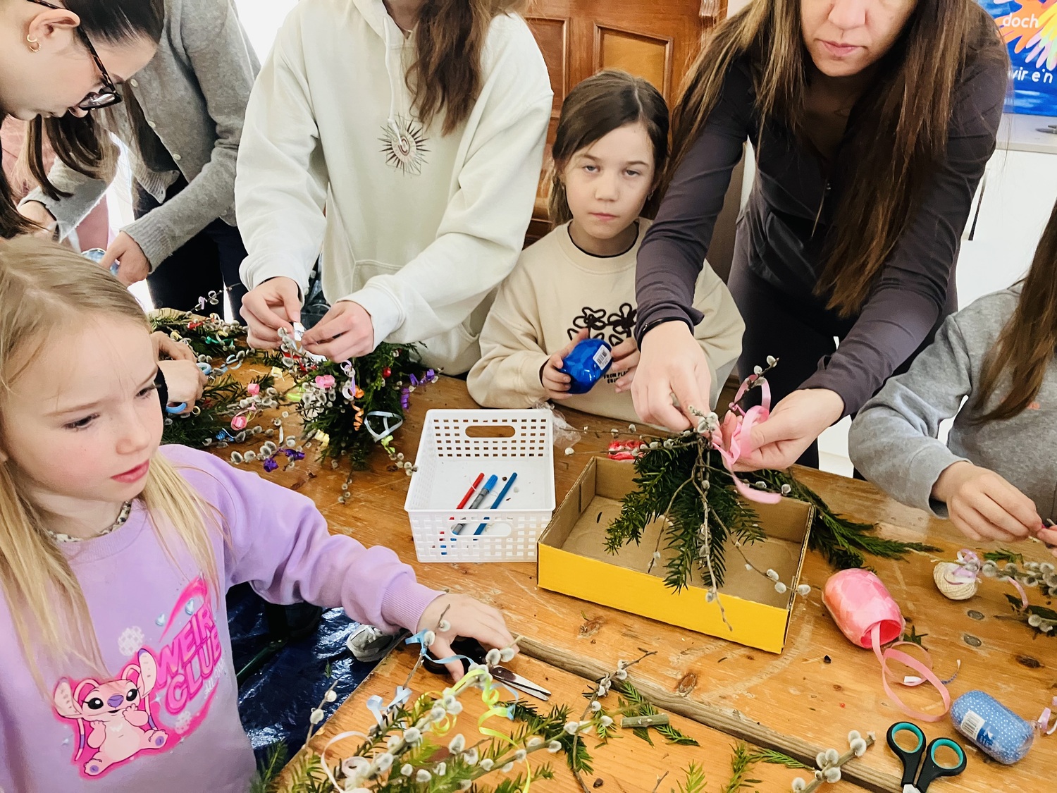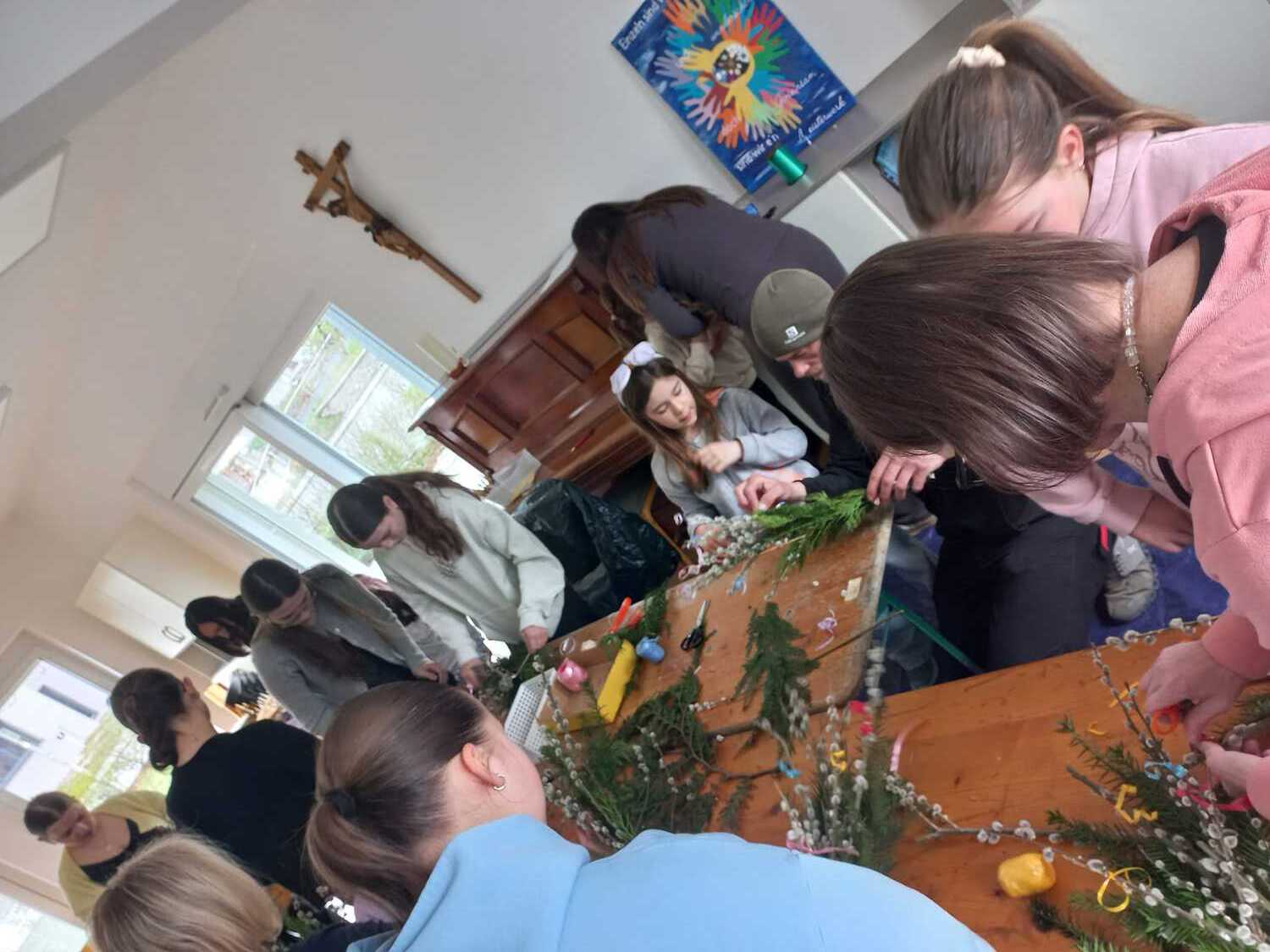 In fröhlicher Atmosphäre kamen Kinder und Jugendliche im Pfarrheim Weppersdorf zusammen, unterstützt von ihrer Jungscharleiterin und einigen Eltern, um Palmbuschen für den Palmsonntag zu gestalten.