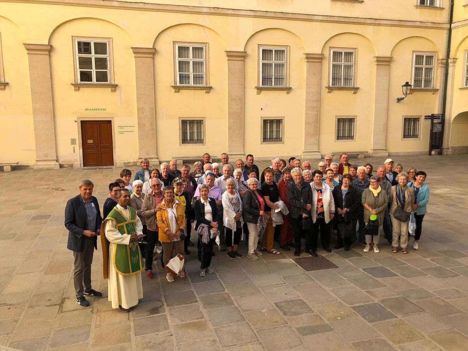 Der erste gemeinsame Ausflug des Pfarrverbandes Hl. Nikolaus führte uns am 11. September 2021 nach Wien. Ein bis auf den letzten Platz gefüllter Autobus brachte uns direkt zur Hofburg, wo zuerst einmal in der dortigen Kapelle der Tag mit einer Hl. Messe mit Pfarrer Shinto begonnen hat. Anschließend genoss die Gruppe eine exzellente Führung durch die Hofburg, bei der die Prunkräume, die Silberkammer und die Schatzkammer besichtigt wurden.