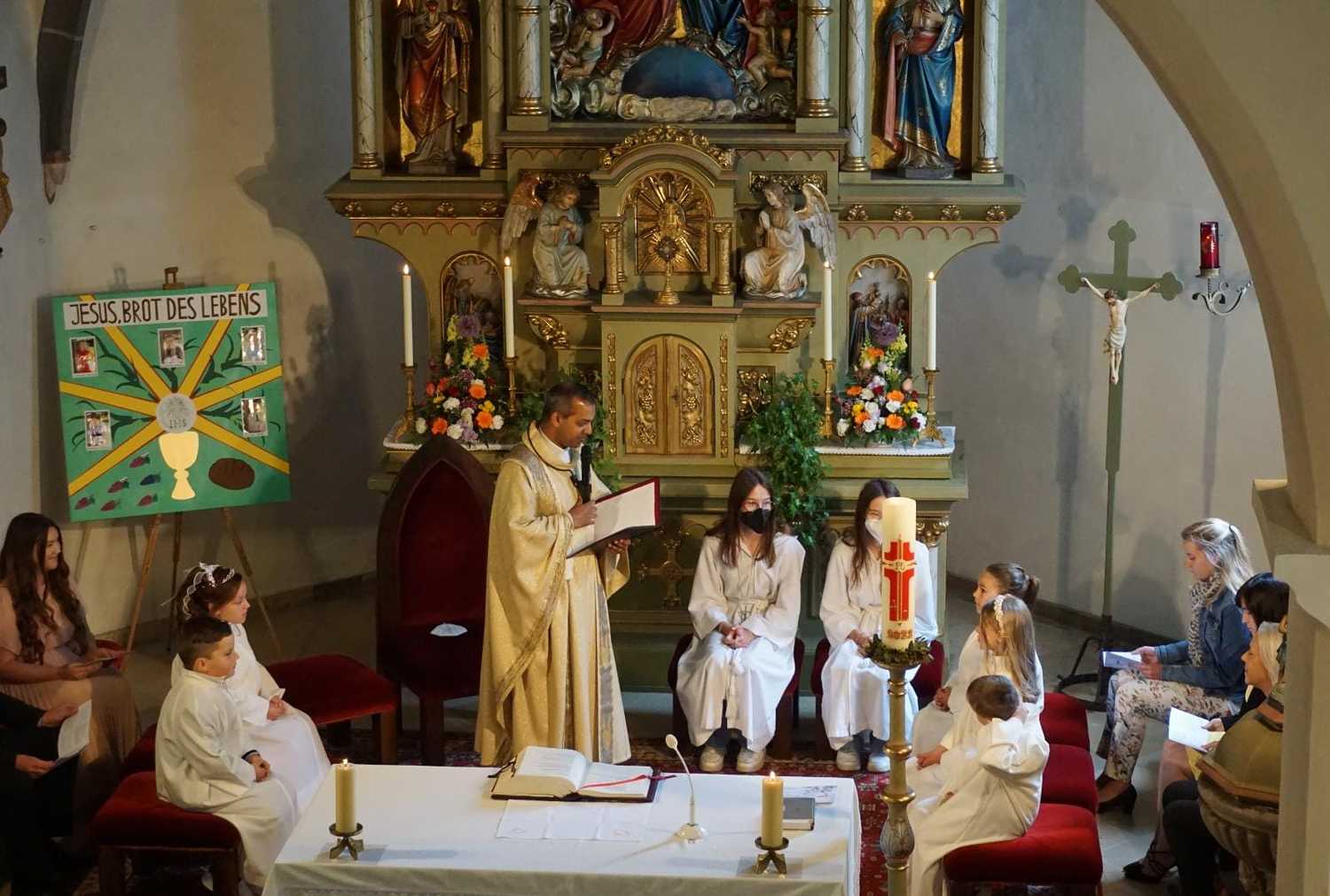 Jesus sagt: „Ich bin das Brot des Lebens!“ Er kommt in diesem Stückchen Brot zu uns und will uns nach seinem Vorbild zum Guten verwandeln. Er will durch den wiederholten Empfang der Kommunion Maximillian, Raphael, Fabienne, Caroline und Niklas nahe sein. Jesus wird dadurch ein Freund und Begleiter durchs Leben sein.