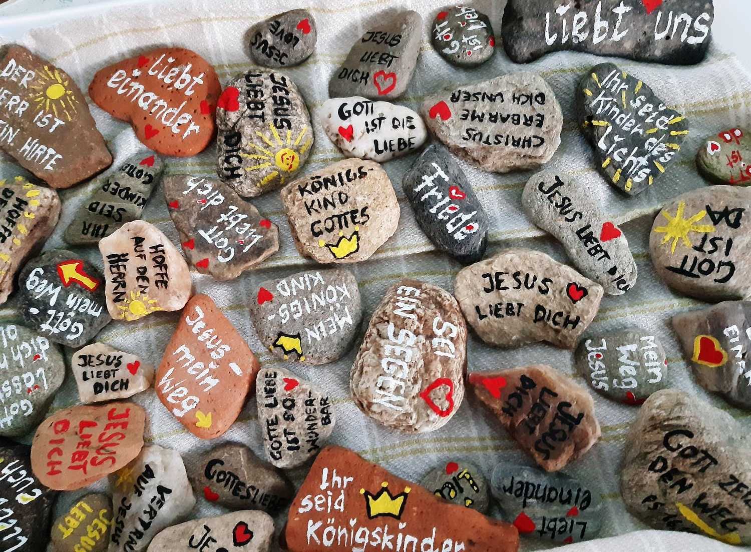 Jungscharleiterin Katja bereitete bunt bemalte Steine mit einer Botschaft vor, die die Kirchenbesucher mitnehmen durften, und diese in den kommenden Tagen und Wochen bei ihrem Urlaub, Reise, Ausflug an einen öffentlichen Ort legen sollen – dorthin, wo man denkt, dass sich jemand freut, von Gott und Jesus zu hören. Wir alle haben ja den Auftrag von Jesus erhalten, überall von Gott zu erzählen. Dieser Stein soll ein Symbol und Sprachrohr für uns sein.