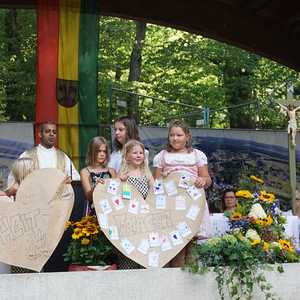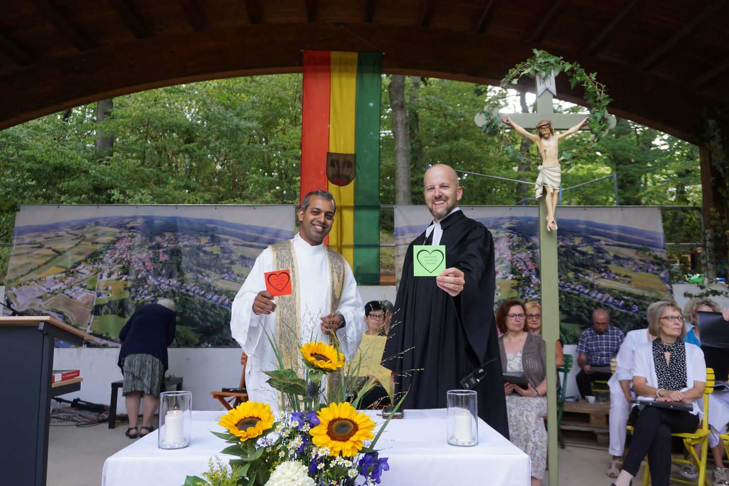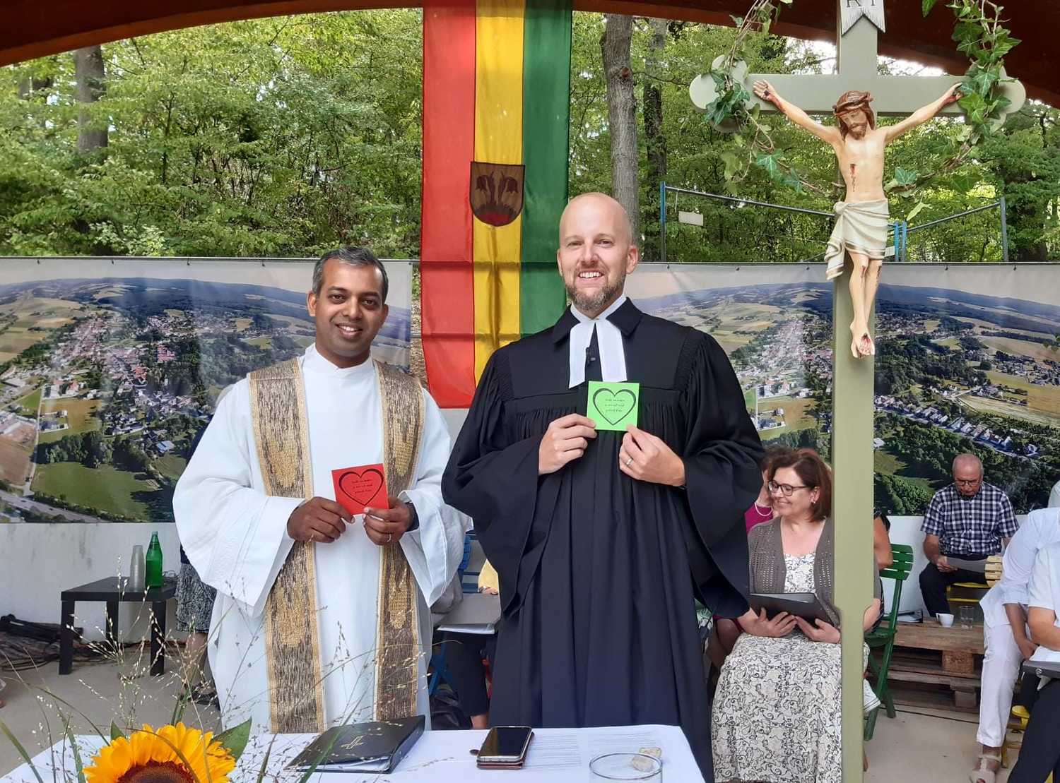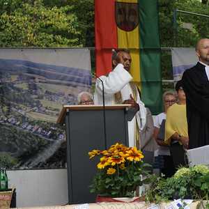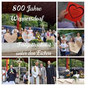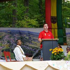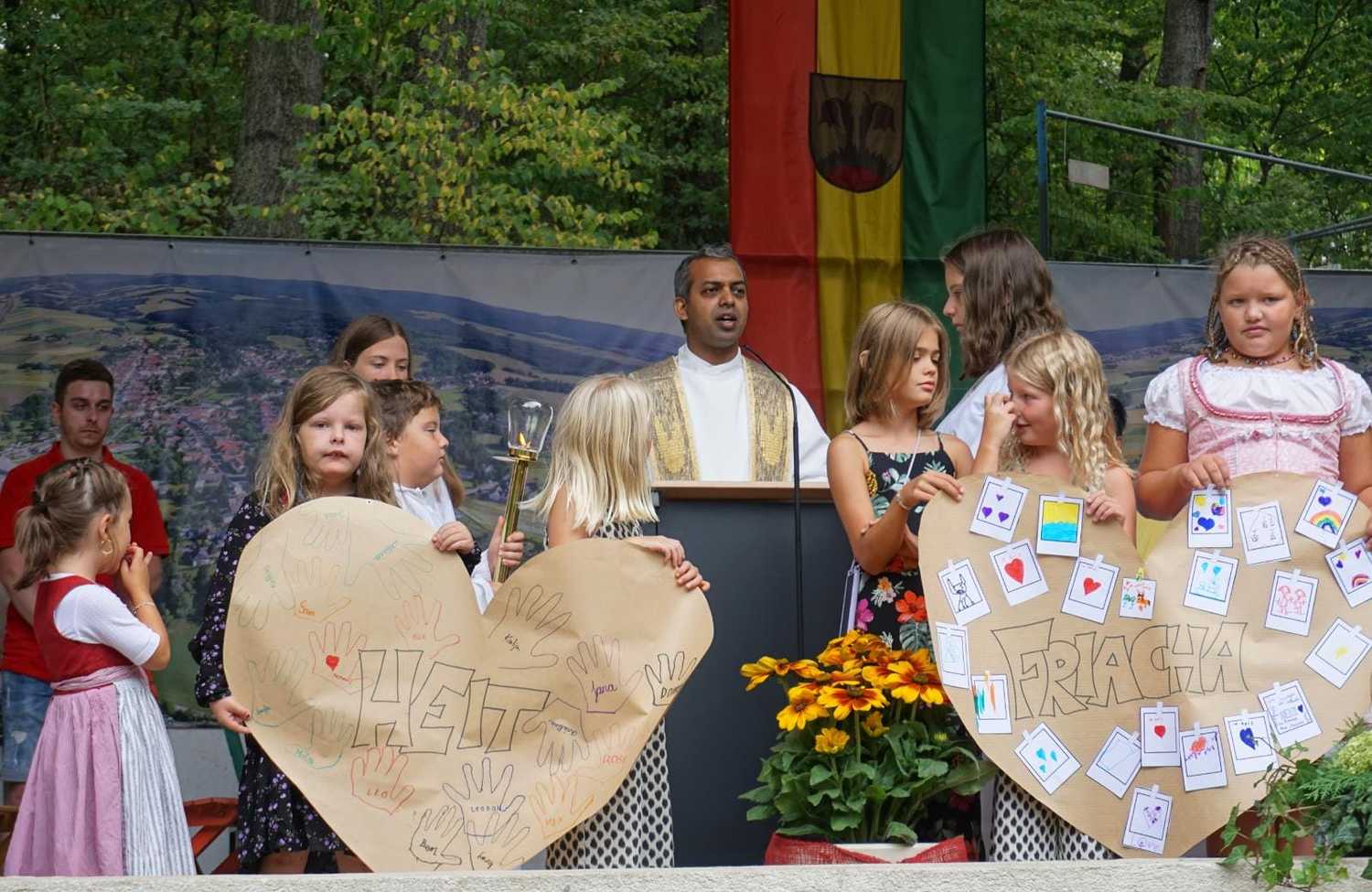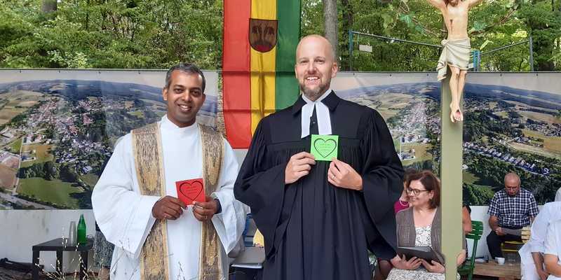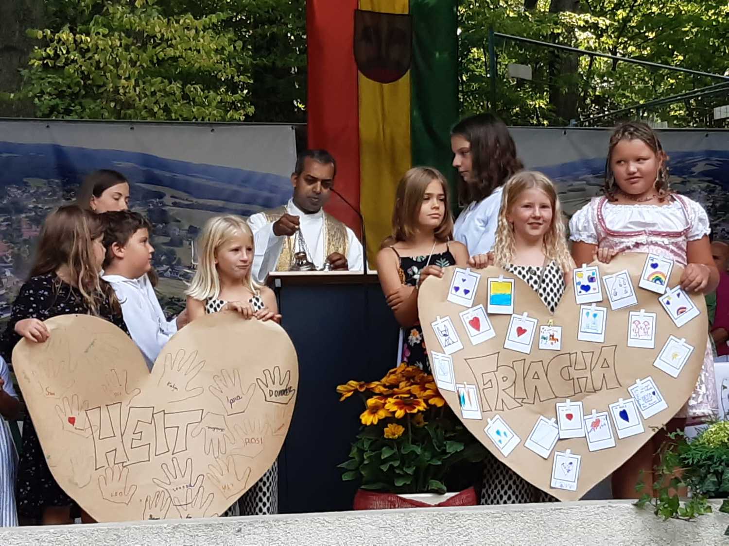 Die 800-Jahr-Feier, die am 14. August begangen wurde, war ein gelungenes Fest, zeigte sich doch das Wetter von seiner besten Seite. Begonnen wurde der Tag mit einem ökumenischen Festgottesdienst mit Hr. Pfarrer Stefan Grauwald und unserem Hr. Pfarrer Shinto Michael. Mitgestaltet wurde die Feier von den Kindern, die außerhalb der Kirche einen Kinderwortgottesdienst feierten und dann mit ihren selbstgestalteten Herzplakaten dazu kamen. Als kleine Erinnerung verteilten die Kinder am Ende des Festes selbstgebastelte Herzen mit dem Bibelspruch zum heutigen Evangelium Joh. 15,12: "Liebt einander, so wie ich euch geliebt habe."