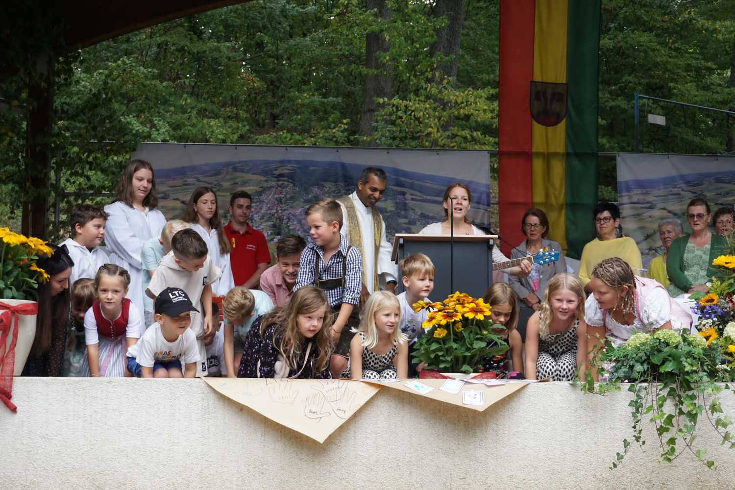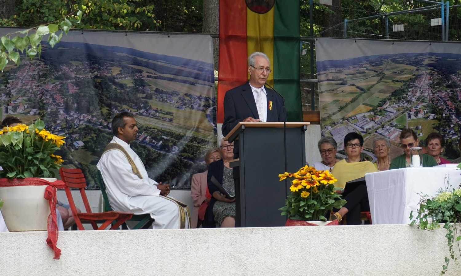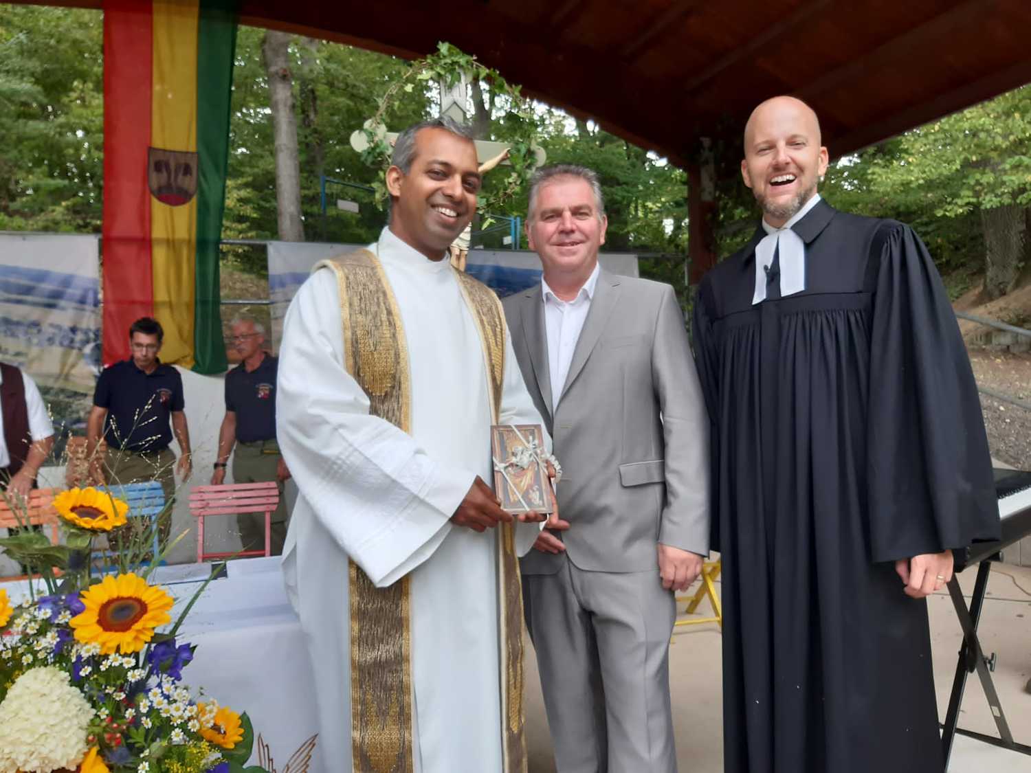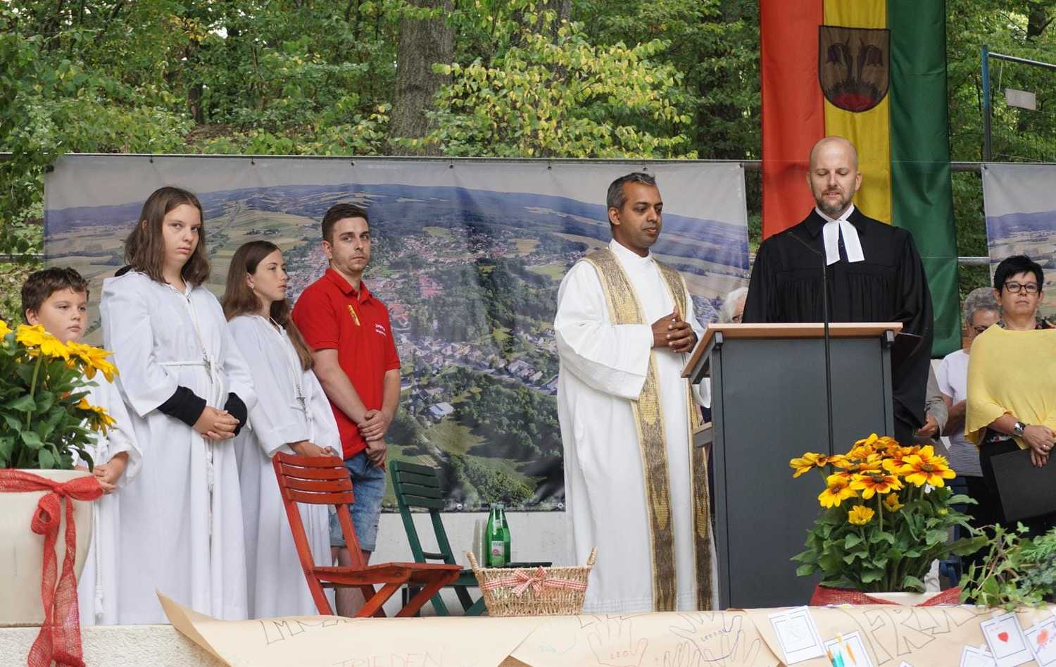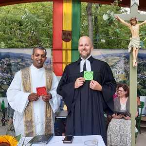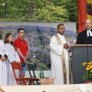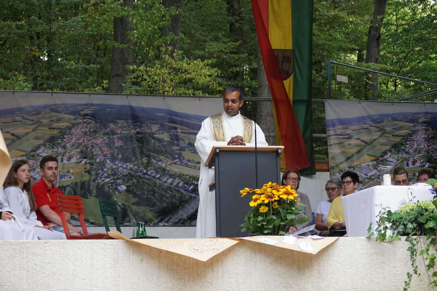 Die 800-Jahr-Feier, die am 14. August begangen wurde, war ein gelungenes Fest, zeigte sich doch das Wetter von seiner besten Seite. Begonnen wurde der Tag mit einem ökumenischen Festgottesdienst mit Hr. Pfarrer Stefan Grauwald und unserem Hr. Pfarrer Shinto Michael. Mitgestaltet wurde die Feier von den Kindern, die außerhalb der Kirche einen Kinderwortgottesdienst feierten und dann mit ihren selbstgestalteten Herzplakaten dazu kamen. Als kleine Erinnerung verteilten die Kinder am Ende des Festes selbstgebastelte Herzen mit dem Bibelspruch zum heutigen Evangelium Joh. 15,12: "Liebt einander, so wie ich euch geliebt habe."