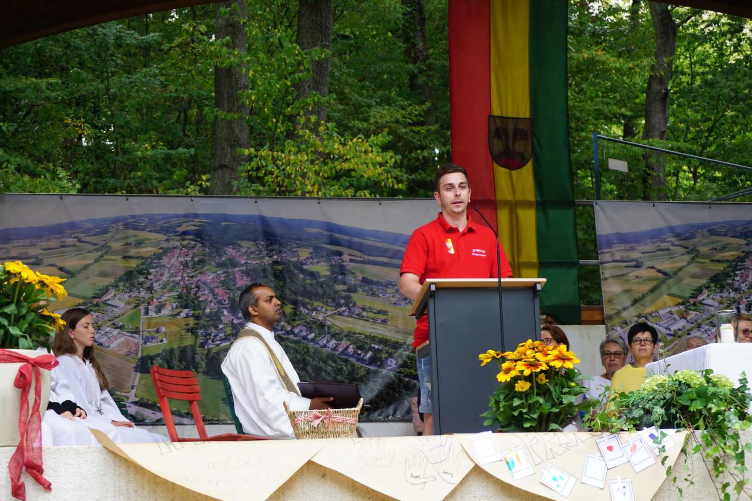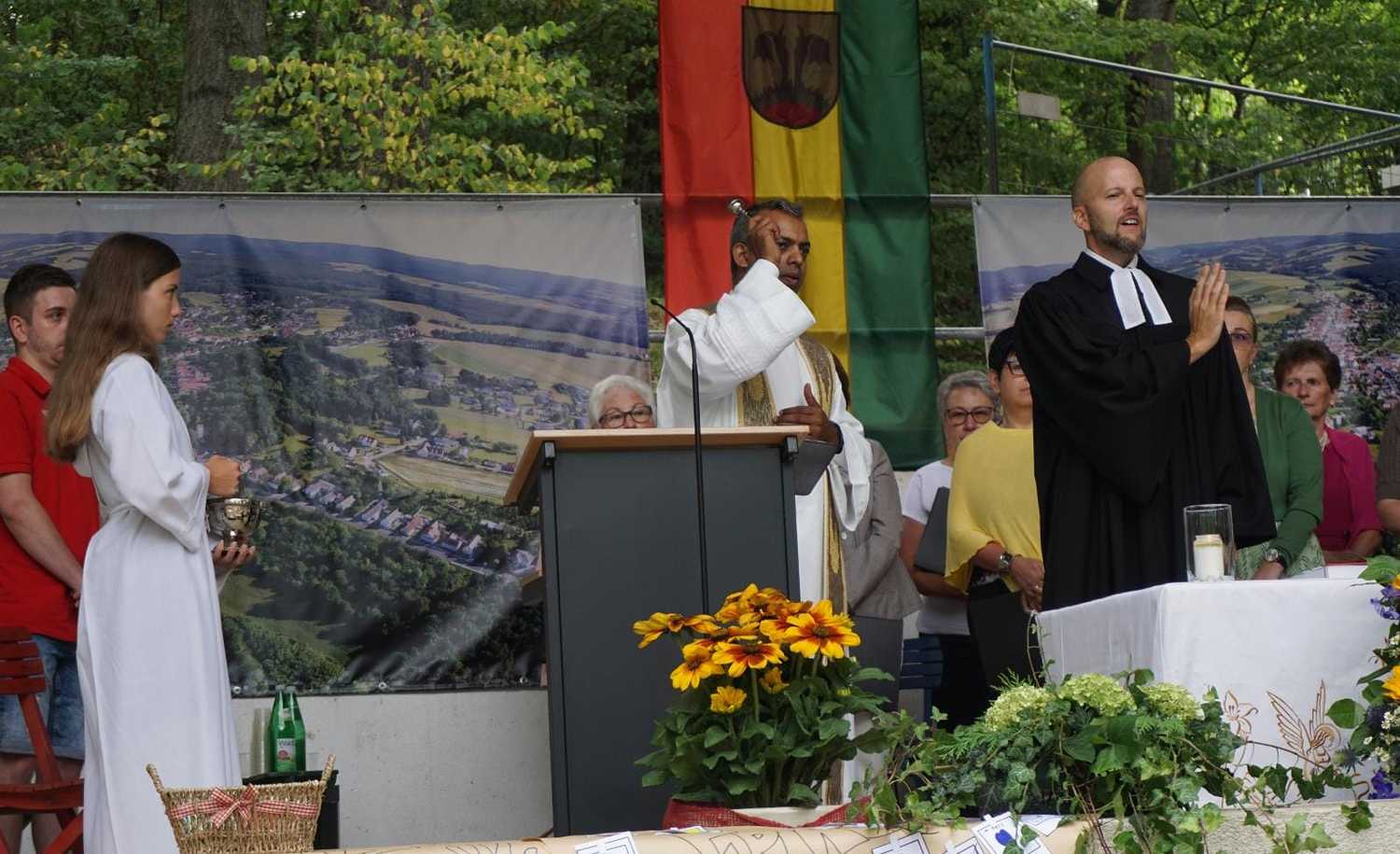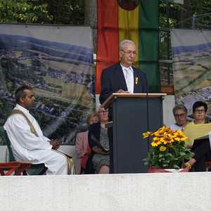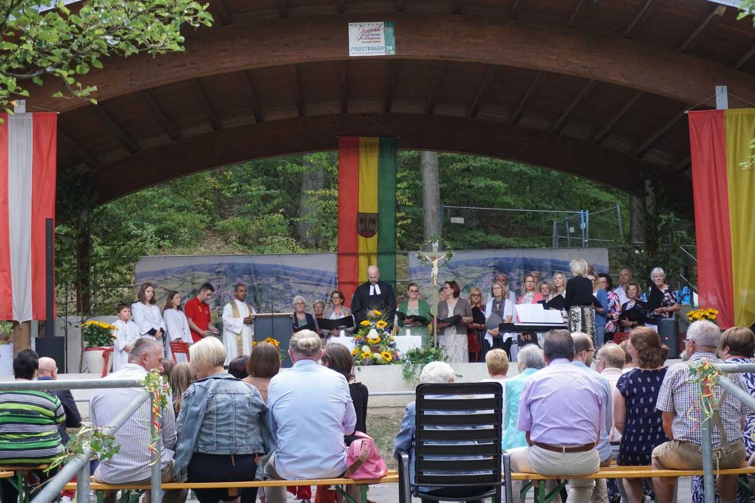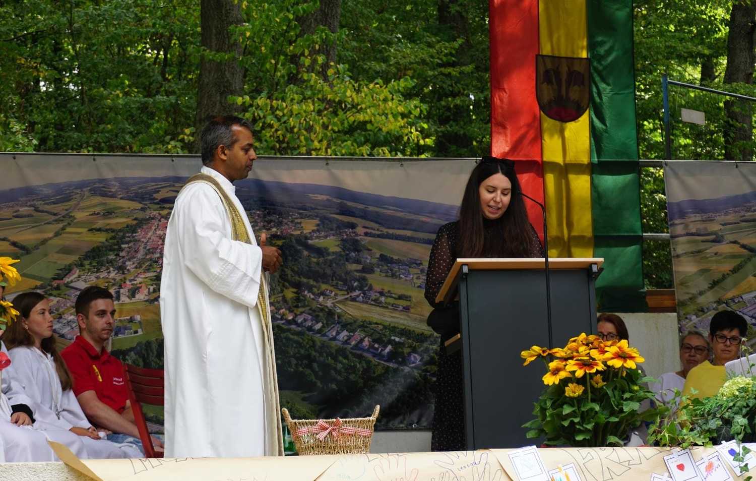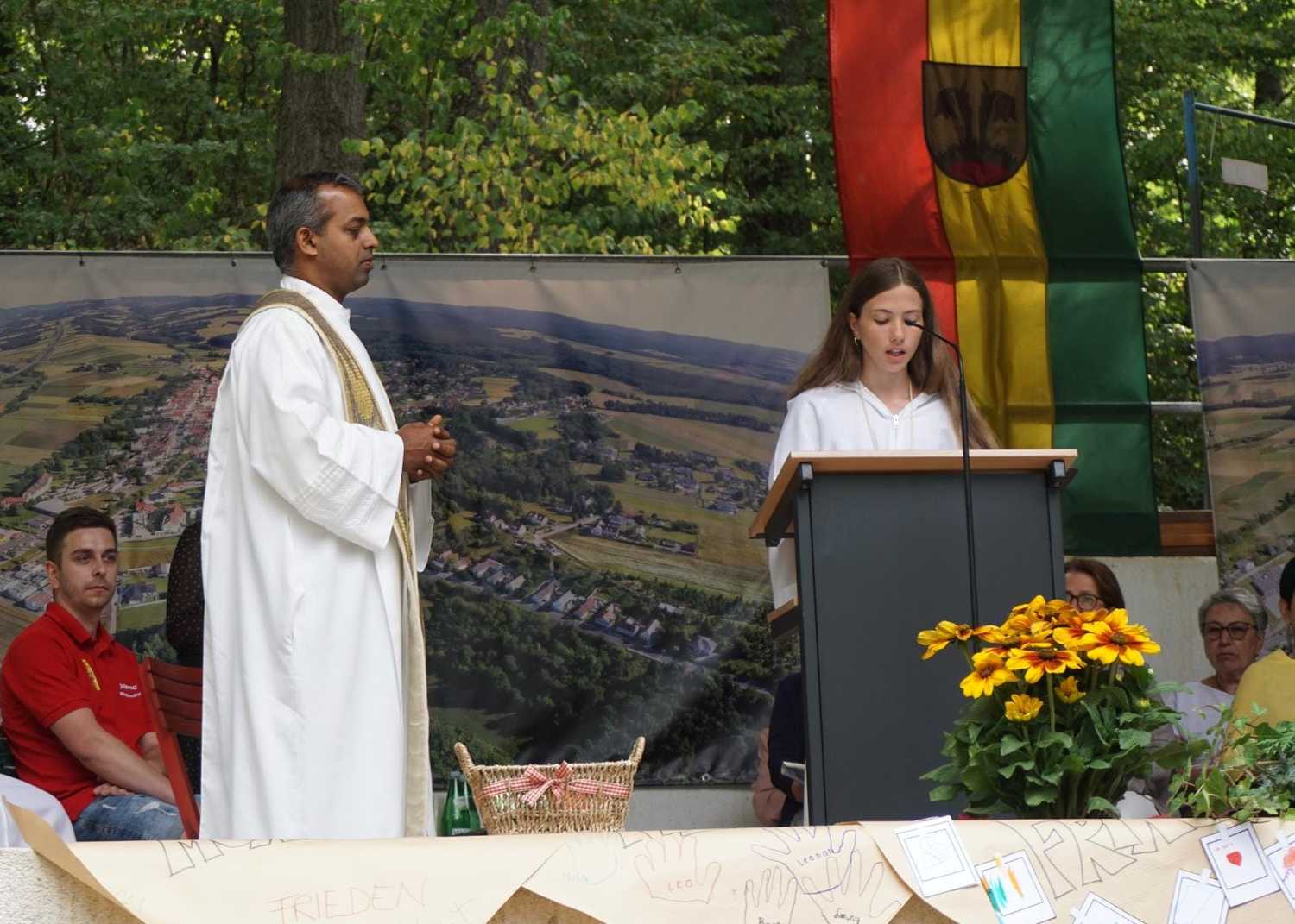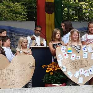 Die 800-Jahr-Feier, die am 14. August begangen wurde, war ein gelungenes Fest, zeigte sich doch das Wetter von seiner besten Seite. Begonnen wurde der Tag mit einem ökumenischen Festgottesdienst mit Hr. Pfarrer Stefan Grauwald und unserem Hr. Pfarrer Shinto Michael. Mitgestaltet wurde die Feier von den Kindern, die außerhalb der Kirche einen Kinderwortgottesdienst feierten und dann mit ihren selbstgestalteten Herzplakaten dazu kamen. Als kleine Erinnerung verteilten die Kinder am Ende des Festes selbstgebastelte Herzen mit dem Bibelspruch zum heutigen Evangelium Joh. 15,12: "Liebt einander, so wie ich euch geliebt habe."