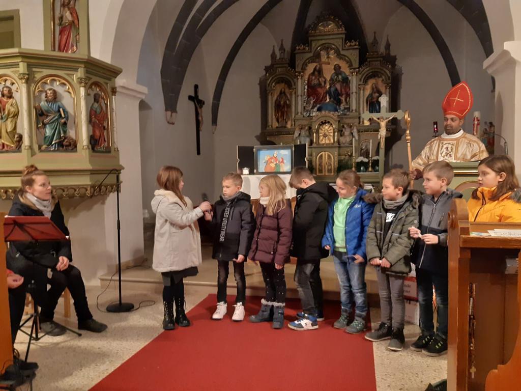 Nach einer kurzen Begrüßung stellten Pfarrer Shinto und Jungscharleiterin Katja den Heiligen Nikolaus vor, in dem sie in Form eines Erzähltheaters eine Geschichte – die Legende der Schiffsrettung - erzählten und anschließend wurde die Kleidung (Bischofsmantel, Mitra, Zingulum, Brustkreuz und Bischofsstab) des Hl. Nikolaus den Kindern erklärt.