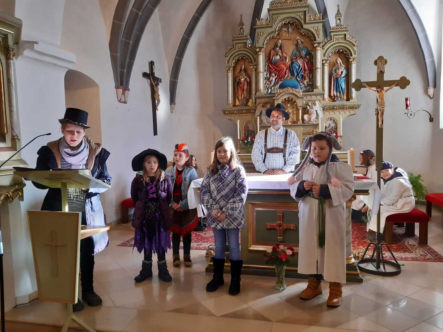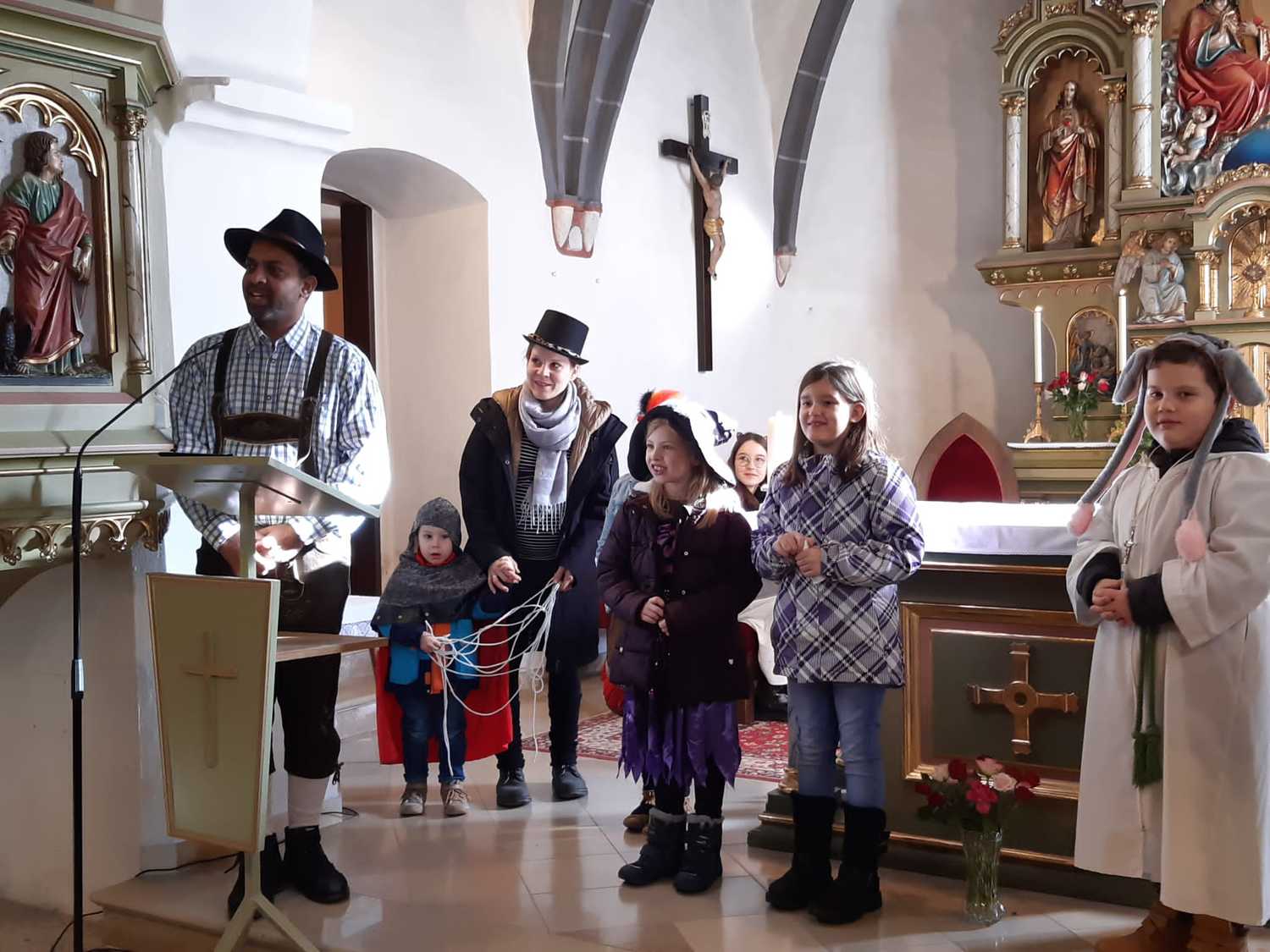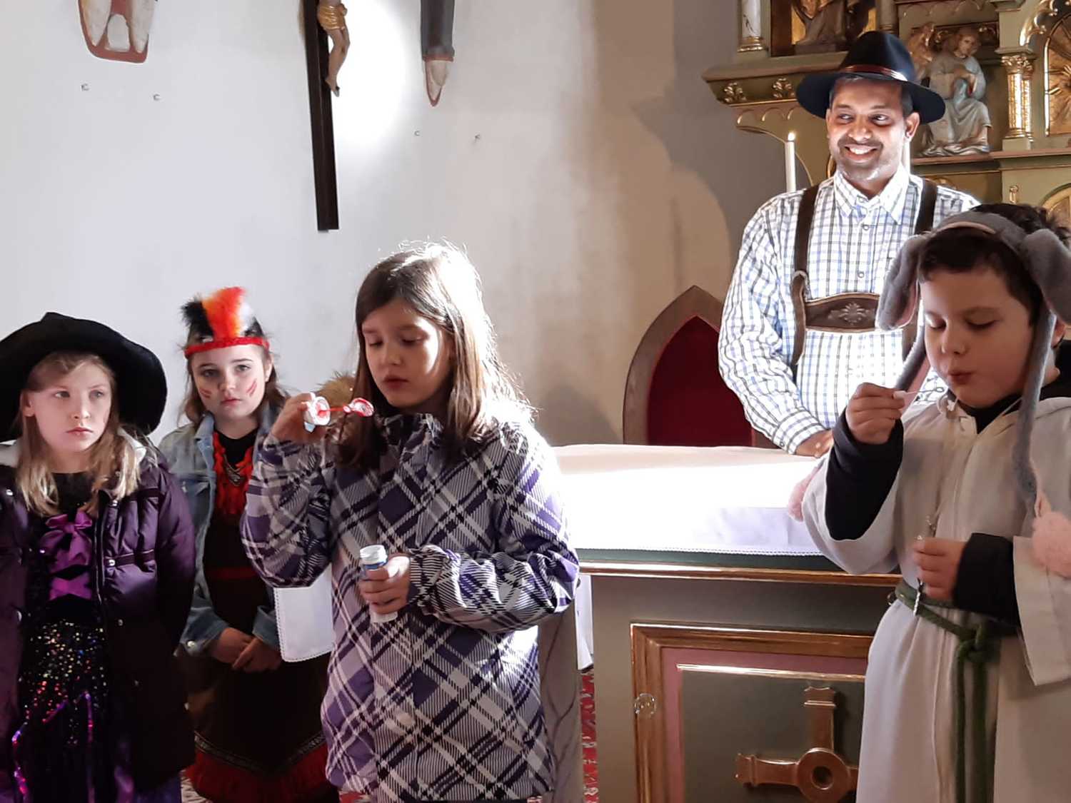 Viele Kinder und auch einige Erwachsenen kamen in ihren lustigen Kostümen um gemeinsam Eucharistie zu feiern. Unser Herr Pfarrer Shinto, der als „Steirerbua“ in Lederhose zum Gottesdienst kam, erzählte uns anstatt der Predigt die Legende vom betenden Gaukler, der er uns gezeigt hat, wie er sein Herz in sein Gebet legte. Seine Art Gott zu loben, danken und ehren sollte für uns alle ein Beispiel sein.